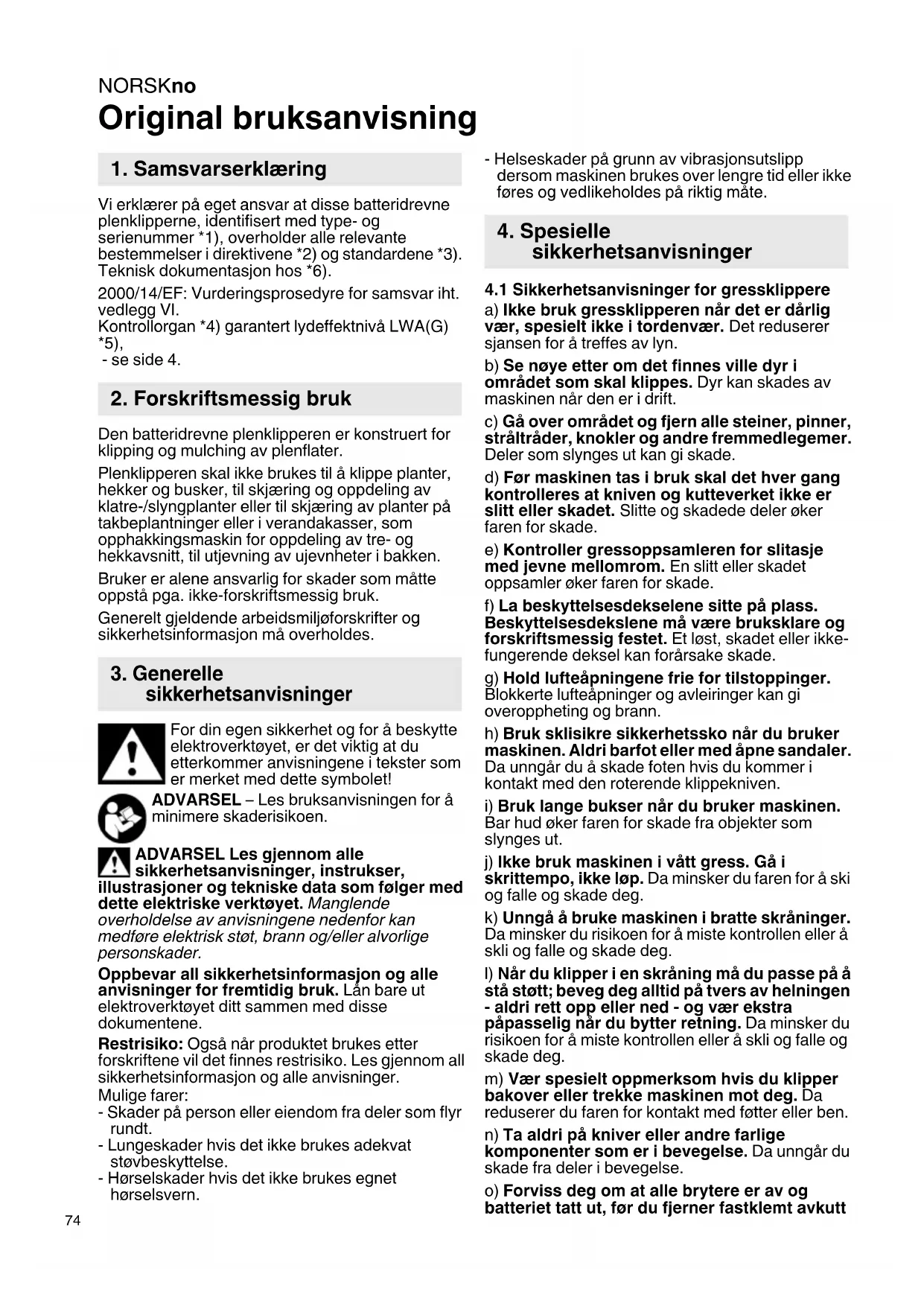 Original bruksanvisning Vi erklærer på eget ansvar at disse batteridrevne plenklipperne, identifisert med type- og serienummer *1), overholder alle relevante bestemmelser i direktivene *2) og standardene *3). Teknisk dokumentasjon hos *6). 2000/14/EF: Vurderingsprosedyre for samsvar iht. vedlegg VI. Kontrollorgan *4) garantert lydeffektnivå LWA(G) *5), - se side 4. Den batteridrevne plenklipperen er konstruert for klipping og mulching av plenflater. Plenklipperen skal ikke brukes til å klippe planter, hekker og busker, til skjæring og oppdeling av klatre-/slyngplanter eller til skjæring av planter på takbeplantninger eller i verandakasser, som opphakkingsmaskin for oppdeling av tre- og hekkavsnitt, til utjevning av ujevnheter i bakken. Bruker er alene ansvarlig for skader som måtte oppstå pga. ikke-forskriftsmessig bruk. Generelt gjeldende arbeidsmiljøforskrifter og sikkerhetsinformasjon må overholdes. For din egen sikkerhet og for å beskytte elektroverktøyet, er det viktig at du etterkommer anvisningene i tekster som er merket med dette symbolet! ADVARSEL – Les bruksanvisningen for å minimere skaderisikoen. ADVARSEL Les gjennom alle sikkerhetsanvisninger, instrukser, illustrasjoner og tekniske data som følger med dette elektriske verktøyet. Manglende overholdelse av anvisningene nedenfor kan medføre elektrisk støt, brann og/eller alvorlige personskader. Oppbevar all sikkerhetsinformasjon og alle anvisninger for fremtidig bruk. Lån bare ut elektroverktøyet ditt sammen med disse dokumentene. Restrisiko: Også når produktet brukes etter forskriftene vil det finnes restrisiko. Les gjennom all sikkerhetsinformasjon og alle anvisninger. Mulige farer: - Skader på person eller eiendom fra deler som flyr rundt. - Lungeskader hvis det ikke brukes adekvat støvbeskyttelse. - Hørselskader hvis det ikke brukes egnet hørselsvern. - Helseskader på grunn av vibrasjonsutslipp dersom maskinen brukes over lengre tid eller ikke føres og vedlikeholdes på riktig måte.