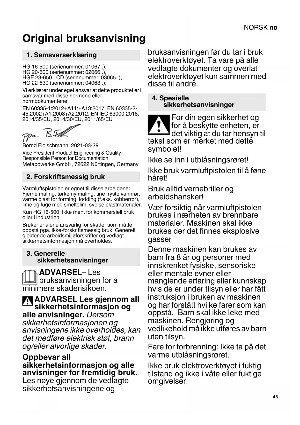 Original bruksanvisning HG 16-500 (serienummer: 01067..), HG 20-600 (serienummer: 02066..), HGE 23-650 LCD (serienummer: 03065..), HG 22-630 (serienummer: 04063..), Vi erklærer under eget ansvar at dette produktet er i samsvar med disse normene eller normdokumentene: EN 60335-1:2012+A11:+A13:2017, EN 60335-2- 45:2002+A1:2008+A2:2012, EN IEC 63000:2018, 2014/35/EU, 2014/30/EU, 2011/65/EU Bernd Fleischmann, 2021-03-29 Vice President Product Engineering & Quality Responsible Person for Documentation Metabowerke GmbH, 72622 Nürtingen, Germany Varmluftspistolen er egnet til disse arbeidene: Fjerne maling, tørke ny maling, tine fryste vannrør, varme plast før forming, lodding (f.eks. kobberrør), lime og fuge med smeltelim, sveise plastmaterialer. Kun HG 16-500: Ikke ment for kommersiell bruk eller i industrien. Bruker er alene ansvarlig for skader som måtte oppstå pga. ikke-forskriftsmessig bruk. Generelt gjeldende arbeidsmiljøforskrifter og vedlagt sikkerhetsinformasjon må overholdes. ADVARSEL– Les bruksanvisningen for å minimere skaderisikoen. ADVARSEL Les gjennom all sikkerhetsinformasjon og alle anvisninger. Dersom sikkerhetsinformasjonen og anvisningene ikke overholdes, kan det medføre elektrisk støt, brann og/eller alvorlige skader. Oppbevar all sikkerhetsinformasjon og alle anvisninger for fremtidig bruk. Les nøye gjennom de vedlagte sikkerhetsanvisningene og bruksanvisningen før du tar i bruk elektroverktøyet. Ta vare på alle vedlagte dokumenter og overlat elektroverktøyet kun sammen med disse til andre. For din egen sikkerhet og for å beskytte enheten, er det viktig at du tar hensyn til tekst som er merket med dette symbolet! Ikke se inn i utblåsningsrøret! Ikke bruk varmluftpistolen til å føne håret! Bruk alltid vernebriller og arbeidshansker! Vær forsiktig når varmluftpistolen brukes i nærheten av brennbare materialer. Maskinen skal ikke brukes der det finnes eksplosive gasser Denne maskinen kan brukes av barn fra 8 år og personer med innskrenket fysiske, sensoriske eller mentale evner eller manglende erfaring eller kunnskap hvis de er under tilsyn eller har fått instruksjon i bruken av maskinen og har forstått hvilke farer som kan oppstå. Barn skal ikke leke med maskinen. Rengjøring og vedlikehold må ikke utføres av barn uten tilsyn. Fare for forbrenning: Ikke ta på det varme utblåsningsrøret. Ikke bruk elektroverktøyet i fuktig tilstand og ikke i våte eller fuktige omgivelser.