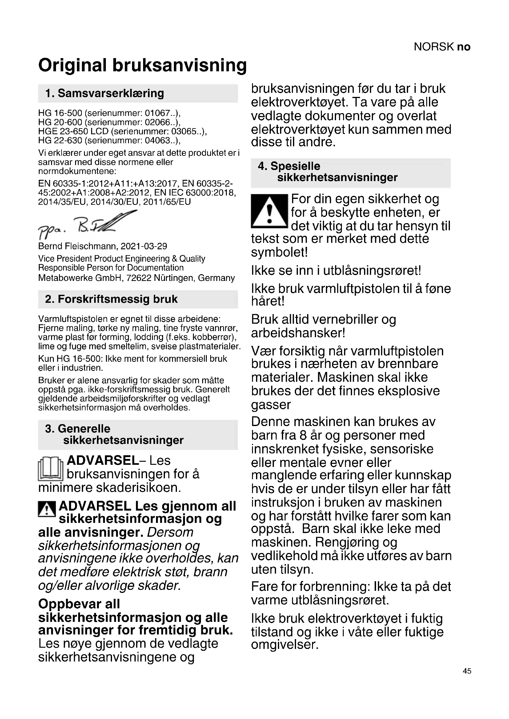 Original bruksanvisning HG 16-500 (serienummer: 01067..), HG 20-600 (serienummer: 02066..), HGE 23-650 LCD (serienummer: 03065..), HG 22-630 (serienummer: 04063..), Vi erklærer under eget ansvar at dette produktet er i samsvar med disse normene eller normdokumentene: EN 60335-1:2012+A11:+A13:2017, EN 60335-2- 45:2002+A1:2008+A2:2012, EN IEC 63000:2018, 2014/35/EU, 2014/30/EU, 2011/65/EU Bernd Fleischmann, 2021-03-29 Vice President Product Engineering & Quality Responsible Person for Documentation Metabowerke GmbH, 72622 Nürtingen, Germany Varmluftspistolen er egnet til disse arbeidene: Fjerne maling, tørke ny maling, tine fryste vannrør, varme plast før forming, lodding (f.eks. kobberrør), lime og fuge med smeltelim, sveise plastmaterialer. Kun HG 16-500: Ikke ment for kommersiell bruk eller i industrien. Bruker er alene ansvarlig for skader som måtte oppstå pga. ikke-forskriftsmessig bruk. Generelt gjeldende arbeidsmiljøforskrifter og vedlagt sikkerhetsinformasjon må overholdes. ADVARSEL– Les bruksanvisningen for å minimere skaderisikoen. ADVARSEL Les gjennom all sikkerhetsinformasjon og alle anvisninger. Dersom sikkerhetsinformasjonen og anvisningene ikke overholdes, kan det medføre elektrisk støt, brann og/eller alvorlige skader. Oppbevar all sikkerhetsinformasjon og alle anvisninger for fremtidig bruk. Les nøye gjennom de vedlagte sikkerhetsanvisningene og bruksanvisningen før du tar i bruk elektroverktøyet. Ta vare på alle vedlagte dokumenter og overlat elektroverktøyet kun sammen med disse til andre. For din egen sikkerhet og for å beskytte enheten, er det viktig at du tar hensyn til tekst som er merket med dette symbolet! Ikke se inn i utblåsningsrøret! Ikke bruk varmluftpistolen til å føne håret! Bruk alltid vernebriller og arbeidshansker! Vær forsiktig når varmluftpistolen brukes i nærheten av brennbare materialer. Maskinen skal ikke brukes der det finnes eksplosive gasser Denne maskinen kan brukes av barn fra 8 år og personer med innskrenket fysiske, sensoriske eller mentale evner eller manglende erfaring eller kunnskap hvis de er under tilsyn eller har fått instruksjon i bruken av maskinen og har forstått hvilke farer som kan oppstå. Barn skal ikke leke med maskinen. Rengjøring og vedlikehold må ikke utføres av barn uten tilsyn. Fare for forbrenning: Ikke ta på det varme utblåsningsrøret. Ikke bruk elektroverktøyet i fuktig tilstand og ikke i våte eller fuktige omgivelser.