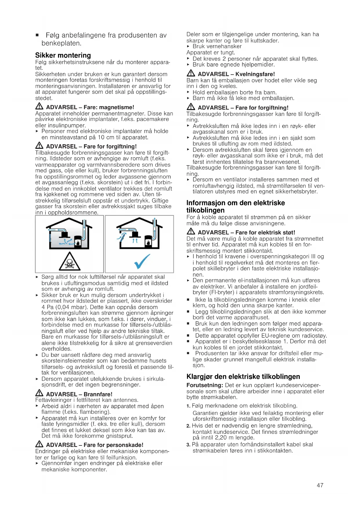 Personer med elektroniske implantater må holde en minsteavstand på 10cm til apparatet. ADVARSEL‒Fare for forgiftning! Tilbakesugde forbrenningsgasser kan føre til forgift- ning. Ildsteder som er avhengige av romluft (f.eks. varmeapparater og varmtvannsberedere som drives med gass, olje eller kull), bruker forbrenningsluften fra oppstillingsrommet og leder avgassene gjennom et avgassanlegg (f.eks. skorstein) ut i det fri. I forbin- delse med en innkoblet ventilator trekkes det romluft fra kjøkkenet og rommene ved siden av. Uten til- strekkelig tilførselsluft oppstår et undertrykk. Giftige gasser fra skorstein eller avtrekkssjakt suges tilbake inn i oppholdsrommene.