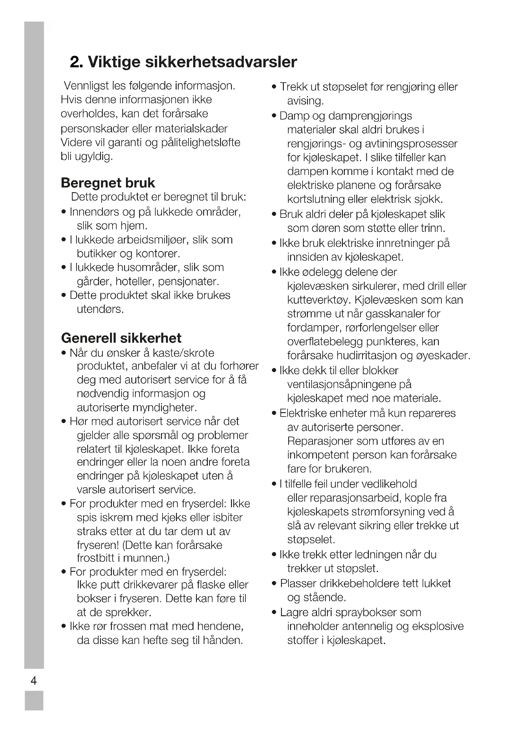 - Dette kjøleskapet er kun beregnet til for å oppbevare mat. Det skal ikke brukes til noen andre formål.