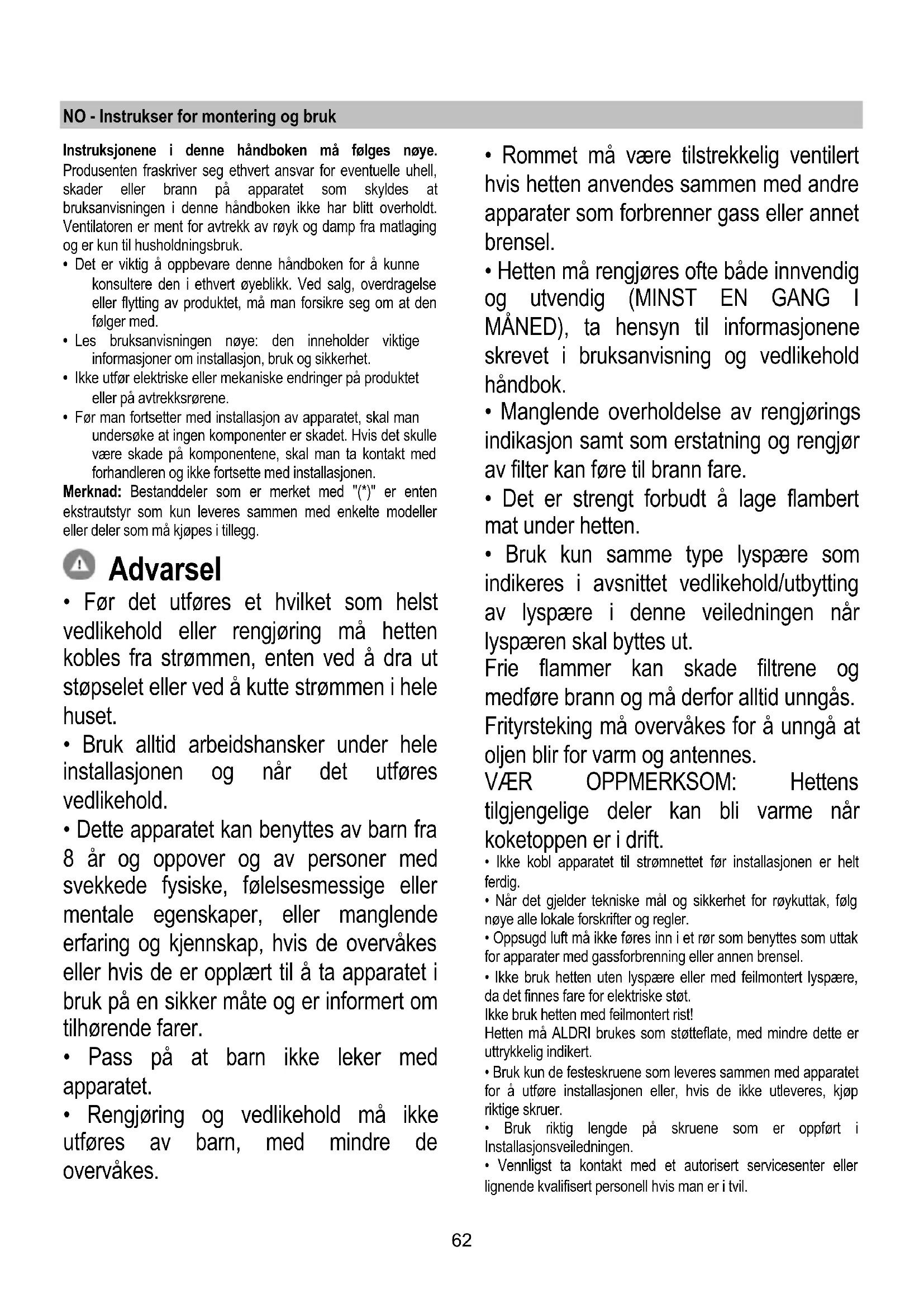 - Ikke bruk hetten uten lyspære eller med feilmontert lyspære, da det finnes fare for elektriske støt. Ikke bruk hetten med feilmontert rist! Hetten må ALDRI brukes som støtteflate, med mindre dette er uttrykkelig indikert.