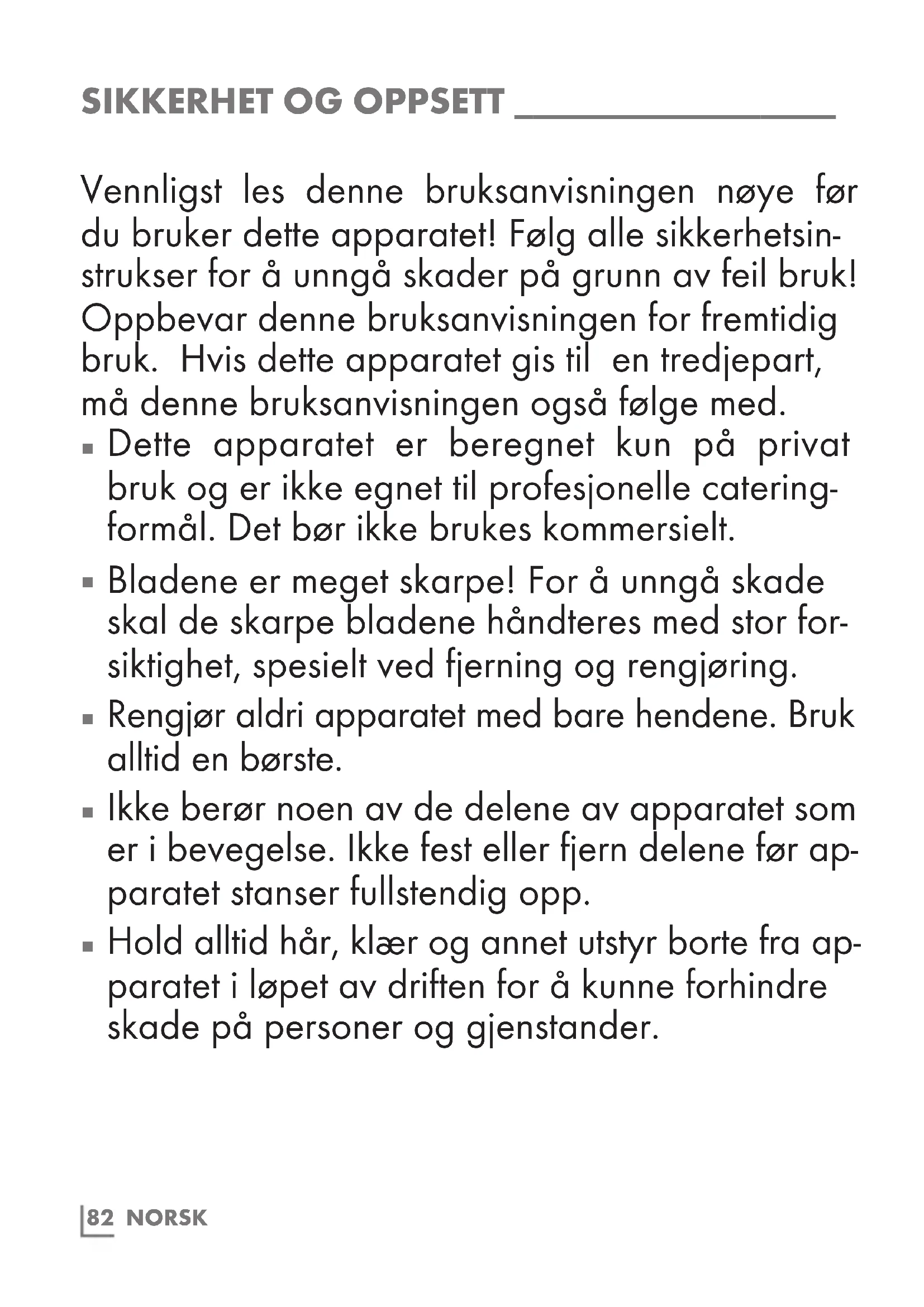 Hold alltid hår, klær og annet utstyr borte fra ap- paratet i løpet av driften for å kunne forhindre skade på personer og gjenstander.NORSK 83