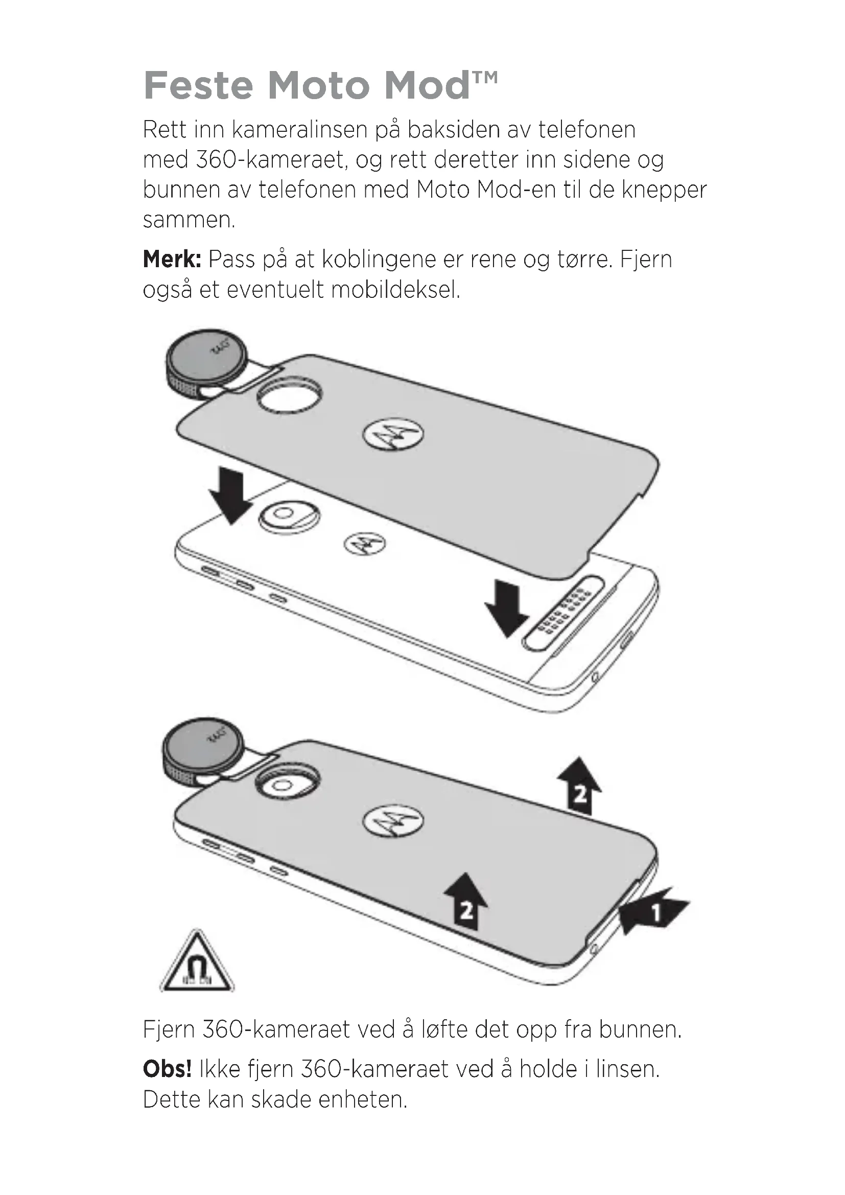 beskjæring Beskjær et 360°-bilde til et 360°-fordypningsbilde av området du velger. Filtre Velg mellom et utvalg av filtre. Juster Juster eksponering, kontrast, metning og fargetone manuelt. Redigeringsalternativer for 360-videoer Trykk på for å finne disse alternativene. Beskjær Beskjær lengden på videoen din. Kompiler Kompiler flere 360°-videoer til en enkelt video. Regissør- versjon Velg de mest imponerende delene av en 360°-video, og rediger dem sammen til en normal, ikke-interaktiv 16:9-video som kan sees av alle. Opptak Ta opp en del av videoen som et bilde, enten i 360° eller flatt.Vil du ha mer? Gå til www.motorola.com/mymotomods for å se opplæringer, videoer og mer.Opphavsrett og varemerker Motorola Mobility LLC 222W. Merchandise Mart Plaza Chicago, IL 60654 www.motorola.com Enkelte funksjoner, tjenester og programmer er avhengige av nettverk og er kanskje ikke tilgjengelige i alle områder. Ytterligere vilkår og/eller kostnader kan forekomme. Kontakt tjenesteleverandøren for å få mer informasjon. Alle funksjoner, all funksjonalitet og andre produktspesifikasjoner samt informasjonen i denne brukerhåndboken er basert på den siste tilgjengelige informasjonen da boken gikk i trykken. Motorola forbeholder seg retten til å endre eller modifisere informasjon eller spesifikasjoner uten varsel eller forpliktelser. Merk: Bildene i denne veiledningen er bare ment som eksempler. MOTOROLA, den stiliserte M-logoen, MOTO og MOTO-merkeserien er varemerker eller registrerte varemerker for Motorola Trademark Holdings, LLC. LENOVO er et varemerke for Lenovo. Google, Android, Google Play og andre merker er varemerker for Google Inc. microSD-kortlogoen er et varemerke for SD-3C, LLC. Alle andre produkt- eller tjenestenavn tilhører de respektive eierne. © 2017 Motorola Mobility LLC. Med enerett. Produkt-ID-er: Moto Mods 360 Camera (MD100S) Brukerhåndboknummer: SSC8C19882-A360 CAMERA360 CAMERA Moto Mod™ aksesuarınızı takma Telefonunuzun arkasındaki kamera lensini 360 Camera ile hizalayın, ardından telefonun yan ve alt taraflarını Moto Mod ile birbirlerine geçinceye kadar hizalayın. Not: Konektörlerin temiz ve kuru olduğundan emin olun. Ayrıca telefon kılıfı kullanıyorsanız çıkarın. MD100S 360 Camera'yı çıkarmak için alttan tutarak yukarı kaldırın. Dikkat: 360 Camera'yı lensten tutarak çıkarmayın; aksi takdirde cihazınız zarar görebilir.Lens kapağını çıkarma Lens kapağını çıkarmak için tutup kaldırın ve çevirerek çıkarın. Dikkat: Lensin çizilmesini önlemek için kameranızı kullanmadığınız zaman lens kapağını takılı tutun ve lens kapağı takılı değilse kameranızı masaya veya düz bir yüzeye koymayın. Kamerayı açma Kamerayı açmanın birkaç yolu vardır: