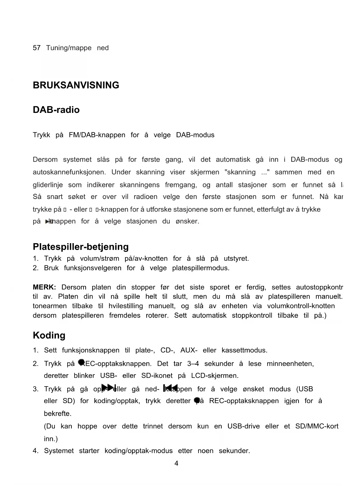52 Aux-inn 53 Kassett 54 Meny 55 Prog 56 Tuning/mappe opp4 57 Tuning/mappe ned BRUKSANVISNING DAB-radio Trykk på FM/DAB-knappen for å velge DAB-modus Dersom systemet slås på for første gang, vil det automatisk gå inn i DAB-modus og starte autoskannefunksjonen. Under skanning viser skjermen "skanning ..." sammen med en gliderlinje som indikerer skanningens fremgang, og antall stasjoner som er funnet så langt. Så snart søket er over vil radioen velge den første stasjonen som er funnet. Nå kan du trykke på - eller -knappen for å utforske stasjonene som er funnet, etterfulgt av å trykke på -knappen for å velge stasjonen du ønsker. Platespiller-betjening
