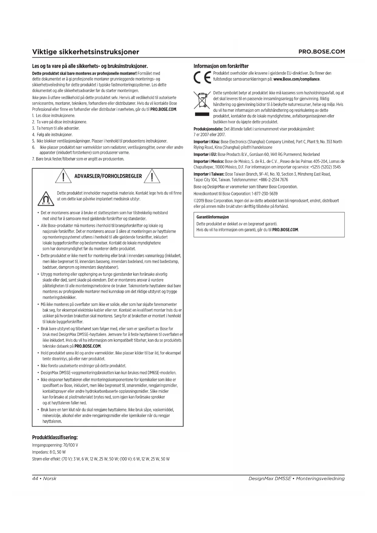 - Bruk bare en tørr klut når du skal rengjøre høyttalerne. Ikke bruk såpe, vaskemiddel, mineralolje, alkohol eller andre rengjøringsmidler eller kjemikalier når du rengjør høyttaleren. Produktklassifisering: Inngangsspenning: 70/100V Impedans: 8 50 W Strøm eller eekt: (70V): 3W, 6W, 12W, 25W, 50W; (100V): 6W, 12W, 25W, 50W Informasjon om forskrifter Produktet overholder alle kravene i gjeldende EU-direktiver. Du finner den fullstendige samsvarserklæringen på: www.Bose.com/compliance. Dette symbolet betyr at produktet ikke må kasseres som husholdningsavfall, ogat det skal leveres til en passende innsamlingsanlegg for gjenvinning. Riktig håndtering og gjenvinning bidrar til å beskytte naturressurser, helse og miljø. Hvis du vil ha mer informasjon om avfallshåndtering og resirkulering av dette produktet, kontakter du de lokale myndighetene, avfallsorganisasjonen eller butikken hvor du kjøpte dette produktet. Produksjonsdato: Det åttende tallet i serienummeret viser produksjonsåret: 7er2007eller2017. Importør i Kina: Bose Electronics (Shanghai) Company Limited, Part C, Plant 9, No.353North Riying Road, Kina (Shanghai) pilotfri handelssone Importør i EU: Bose Products B.V., Gorslaan 60, 1441 RG Purmerend, Nederland Importør i Mexico: Bose de México, S. de R.L. de C.V. , Paseo de las Palmas 405-204, Lomasde Chapultepec, 11000 México, D.F. For informasjon om importør og service: +5255(5202) 3545 Importør i Taiwan: Bose Taiwan Branch, 9F-A1, No. 10, Section 3, Minsheng East Road, TaipeiCity 104, Taiwan. Telefonnummer: +886-2-2514 7676 Bose og DesignMax er varemerker som tilhører Bose Corporation. Hovedkontoret til Bose Corporation: 1-877-230-5639 ©2019 Bose Corporation. Ingen del av dette arbeidet kan bli reprodusert, endret, distribuert eller på annen måte brukt uten skriftlig tillatelse på forhånd. Garantiinformasjon Dette produktet er dekket av en begrenset garanti. Hvis du vil ha informasjon om garanti, går du til PRO.BOSE.COM.Norsk • 45Monteringsveiledning • DesignMax DM5SE