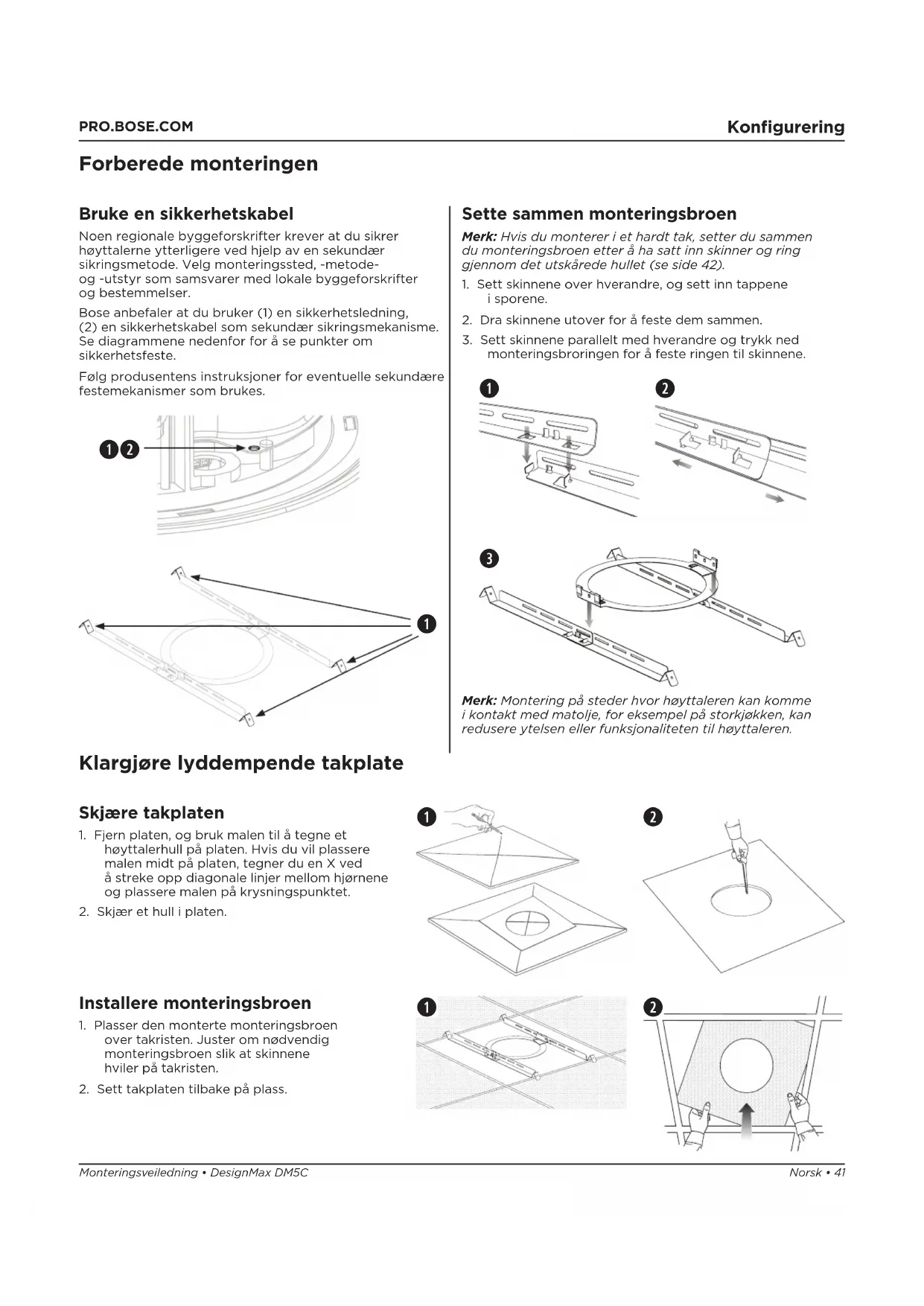 Oversikt Innhold i pakken Produktmål ×2 ×2 ×4×2 ×1 304 mm 244 mm 48 mm 192 mm 206 mm Tekniske spesifikasjoner Hvis du vil ha flere spesifikasjoner, kan du se det tekniske dataarket for DesignMax DM5C på PRO.BOSE.COM. Fysisk Produktmål Nettingdiameter: 304 mm Diameter på høyttalerhus: 244 mm Dybde på høyttalerbrønn: 192 mm Utskåret hull 250 mm Maksimal taktykkelse 48 mm Nettovekt, Høyttaler med grill (enkel) 4,45kg Nettovekt, Monteringsbro (enkel) 0,86kg Forsendelsesvekt (par) 13,15kg Viktig informasjon om montering Dette produktet er kun ment for innendørsbruk. Det er montørens ansvar å sikre at monteringen av høyttalerne og monteringssystemet utføres i henhold til alle gjeldende forskrifter, inkludert lokale byggeforskrifter og bestemmelser. Kontakt de lokale myndighetene som har domsmyndighet før du monterer dette produktet. Montøren har ansvaret for at høyttaleren er sikkert montert. Hvishøyttaleren ikke er montert på riktig måte, kan dette forårsakeskade og død. Ikke monter produktet på steder der det kan bli eksponert for vanneller kondens. Dette produktet er ikke ment for montering eller bruk i innendørs vannanlegg (inkludert, men ikke begrenset til, innendørs basseng, innendørs badeland, rom med badestamp, badstuer, damprom oginnendørs skøytebaner). Ikke blokker ventilasjonsåpninger. Plasser i henhold til produsentens instruksjoner. Ikke plasser produktet nær varmekilder som radiatorer, ventilasjonsgitter, ovner eller andre apparater (inkludert forsterkere) som produserer varme. Må ikke monteres på overflater som ikke er solide, eller som harskjulte faremomenter bak seg, for eksempel elektriske kablereller rør. Kontakt en kvalifisert montør hvis du er usikker påhvordan braketten skal monteres. Sørg for at braketten er montert i henhold til lokale byggeforskrifter. Ikke eksponer høyttaleren eller monteringskomponentene for kjemikalier som ikke er spesifisert av Bose, inkludert, men ikke begrenset til, smøremidler, rengjøringsmidler, kontaktsprayer eller andre hydrokarbonbaserte oppløsningsmidler. Slike midler kan forårsake at plastmaterialet brytes ned, som igjen kan forårsake sprekker og at høyttaleren faller ned.40 • Norsk DesignMax DM5C • Monteringsveiledning