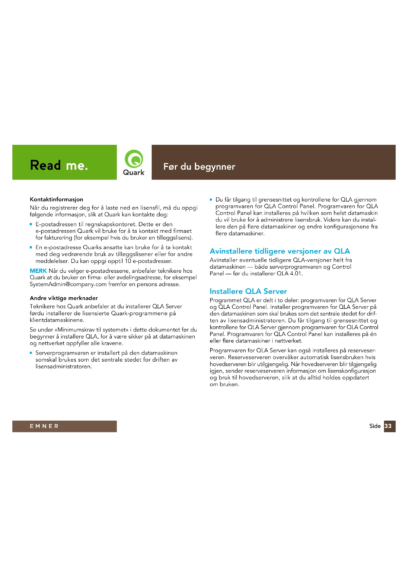 Det andre brukernavnet og passordet skal brukes av webbrukeren ved nedlasting av lisensfilen eller endring av informasjon. Det samme brukernavnet kan brukes til begge funksjonene, men du må bruke forskjellige passord. Brukernavn og passord må være alfanumeriske og kan inneholde mellom 4 og 32 tegn. Det skilles mellom store og små bokstaver i passord. Read me. Minimumskrav til systemetSide 132 EMNER MERK Etter at du har skrevet inn et brukernavn, kan du ikke endre det med mindre du installerer programvaren for QLA Server på nytt. Videre kan du ikke endre webbrukernavnet etter at du har opprettet en konto for å laste ned lisensfilen. Teknisk informasjon Når du installerer QLA Server og registrerer med Quark for å laste ned en lisensfil, må du sørge for å ha følgende informasjon om serveren og nettverket: