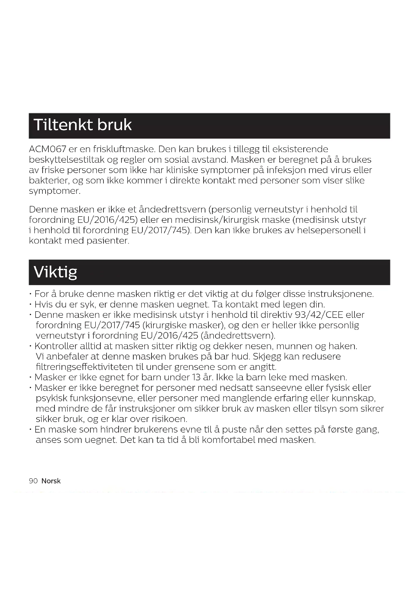 - De elektromagnetiske feltene som magnetene og masken generere, kan forstyrre medisinsk utstyr (f.eks. høreapparater). AMC067-AirMasks_3000.062.5277.2_BOOKLET_120x120mm_BW.indd 90AMC067-AirMasks_3000.062.5277.2_BOOKLET_120x120mm_BW.indd 90 01-03-21 11:2601-03-21 11:26Norsk 91 Tiltenkt bruk ACM067 er en friskluftmaske. Den kan brukes i tillegg til eksisterende beskyttelsestiltak og regler om sosial avstand. Masken er beregnet på å brukes av friske personer som ikke har kliniske symptomer på infeksjon med virus eller bakterier, og som ikke kommer i direkte kontakt med personer som viser slike symptomer. Denne masken er ikke et åndedrettsvern (personlig verneutstyr i henhold til forordning EU/2016/425) eller en medisinsk/kirurgisk maske (medisinsk utstyr i henhold til forordning EU/2017/745). Den kan ikke brukes av helsepersonell i kontakt med pasienter. Viktig Advarsel
