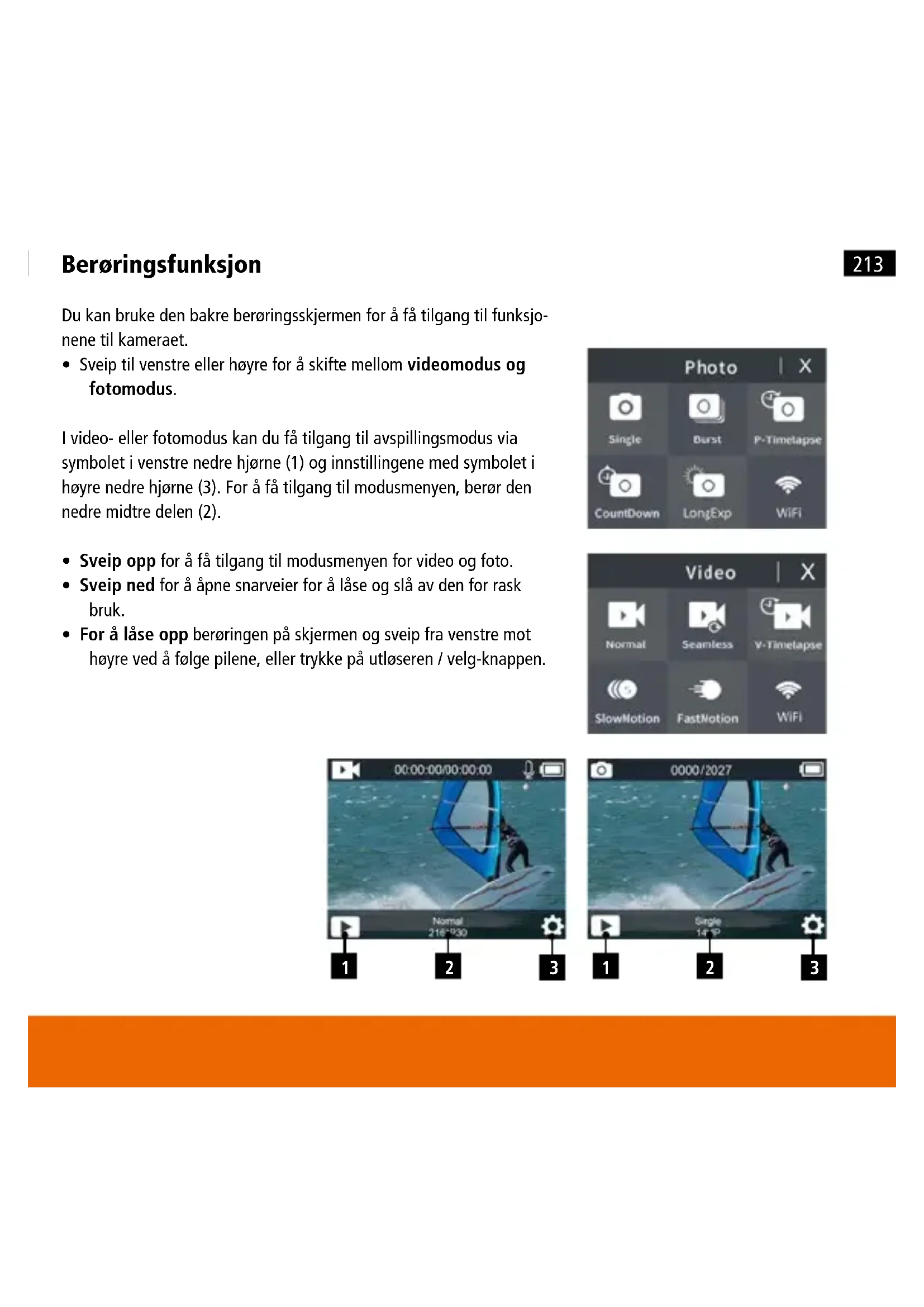 - Sveip til venstre eller høyre for å skifte mellom videomodus og fotomodus. I video- eller fotomodus kan du få tilgang til avspillingsmodus via symbolet i venstre nedre hjørne (1) og innstillingene med symbolet i høyre nedre hjørne (3). For å få tilgang til modusmenyen, berør den nedre midtre delen (2).