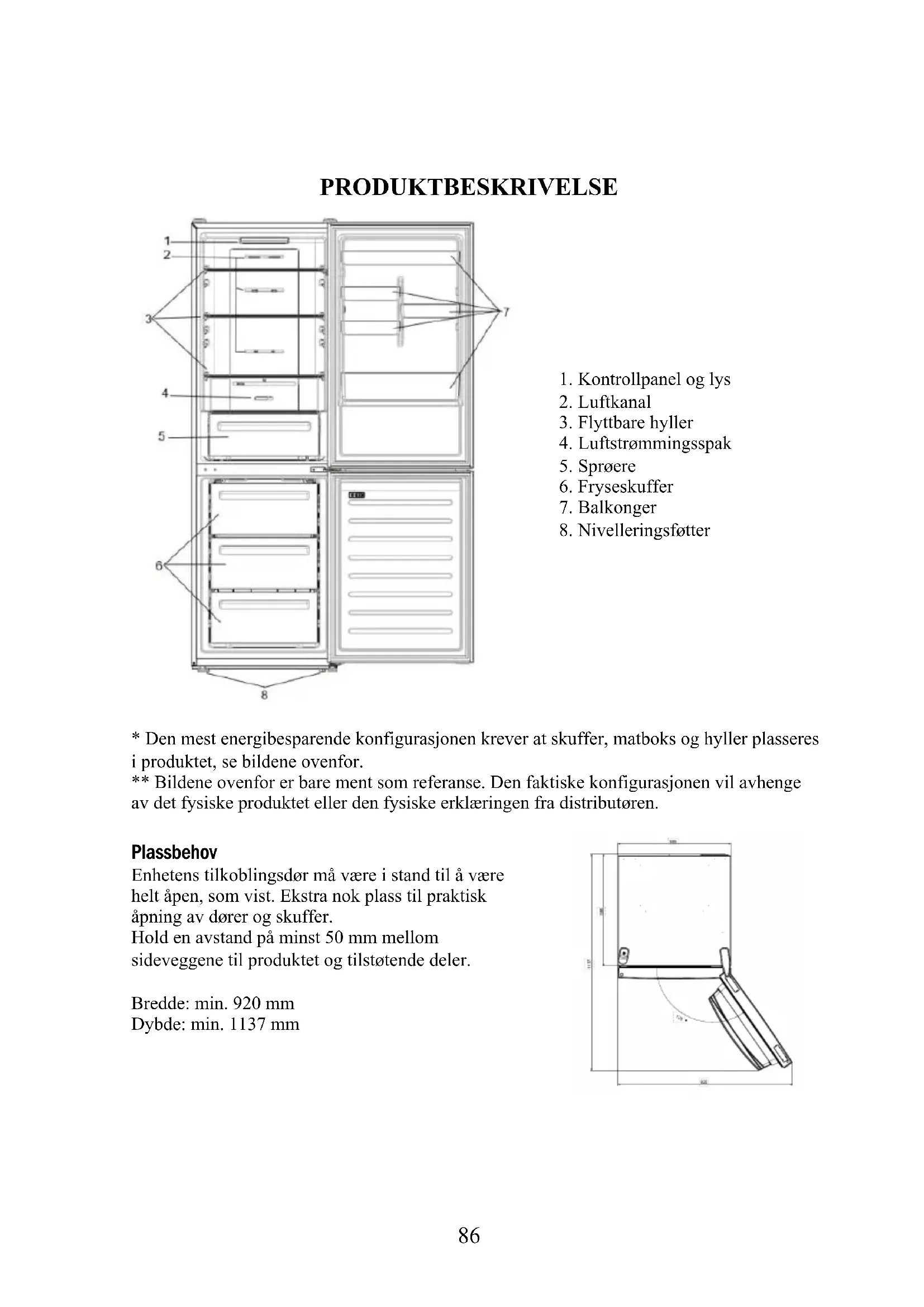 - Den mest energibesparende konfigurasjonen krever at skuffer, matboks og hyller plasseres i produktet, se bildene ovenfor. ** Bildene ovenfor er bare ment som referanse. Den faktiske konfigurasjonen vil avhenge av det fysiske produktet eller den fysiske erklæringen fra distributøren. Plassbehov Enhetens tilkoblingsdør må være i stand til å være helt åpen, som vist. Ekstra nok plass til praktisk åpning av dører og skuffer. Hold en avstand på minst 50 mm mellom sideveggene til produktet og tilstøtende deler. Bredde: min. 920 mm Dybde: min. 1137 mm87 BRUK AV/PÅ-tasten, brukes til å slå apparatet av/på. INNSTILLING-tast som brukes til å justere temperaturen eller til å velge Super Cool-funksjonen. Super Cool-ikon viser hvis funksjonen er aktivert.