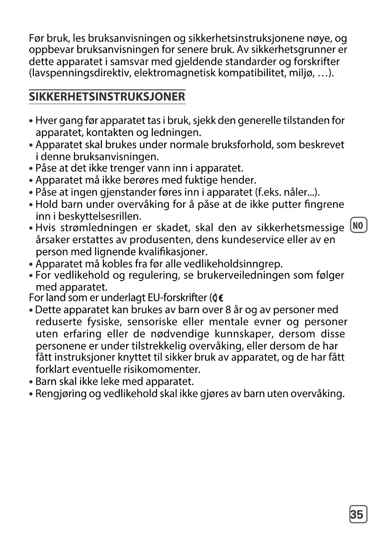 - Dette apparatet er ikke ment for bruk av personer (inkludert barn) med reduserte fysiske, sensoriske eller mentale evner eller mangel på erfaring og kunnskap, med mindre de har fått innføring eller opplæring i bruk av apparatet av en person som er ansvarlig for deres sikkerhet. Barn må holdes under oppsyn for å sikre at de ikke leker med apparatet. ANBEFALINGER