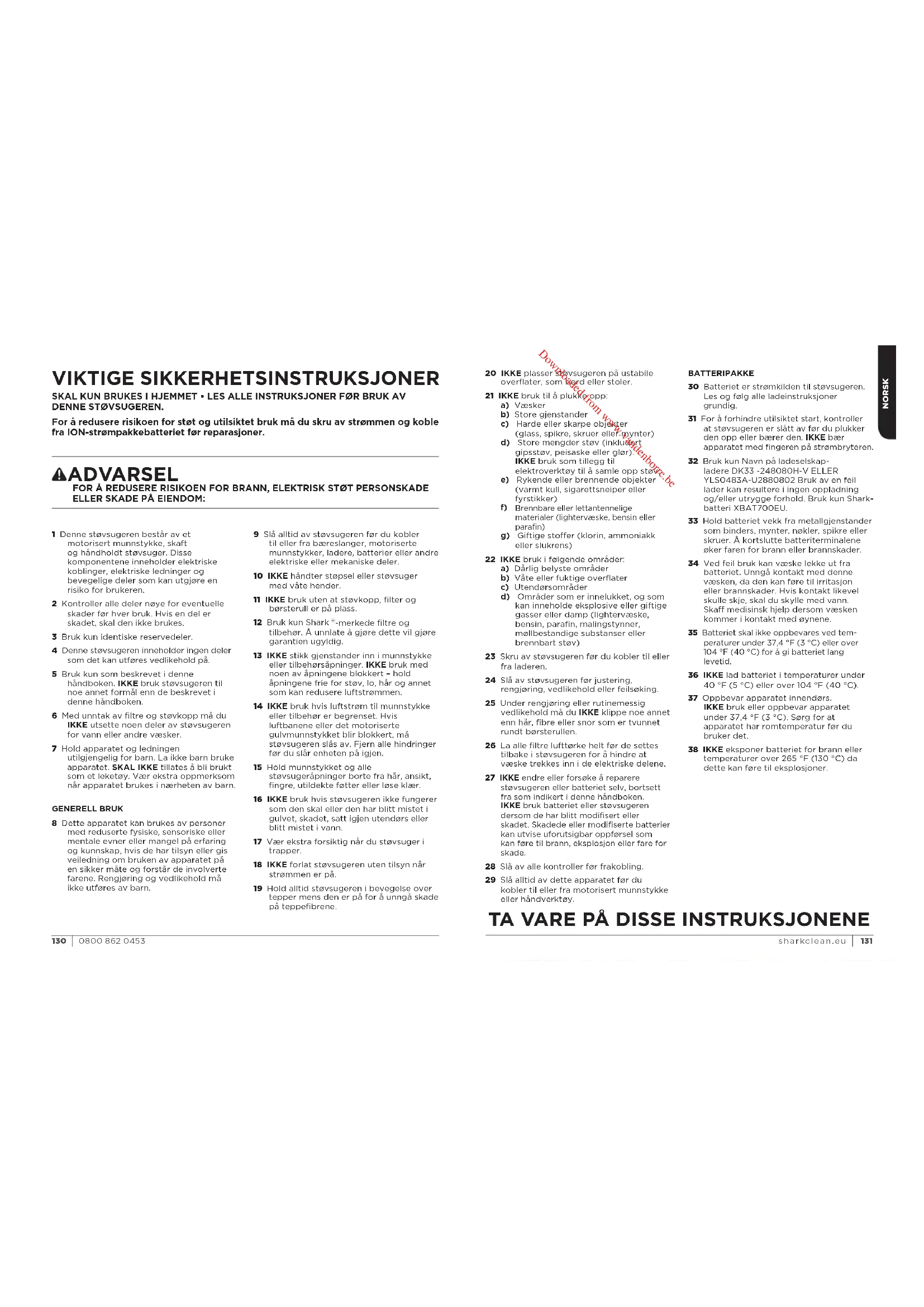 Brennbare eller lettantennelige materialer (lightervæske, bensin eller parafin) g) Giftige stoer (klorin, ammoniakk eller slukrens) 22 IKKE bruk i følgende områder: a) Dårlig belyste områder b) Våte eller fuktige overflater c) Utendørsområder d) Områder som er innelukket, og som kan inneholde eksplosive eller giftige gasser eller damp (lightervæske, bensin, parafin, malingstynner, møllbestandige substanser eller brennbart støv) 23 Skru av støvsugeren før du kobler til eller fra laderen. 24 Slå av støvsugeren før justering, rengjøring, vedlikehold eller feilsøking. 25 Under rengjøring eller rutinemessig vedlikehold må du IKKE klippe noe annet enn hår, fibre eller snor som er tvunnet rundt børsterullen. 26 La alle filtre lufttørke helt før de settes tilbake i støvsugeren for å hindre at væske trekkes inn i de elektriske delene. 27 IKKE endre eller forsøke å reparere støvsugeren eller batteriet selv, bortsett fra som indikert i denne håndboken. IKKEbruk batteriet eller støvsugeren dersom de har blitt modifisert eller skadet. Skadede eller modifiserte batterier kan utvise uforutsigbar oppførsel som kan føre til brann, eksplosjon eller fare for skade. 28 Slå av alle kontroller før frakobling. 29 Slå alltid av dette apparatet før du koblertil eller fra motorisert munnstykke eller håndverktøy. BATTERIPAKKE 30 Batteriet er strømkilden til støvsugeren. Les og følg alle ladeinstruksjoner grundig. 31 For å forhindre utilsiktet start, kontroller at støvsugeren er slått av før du plukker den opp eller bærer den. IKKE bær apparatet med fingeren på strømbryteren. 32 Bruk kun Navn på ladeselskap- ladere DK33 -248080H-V ELLER YLS0483A-U2880802 Bruk av en feil lader kan resultere i ingen oppladning og/eller utrygge forhold. Bruk kun Shark- batteri XBAT700EU. 33 Hold batteriet vekk fra metallgjenstander som binders, mynter, nøkler, spikre eller skruer. Å kortslutte batteriterminalene øker faren for brann eller brannskader. 34 Ved feil bruk kan væske lekke ut fra batteriet. Unngå kontakt med denne væsken, da den kan føre til irritasjon eller brannskader. Hvis kontakt likevel skulle skje, skal du skylle med vann. Skamedisinsk hjelp dersom væsken kommer i kontakt med øynene. 35 Batteriet skal ikke oppbevares ved tem- peraturer under 37,4°F (3°C) eller over 104°F (40°C) for å gi batteriet lang levetid. 36 IKKE lad batteriet i temperaturer under 40°F (5°C) eller over 104°F (40°C). 37 Oppbevar apparatet innendørs. IKKEbruk eller oppbevar apparatet under 37,4°F (3°C). Sørg for at apparatet har romtemperatur før du bruker det. 38 IKKE eksponer batteriet for brann eller temperaturer over 265°F (130°C) da dette kan føre til eksplosjoner. ADVARSEL FOR Å REDUSERE RISIKOEN FOR BRANN, ELEKTRISK STØT PERSONSKADE ELLER SKADE PÅ EIENDOM: VIKTIGE SIKKERHETSINSTRUKSJONER SKAL KUN BRUKES I HJEMMET • LES ALLE INSTRUKSJONER FØR BRUK AV DENNE STØVSUGEREN. For å redusere risikoen for støt og utilsiktet bruk må du skru av strømmen og koble fra ION-strømpakkebatteriet før reparasjoner.