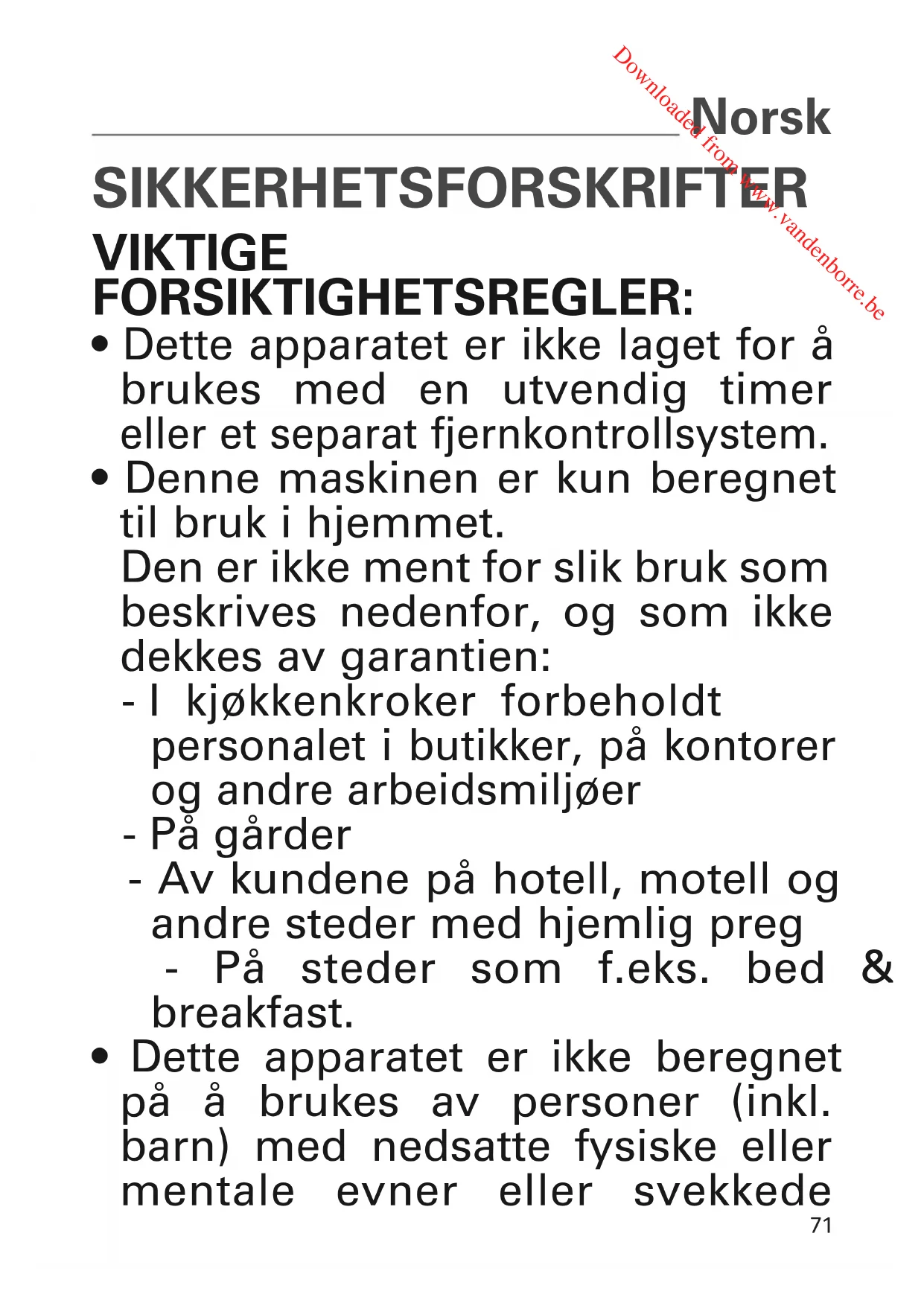- Denne maskinen er kun beregnet til bruk i hjemmet. Den er ikke ment for slik bruk som beskrives nedenfor, og som ikke dekkes av garantien: - I kjøkkenkroker forbeholdt personalet i butikker, på kontorer og andre arbeidsmiljøer - På gårder - Av kundene på hotell, motell og andre steder med hjemlig preg - På steder som f.eks. bed & breakfast.
