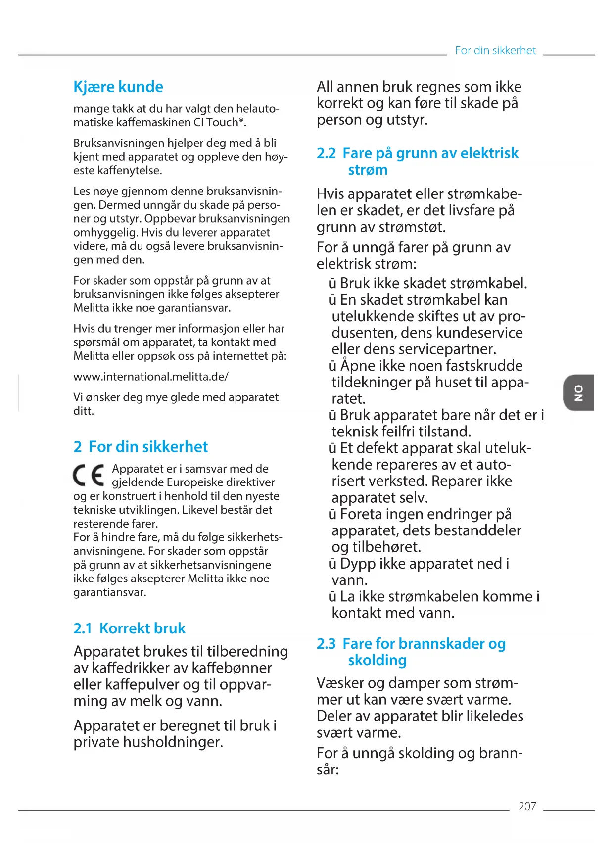 Kjære kunde mange takk at du har valgt den helauto- matiske kaemaskinen CITouch®. Bruksanvisningen hjelper deg med å bli kjent med apparatet og oppleve den høy- este kaenytelse. Les nøye gjennom denne bruksanvisnin- gen. Dermed unngår du skade på perso- ner og utstyr. Oppbevar bruksanvisningen omhyggelig. Hvis du leverer apparatet videre, må du også levere bruksanvisnin- gen med den. For skader som oppstår på grunn av at bruksanvisningen ikke følges aksepterer Melitta ikke noe garantiansvar. Hvis du trenger mer informasjon eller har spørsmål om apparatet, ta kontakt med Melitta eller oppsøk oss på internettet på: www.international.melitta.de/ Vi ønsker deg mye glede med apparatet ditt. 2 For din sikkerhet Apparatet er i samsvar med de gjeldende Europeiske direktiver og er konstruert i henhold til den nyeste tekniske utviklingen. Likevel består det resterende farer. For å hindre fare, må du følge sikkerhets- anvisningene. For skader som oppstår på grunn av at sikkerhetsanvisningene ikke følges aksepterer Melitta ikke noe garantiansvar.