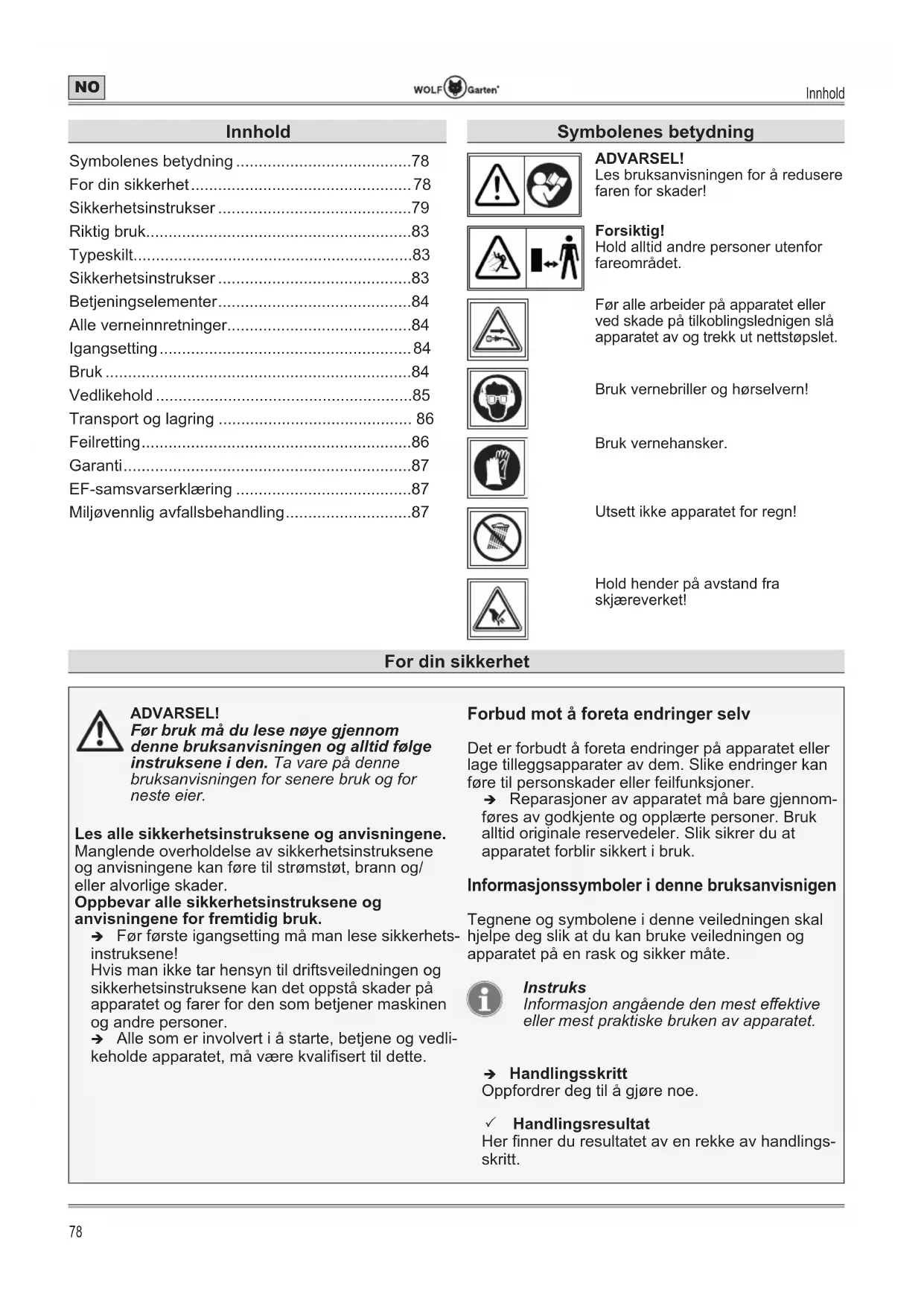 - Miljøvennlig avfallsbehandling Symbolenes betydning ADVARSEL! Les bruksanvisningen for å redusere faren for skader! Forsiktig! Hold alltid andre personer utenfor fareområdet. Før alle arbeider på apparatet eller ved skade på tilkoblingslednigen slå apparatet av og trekk ut nettstøpslet. Bruk vernebriller og hørselvern! Bruk vernehansker. Utsett ikke apparatet for regn! Hold hender på avstand fra skjæreverket! For din sikkerhet ADVARSEL! Før bruk må du lese nøye gjennom denne bruksanvisningen og alltid følge instruksene i den. Ta vare på denne bruksanvisningen for senere bruk og for neste eier. Les alle sikkerhetsinstruksene og anvisningene. Manglende overholdelse av sikkerhetsinstruksene og anvisningene kan føre til strømstøt, brann og/ eller alvorlige skader. Oppbevar alle sikkerhetsinstruksene og anvisningene for fremtidig bruk. Î Før første igangsetting må man lese sikkerhets- instruksene! Hvis man ikke tar hensyn til driftsveiledningen og sikkerhetsinstruksene kan det oppstå skader på apparatet og farer for den som betjener maskinen og andre personer. Î Alle som er involvert i å starte, betjene og vedli- keholde apparatet, må være kvalisert til dette. Forbud mot å foreta endringer selv Det er forbudt å foreta endringer på apparatet eller lage tilleggsapparater av dem. Slike endringer kan føre til personskader eller feilfunksjoner. Î Reparasjoner av apparatet må bare gjennom- føres av godkjente og opplærte personer. Bruk alltid originale reservedeler. Slik sikrer du at apparatet forblir sikkert i bruk. Informasjonssymboler i denne bruksanvisnigen Tegnene og symbolene i denne veiledningen skal hjelpe deg slik at du kan bruke veiledningen og apparatet på en rask og sikker måte. Instruks Informasjon angående den mest eektive eller mest praktiske bruken av apparatet. Î Handlingsskritt Oppfordrer deg til å gjøre noe. 3 Handlingsresultat Her nner du resultatet av en rekke av handlings- skritt.For din sikkerhet p. 87