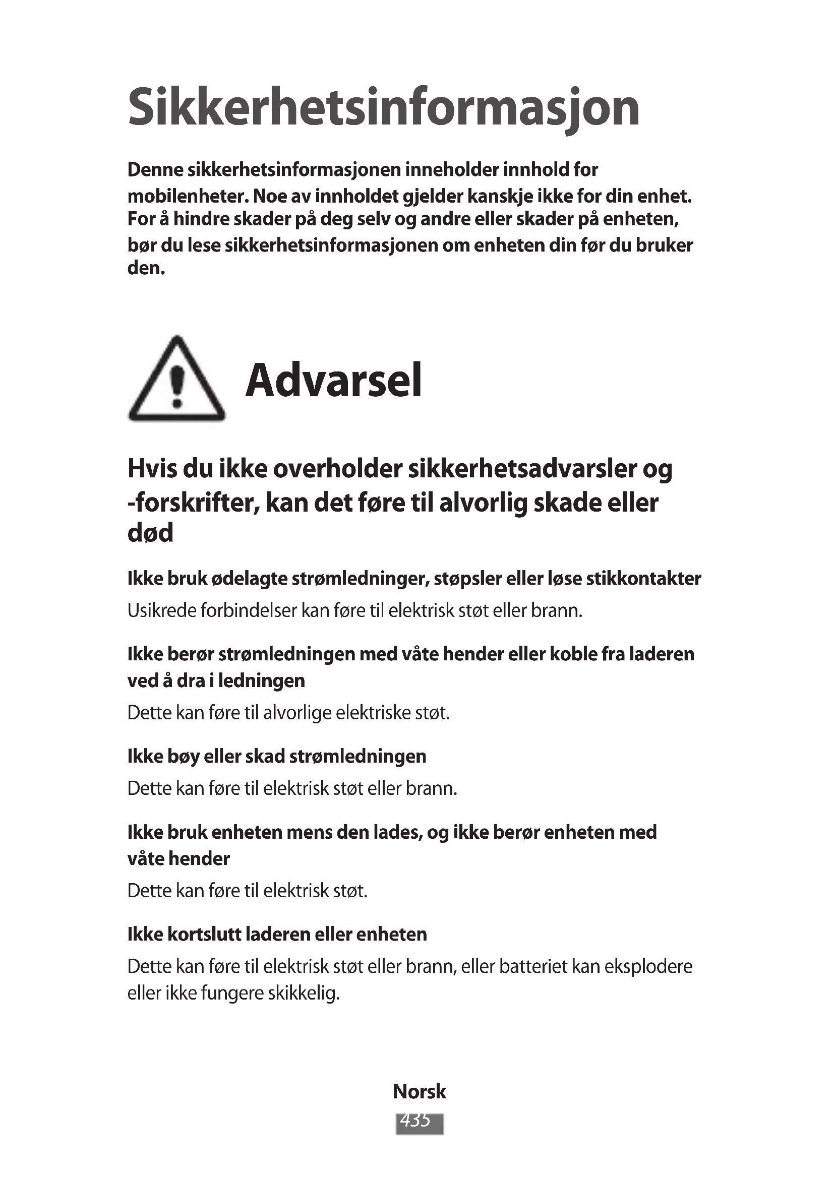 Sikkerhetsinformasjon Denne sikkerhetsinformasjonen inneholder innhold for mobilenheter. Noe av innholdet gjelder kanskje ikke for din enhet. For å hindre skader på deg selv og andre eller skader på enheten, bør du lese sikkerhetsinformasjonen om enheten din før du bruker den. Advarsel Hvis du ikke overholder sikkerhetsadvarsler og -forskrifter, kan det føre til alvorlig skade eller død Ikke bruk ødelagte strømledninger, støpsler eller løse stikkontakter Usikrede forbindelser kan føre til elektrisk støt eller brann. Ikke berør strømledningen med våte hender eller koble fra laderen ved å dra i ledningen Dette kan føre til alvorlige elektriske støt. Ikke bøy eller skad strømledningen Dette kan føre til elektrisk støt eller brann. Ikke bruk enheten mens den lades, og ikke berør enheten med våte hender Dette kan føre til elektrisk støt. Ikke kortslutt laderen eller enheten Dette kan føre til elektrisk støt eller brann, eller batteriet kan eksplodere eller ikke fungere skikkelig.Norsk