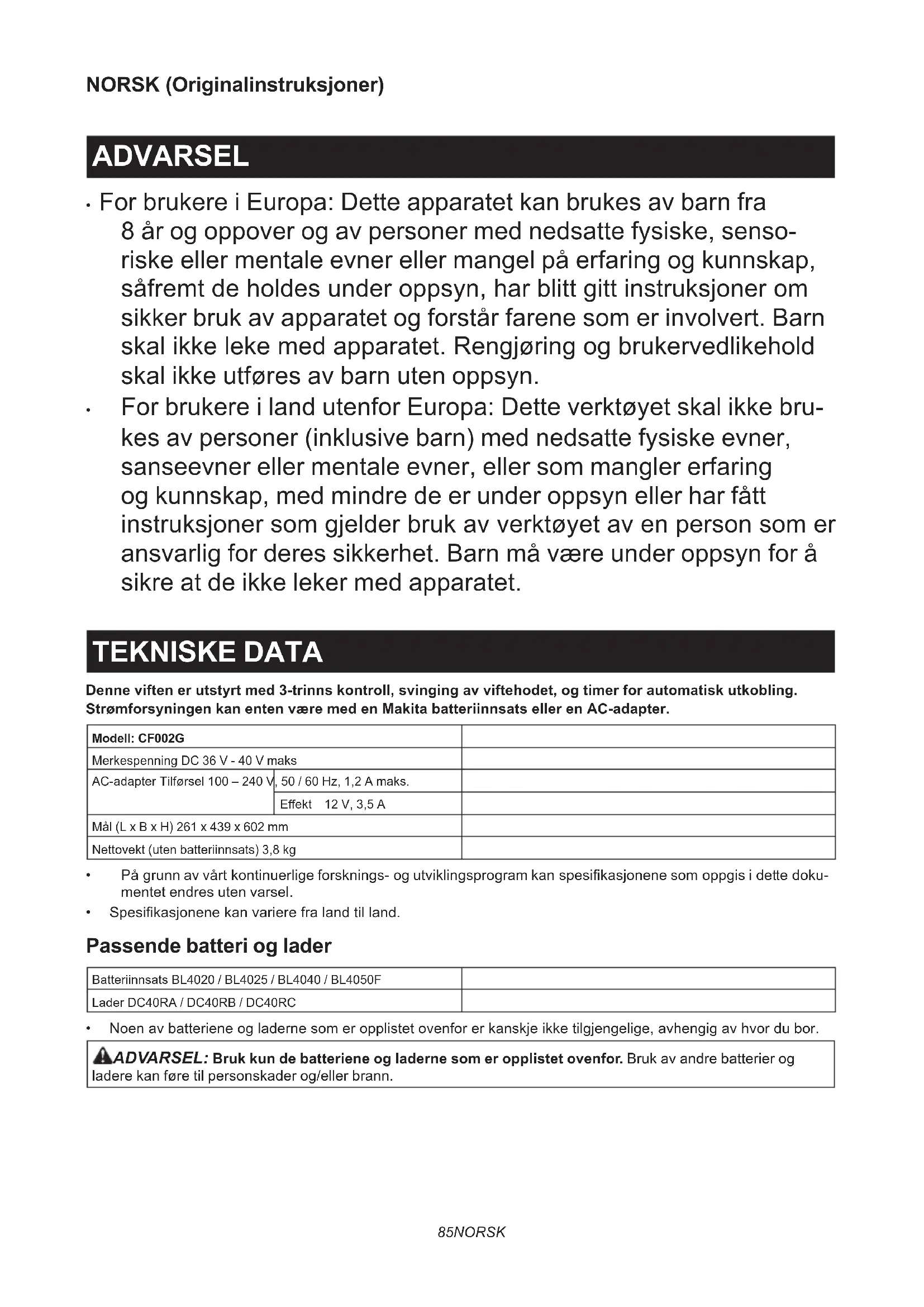 - For brukere i land utenfor Europa: Dette verktøyet skal ikke bru- kes av personer (inklusive barn) med nedsatte fysiske evner, sanseevner eller mentale evner, eller som mangler erfaring og kunnskap, med mindre de er under oppsyn eller har fått instruksjonersomgjelderbrukavverktøyetavenpersonsomer ansvarlig for deres sikkerhet. Barn må være under oppsyn for å sikre at de ikke leker med apparatet. TEKNISKE DATA Denne viften er utstyrt med 3-trinns kontroll, svinging av viftehodet, og timer for automatisk utkobling. Strømforsyningen kan enten være med en Makita batteriinnsats eller en AC-adapter. Modell: CF002GMerkespenning DC 36 V - 40 V maksAC-adapter Tilførsel 100 – 240 V, 50 / 60 Hz, 1,2 A maks.Eekt 12 V, 3,5 AMål (L x B x H) 261 x 439 x 602 mmNettovekt (uten batteriinnsats) 3,8 kg