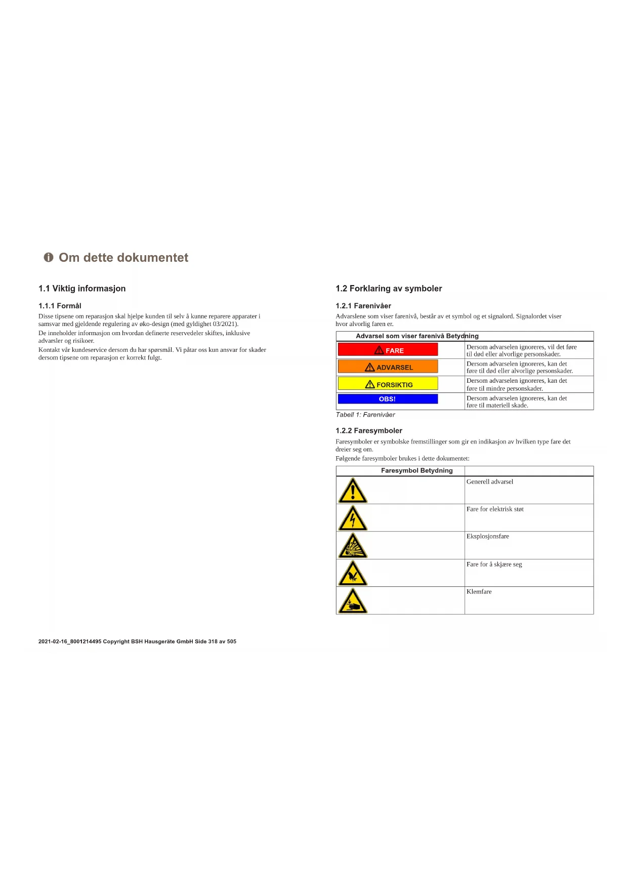 Faresymboler er symbolske fremstillinger som gir en indikasjon av hvilken type fare det dreier seg om. Følgende faresymboler brukes i dette dokumentet: Faresymbol Betydning Generell advarsel Fare for elektrisk støt Eksplosjonsfare Fare for å skjære seg Klemfare Om dette dokumentet 2021-02-16_8001214495 Copyright BSH Hausgeräte GmbH Side318av505Faresymbol Betydning Fare på grunn av varme overflater Fare på grunn av sterkt magnetfelt Fare fra ikke-ioniserende stråling Tabell2: Faresymboler