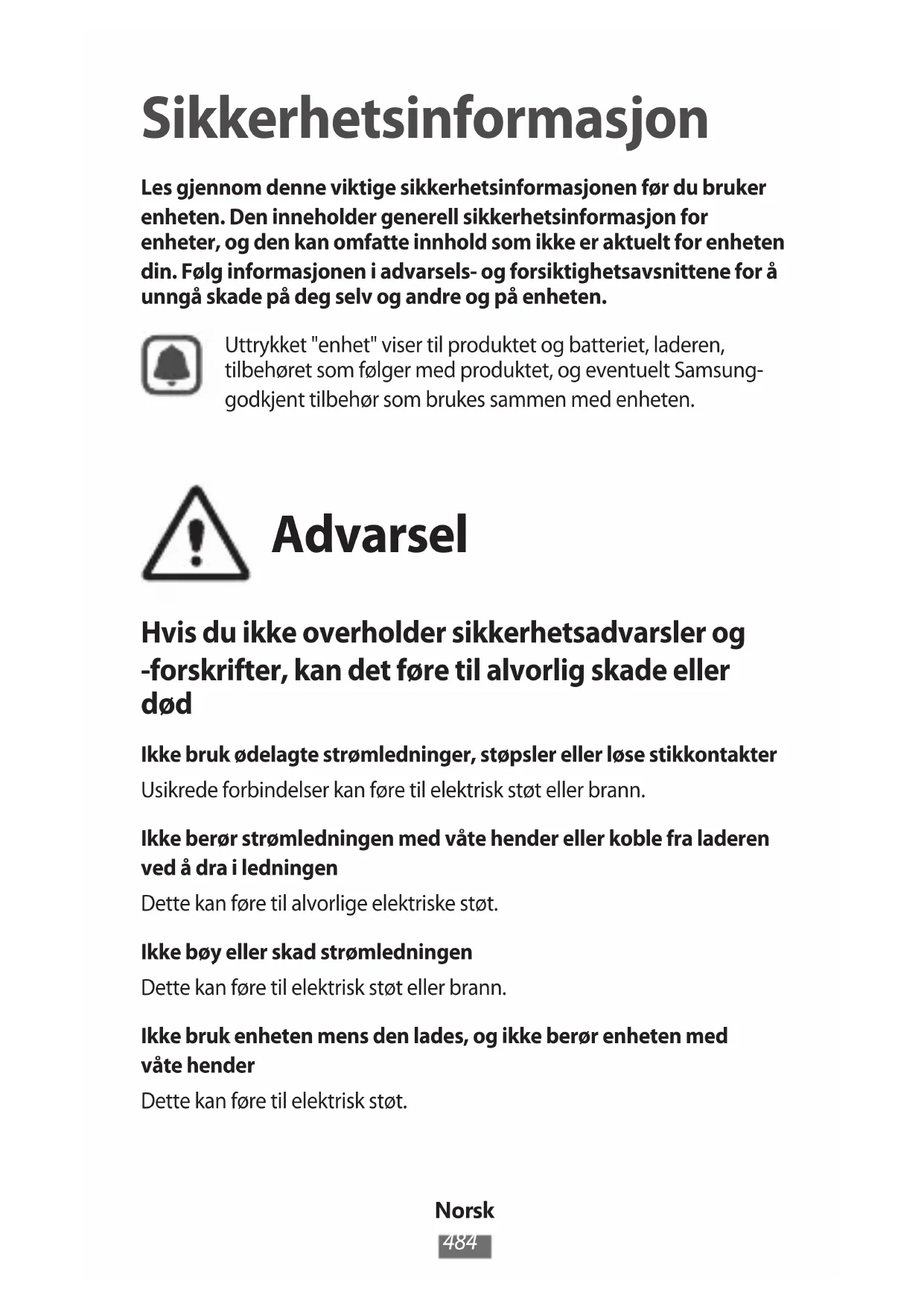 Sikkerhetsinformasjon Les gjennom denne viktige sikkerhetsinformasjonen før du bruker enheten. Den inneholder generell sikkerhetsinformasjon for enheter, og den kan omfatte innhold som ikke er aktuelt for enheten din. Følg informasjonen i advarsels- og forsiktighetsavsnittene for å unngå skade på deg selv og andre og på enheten. Uttrykket "enhet" viser til produktet og batteriet, laderen, tilbehøret som følger med produktet, og eventuelt Samsung- godkjent tilbehør som brukes sammen med enheten. Advarsel Hvis du ikke overholder sikkerhetsadvarsler og -forskrifter, kan det føre til alvorlig skade eller død Ikke bruk ødelagte strømledninger, støpsler eller løse stikkontakter Usikrede forbindelser kan føre til elektrisk støt eller brann. Ikke berør strømledningen med våte hender eller koble fra laderen ved å dra i ledningen Dette kan føre til alvorlige elektriske støt. Ikke bøy eller skad strømledningen Dette kan føre til elektrisk støt eller brann. Ikke bruk enheten mens den lades, og ikke berør enheten med våte hender Dette kan føre til elektrisk støt.Norsk