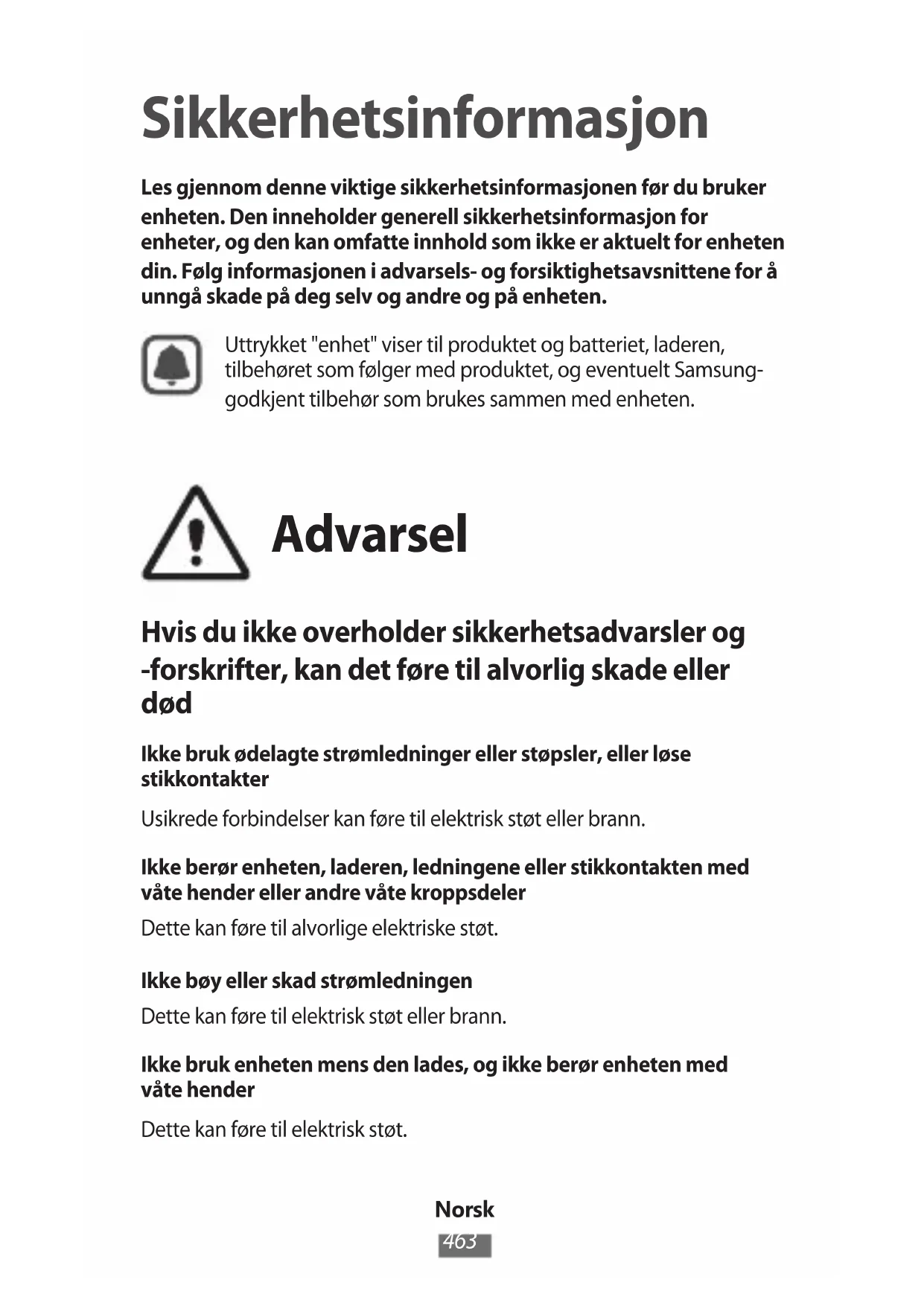 Sikkerhetsinformasjon Les gjennom denne viktige sikkerhetsinformasjonen før du bruker enheten. Den inneholder generell sikkerhetsinformasjon for enheter, og den kan omfatte innhold som ikke er aktuelt for enheten din. Følg informasjonen i advarsels- og forsiktighetsavsnittene for å unngå skade på deg selv og andre og på enheten. Uttrykket "enhet" viser til produktet og batteriet, laderen, tilbehøret som følger med produktet, og eventuelt Samsung- godkjent tilbehør som brukes sammen med enheten. Advarsel Hvis du ikke overholder sikkerhetsadvarsler og -forskrifter, kan det føre til alvorlig skade eller død Ikke bruk ødelagte strømledninger eller støpsler, eller løse stikkontakter Usikrede forbindelser kan føre til elektrisk støt eller brann. Ikke berør enheten, laderen, ledningene eller stikkontakten med våte hender eller andre våte kroppsdeler Dette kan føre til alvorlige elektriske støt. Ikke bøy eller skad strømledningen Dette kan føre til elektrisk støt eller brann. Ikke bruk enheten mens den lades, og ikke berør enheten med våte hender Dette kan føre til elektrisk støt.Norsk