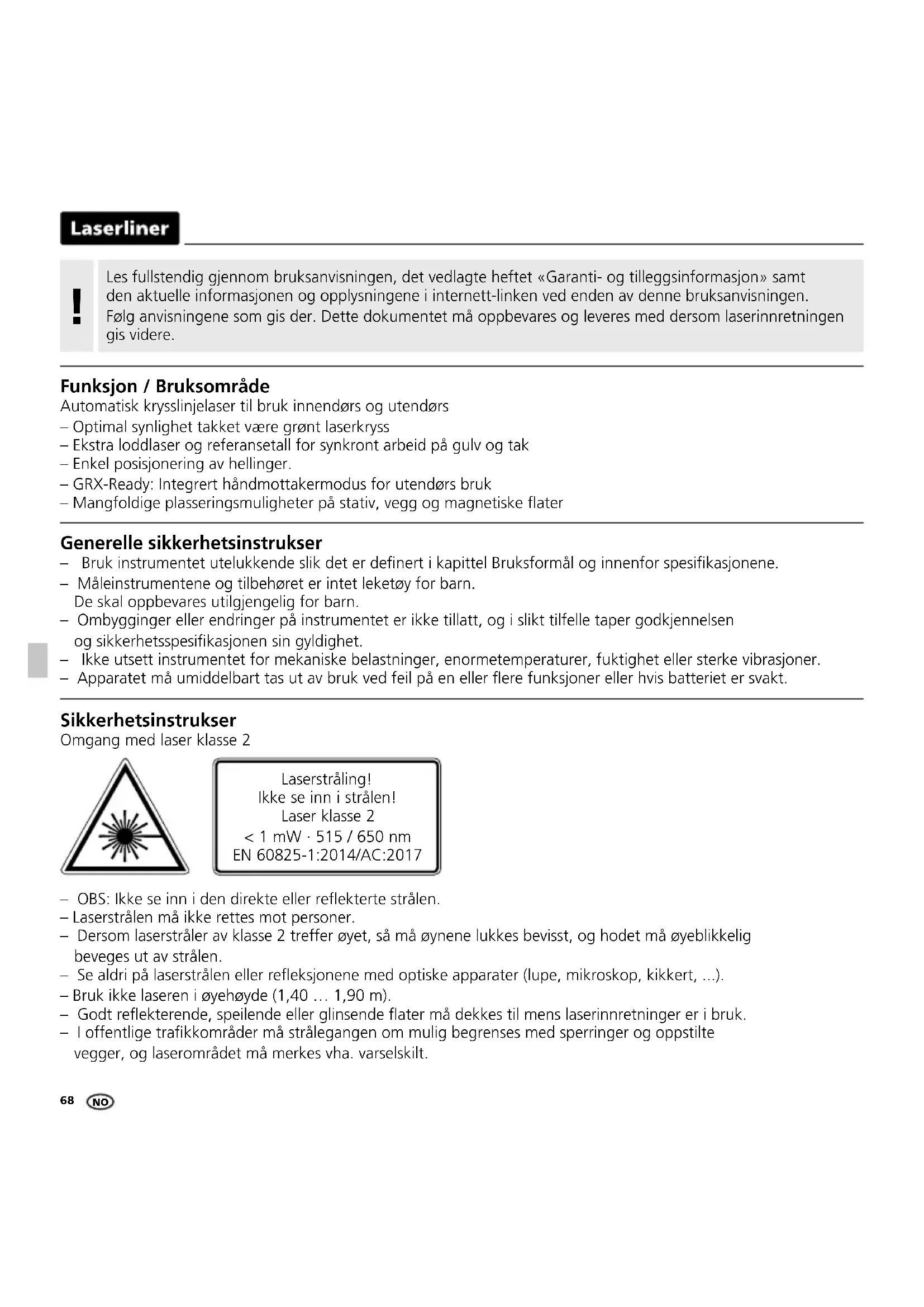 Generelle sikkerhetsinstrukser – Bruk instrumentet utelukkende slik det er denert i kapittel Bruksformål og innenfor spesikasjonene. – Måleinstrumentene og tilbehøret er intet leketøy for barn. De skal oppbevares utilgjengelig for barn. – Ombygginger eller endringer på instrumentet er ikke tillatt, og i slikt tilfelle taper godkjennelsen og sikkerhetsspesikasjonen sin gyldighet. – Ikke utsett instrumentet for mekaniske belastninger, enormetemperaturer, fuktighet eller sterke vibrasjoner. – Apparatet må umiddelbart tas ut av bruk ved feil på en eller ere funksjoner eller hvis batteriet er svakt. Sikkerhetsinstrukser Omgang med laser klasse 2 – OBS: Ikke se inn i den direkte eller reekterte strålen. – Laserstrålen må ikke rettes mot personer. – Dersom laserstråler av klasse 2 treffer øyet, så må øynene lukkes bevisst, og hodet må øyeblikkelig beveges ut av strålen. – Se aldri på laserstrålen eller reeksjonene med optiske apparater (lupe, mikroskop, kikkert, ...). – Bruk ikke laseren i øyehøyde (1,40 … 1,90 m). – Godt reekterende, speilende eller glinsende ater må dekkes til mens laserinnretninger er i bruk. – I offentlige trakkområder må strålegangen om mulig begrenses med sperringer og oppstilte vegger, og laserområdet må merkes vha. varselskilt. Laserstråling! Ikke se inn i strålen! Laser klasse 2 < 1 mW · 515 / 650 nm EN 60825-1:2014/AC:2017 Funksjon / Bruksområde Automatisk krysslinjelaser til bruk innendørs og utendørs – Optimal synlighet takket være grønt laserkryss – Ekstra loddlaser og referansetall for synkront arbeid på gulv og tak – Enkel posisjonering av hellinger. – GRX-Ready: Integrert håndmottakermodus for utendørs bruk – Mangfoldige plasseringsmuligheter på stativ, vegg og magnetiske ater NOSuperCross-Laser 2GP