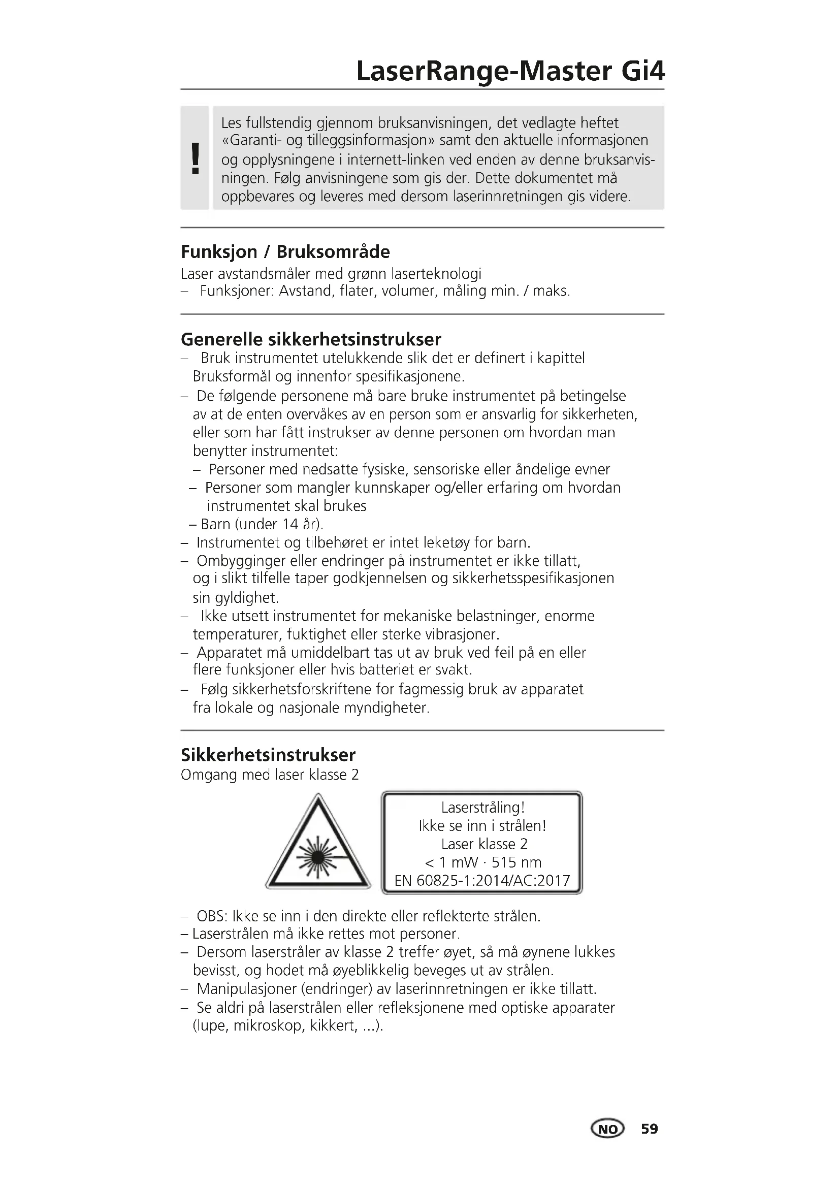 Funksjon / Bruksområde Generelle sikkerhetsinstrukser – Bruk instrumentet utelukkende slik det er denert i kapittel Bruksformål og innenfor spesikasjonene. – De følgende personene må bare bruke instrumentet på betingelse av at de enten overvåkes av en person som er ansvarlig for sikkerheten, eller som har fått instrukser av denne personen om hvordan man benytter instrumentet: – Personer med nedsatte fysiske, sensoriske eller åndelige evner – Personer som mangler kunnskaper og/eller erfaring om hvordan instrumentet skal brukes – Barn (under 14 år). – Instrumentet og tilbehøret er intet leketøy for barn. – Ombygginger eller endringer på instrumentet er ikke tillatt, og i slikt tilfelle taper godkjennelsen og sikkerhetsspesikasjonen sin gyldighet. – Ikke utsett instrumentet for mekaniske belastninger, enorme temperaturer, fuktighet eller sterke vibrasjoner. – Apparatet må umiddelbart tas ut av bruk ved feil på en eller ere funksjoner eller hvis batteriet er svakt. – Følg sikkerhetsforskriftene for fagmessig bruk av apparatet fra lokale og nasjonale myndigheter. – OBS: Ikke se inn i den direkte eller reekterte strålen. – Laserstrålen må ikke rettes mot personer. – Dersom laserstråler av klasse 2 treffer øyet, så må øynene lukkes bevisst, og hodet må øyeblikkelig beveges ut av strålen. – Manipulasjoner (endringer) av laserinnretningen er ikke tillatt. – Se aldri på laserstrålen eller reeksjonene med optiske apparater (lupe, mikroskop, kikkert, ...). Sikkerhetsinstrukser Omgang med laser klasse 2 Laserstråling! Ikke se inn i strålen! Laser klasse 2 < 1 mW · 515 nm EN 60825-1:2014/AC:2017 Laser avstandsmåler med grønn laserteknologi – Funksjoner: Avstand, ater, volumer, måling min. / maks. Les fullstendig gjennom bruksanvisningen, det vedlagte heftet «Garanti- og tilleggsinformasjon» samt den aktuelle informasjonen og opplysningene i internett-linken ved enden av denne bruksanvis- ningen. Følg anvisningene som gis der. Dette dokumentet må oppbevares og leveres med dersom laserinnretningen gis videre. !60 Åpne batterirommet og sett inn batteriene (2 x type AAA) ifølge installasjonssymbolene. Sørg for at polene blir lagt riktig. Innlegging av batterier