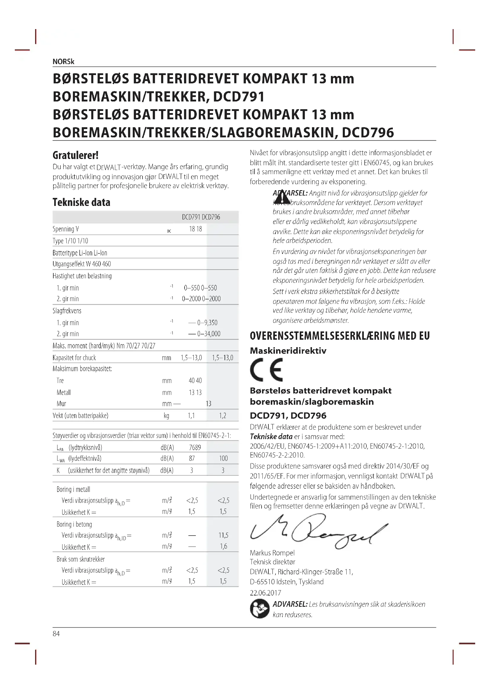 ADVARSEL: Les bruksanvisningen slik at skaderisikoen kanreduseres. Gratulerer! Du har valgt et DEWALT -verktøy. Mange års erfaring, grundig produktutvikling og innovasjon gjør DEWALT til en meget pålitelig partner for profesjonelle brukere av elektriskverktøy. Tekniske data DCD791 DCD796 Spenning V