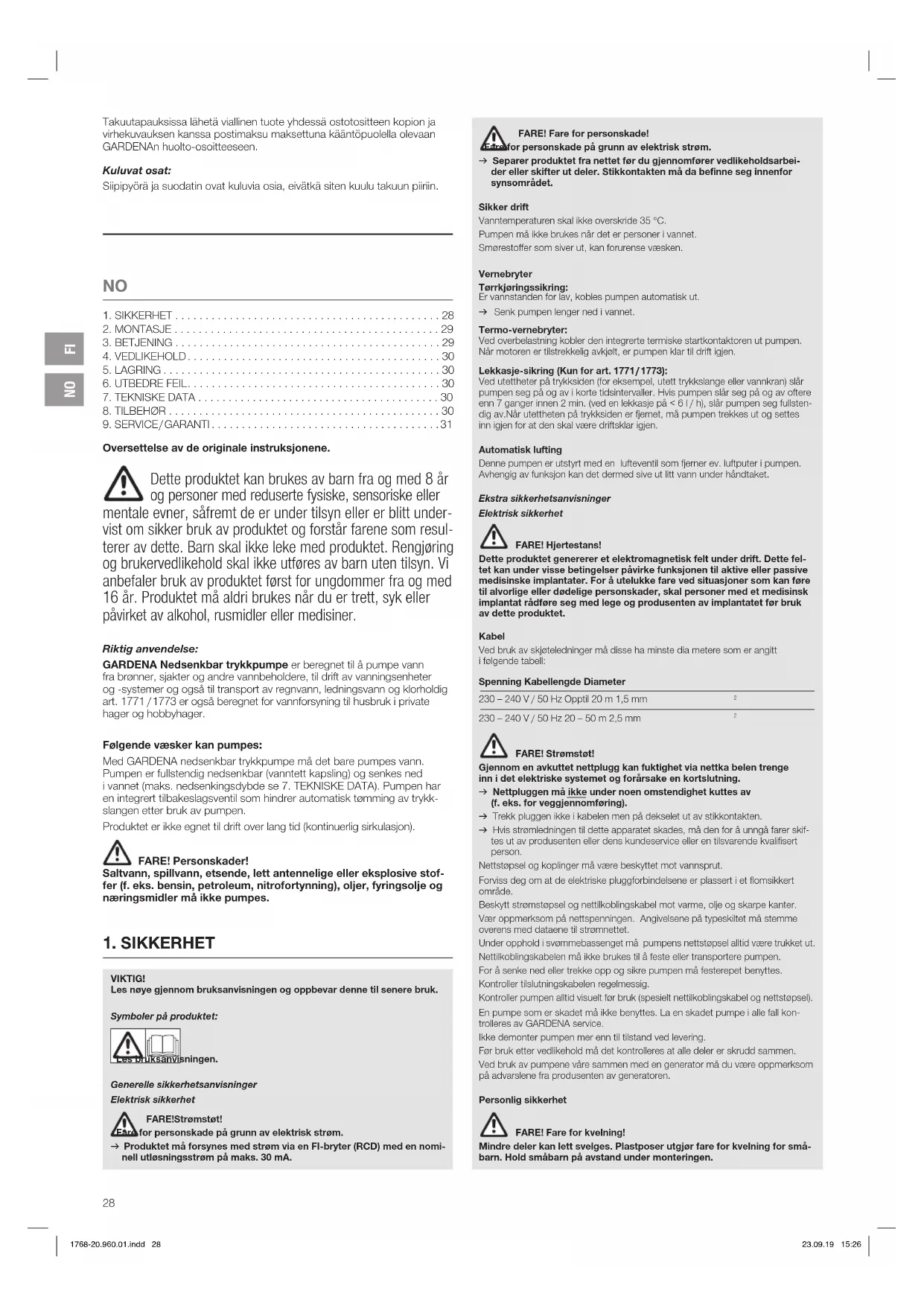 Oversettelse av de originale instruksjonene. Dette produktet kan brukes av barn fra og med 8 år og personer med reduserte fysiske, sensoriske eller mentale evner, såfremt de er under tilsyn eller er blitt under- vist om sikker bruk av produktet og forstår farene som resul- terer av dette. Barn skal ikke leke med produktet. Rengjøring og brukervedlikehold skal ikke utføres av barn uten tilsyn. Vi anbefaler bruk av produktet først for ungdommer fra og med 16 år. Produktet må aldri brukes når du er trett, syk eller påvirket av alkohol, rusmidler eller medisiner. Riktig anvendelse: GARDENA Nedsenkbar trykkpumpe er beregnet til å pumpe vann fra brønner, sjakter og andre vannbeholdere, til drift av vanningsenheter og -systemer og også til transport av regnvann, ledningsvann og klorholdig art. 1771 / 1773 er også beregnet for vannforsyning til husbruk i private hager og hobbyhager. Følgende væsker kan pumpes: Med GARDENA nedsenkbar trykkpumpe må det bare pumpes vann. Pumpen er fullstendig nedsenkbar (vanntett kapsling) og senkes ned i vannet (maks. nedsenkingsdybde se 7. TEKNISKE DATA). Pumpen har en integrert tilbakeslagsventil som hindrer automatisk tømming av trykk- slangen etter bruk av pumpen. Produktet er ikke egnet til drift over lang tid (kontinuerlig sirkulasjon).