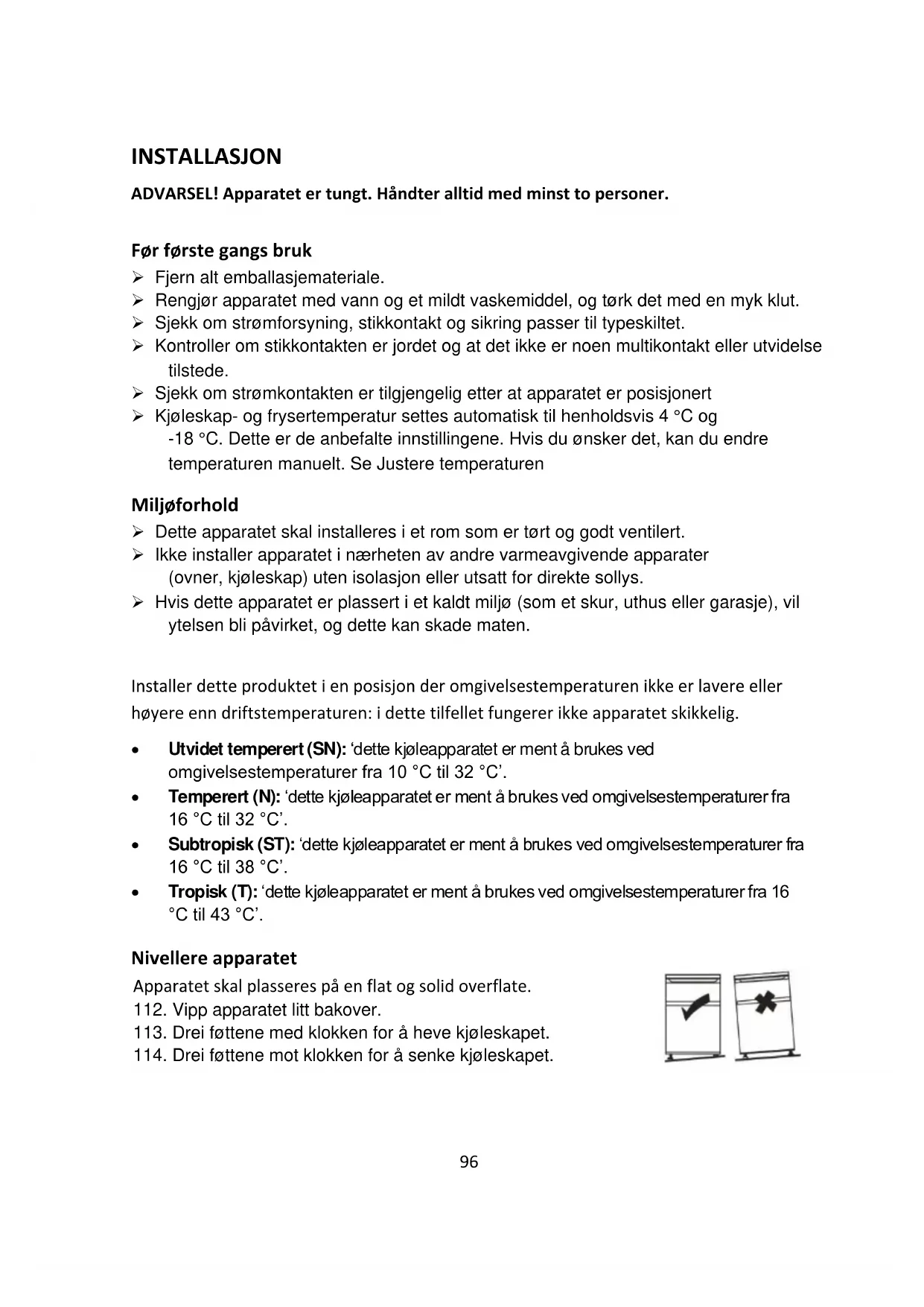 - Tropisk (T): ‘dette kjøleapparatet er ment å brukes ved omgivelsestemperaturer fra 16 °C til 43 °C’. Nivellere apparatet Apparatet skal plasseres på en flat og solid overflate.