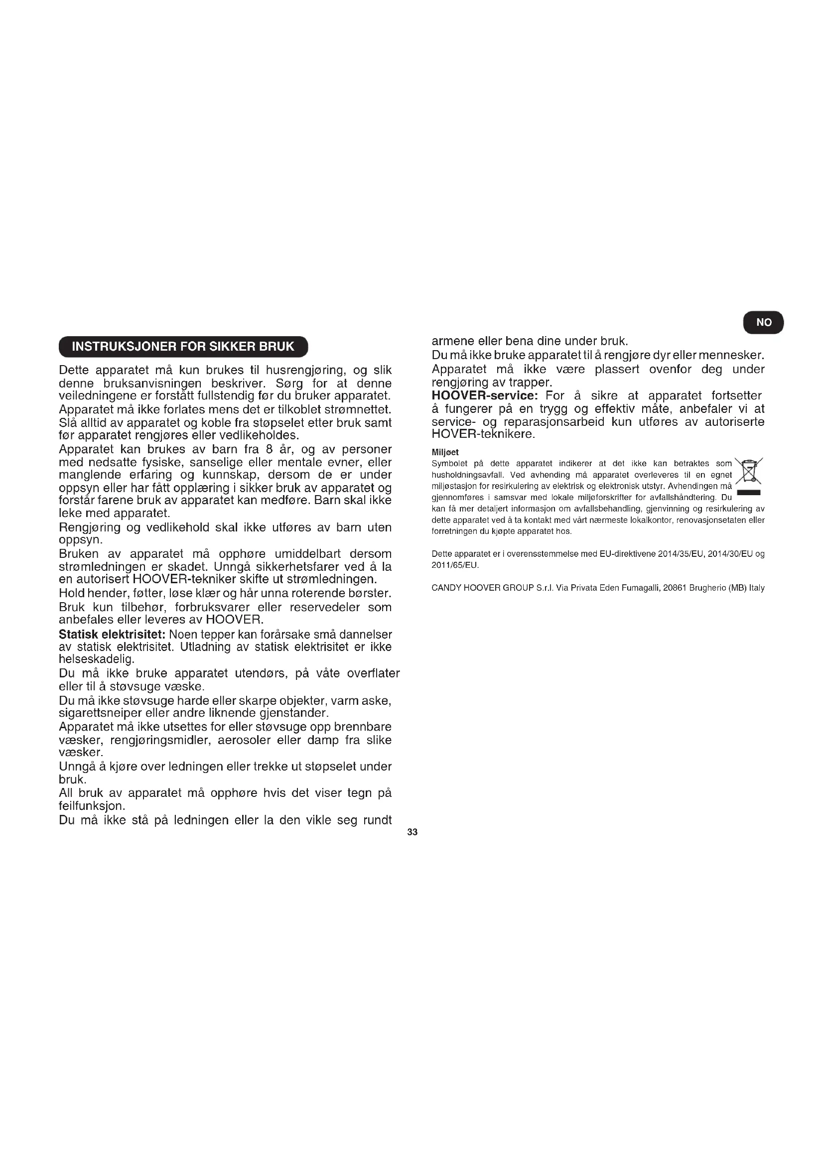 Dette apparatet må kun brukes til husrengjøring, og slik denne bruksanvisningen beskriver. Sørg for at denne veiledningene er forstått fullstendig før du bruker apparatet. Apparatet må ikke forlates mens det er tilkoblet strømnettet. Slå alltid av apparatet og koble fra støpselet etter bruk samt før apparatet rengjøres eller vedlikeholdes. Apparatet kan brukes av barn fra 8 år, og av personer med nedsatte fysiske, sanselige eller mentale evner, eller manglende erfaring og kunnskap, dersom de er under oppsyn eller har fått opplæring i sikker bruk av apparatet og forstår farene bruk av apparatet kan medføre. Barn skal ikke leke med apparatet. Rengjøring og vedlikehold skal ikke utføres av barn uten oppsyn. Bruken av apparatet må opphøre umiddelbart dersom strømledningen er skadet. Unngå sikkerhetsfarer ved å la en autorisert HOOVER-tekniker skifte ut strømledningen. Hold hender, føtter, løse klær og hår unna roterende børster. Bruk kun tilbehør, forbruksvarer eller reservedeler som anbefales eller leveres av HOOVER. Statiskelektrisitet: Noen tepper kan forårsake små dannelser av statisk elektrisitet. Utladning av statisk elektrisitet er ikke helseskadelig. Du må ikke bruke apparatet utendørs, på våte overater eller til å støvsuge væske. Du må ikke støvsuge harde eller skarpe objekter, varm aske, sigarettsneiper eller andre liknende gjenstander. Apparatet må ikke utsettes for eller støvsuge opp brennbare væsker, rengjøringsmidler, aerosoler eller damp fra slike væsker. Unngå å kjøre over ledningen eller trekke ut støpselet under bruk. All bruk av apparatet må opphøre hvis det viser tegn på feilfunksjon. Du må ikke stå på ledningen eller la den vikle seg rundt armene eller bena dine under bruk. Du må ikke bruke apparatet til å rengjøre dyr eller mennesker. Apparatet må ikke være plassert ovenfor deg under rengjøring av trapper. HOOVER-service: For å sikre at apparatet fortsetter å fungerer på en trygg og effektiv måte, anbefaler vi at service- og reparasjonsarbeid kun utføres av autoriserte HOVER-teknikere. Miljøet Symbolet på dette apparatet indikerer at det ikke kan betraktes som husholdningsavfall. Ved avhending må apparatet overleveres til en egnet miljøstasjon for resirkulering av elektrisk og elektronisk utstyr. Avhendingen må gjennomføres i samsvar med lokale miljøforskrifter for avfallshåndtering. Du kan få mer detaljert informasjon om avfallsbehandling, gjenvinning og resirkulering av dette apparatet ved å ta kontakt med vårt nærmeste lokalkontor, renovasjonsetaten eller forretningen du kjøpte apparatet hos. Dette apparatet er i overensstemmelse med EU-direktivene 2014/35/EU, 2014/30/EU og 2011/65/EU. CANDY HOOVER GROUP S.r.l. Via Privata Eden Fumagalli, 20861 Brugherio (MB) Italy NO34
