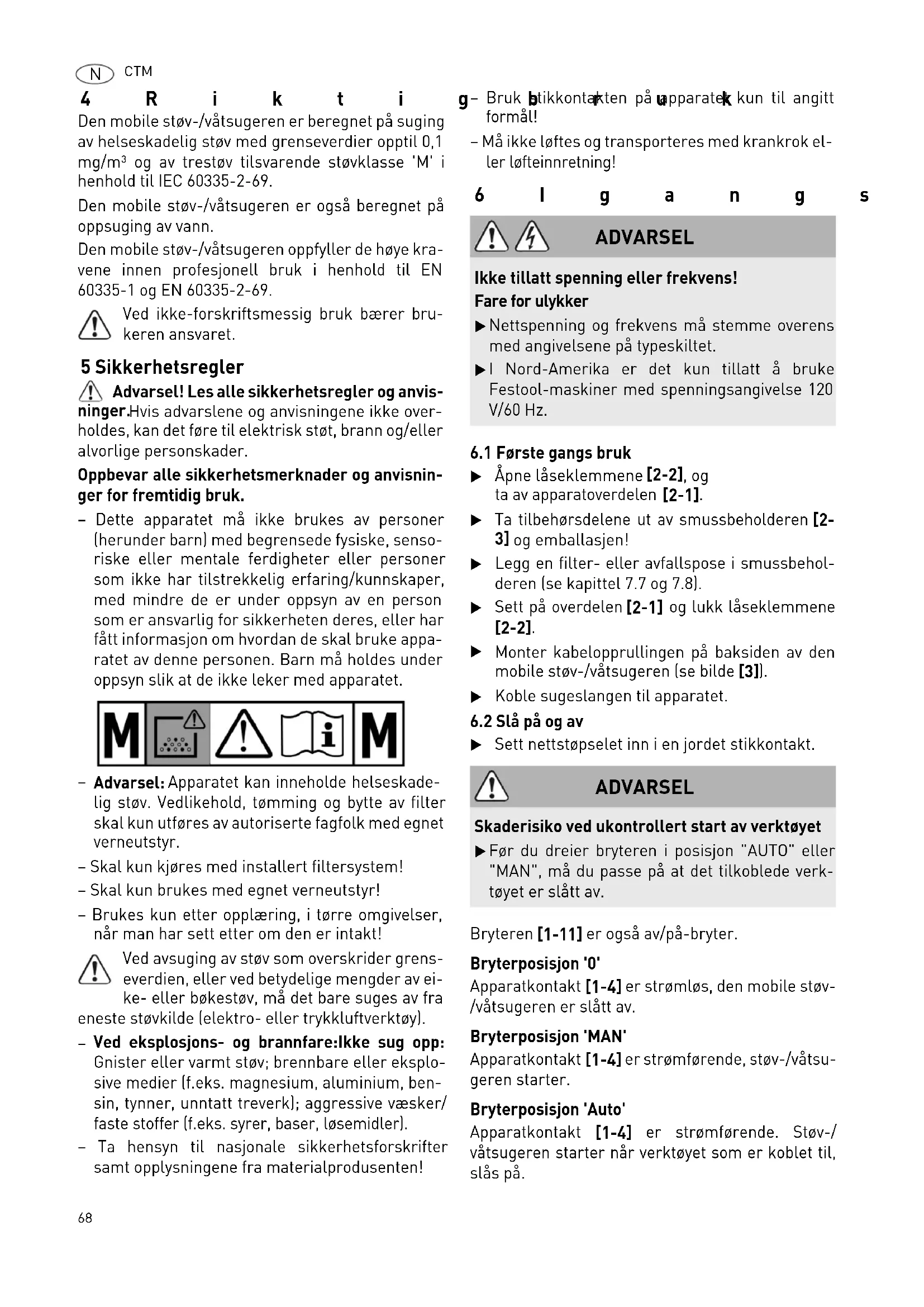Originalbruksanvisning De oppgitte illustrasjonene finnes fremst i bruks- anvisningen. 1Symboler 2Apparatets deler 3Tekniske data Advarsel mot generell fare Advarsel om elektrisk støt Anvisning/les merknader! Bruk åndedrettsvern! Advarsel! Apparatet kan inneholde helse- skadelig støv. Ikke kommunalt avfall. [1-1] Plugg [1-2] Sugeåpning [1-3] Modulkontakt (trykkluftmodul ved CTM 36 E LE, CTM 36 E LE AC, CTM 48 E LE, CTM 48 E LE AC) [1-4] Apparatkontakt [1-5] Slangedepot [1-6] Håndtak [1-7] SysDoc [1-8] Automatisk rengjøring (bare varianter med AutoClean) [1-9] Innstilling slangediameter [1-10] Sugekraftregulering [1-11] Apparatbryter [1-12] Låseklemme [1-13] Smussbeholder [1-15] Brems Mobil støv-/våtsuger Opptatt effekt 350 - 1200 W Tilslutningseffekt på verktøykontakt maks.