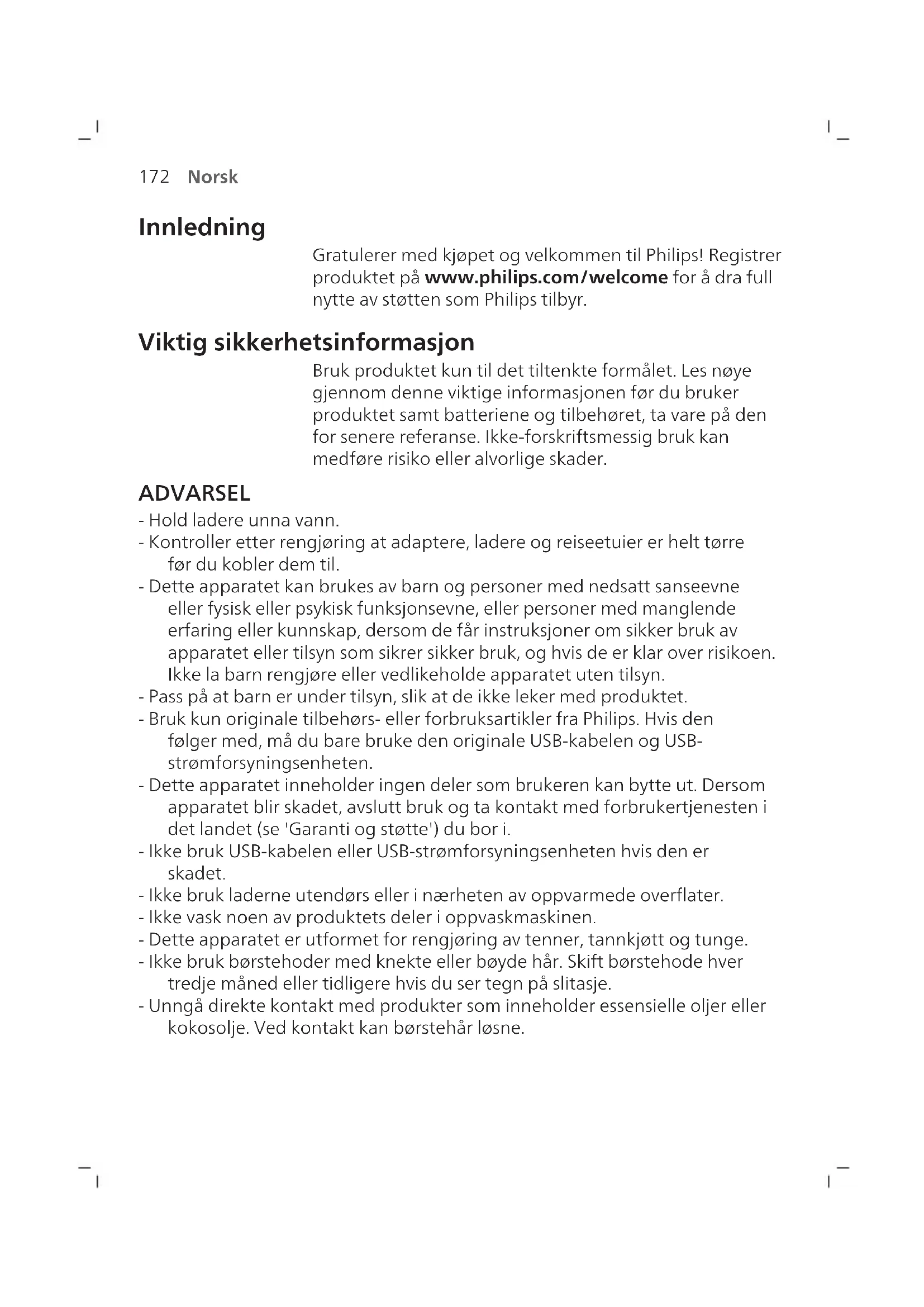 Norsk Innledning Gratulerer med kjøpet og velkommen til Philips! Registrer produktet på www.philips.com/welcome for å dra full nytte av støtten som Philips tilbyr. Viktig sikkerhetsinformasjon Bruk produktet kun til det tiltenkte formålet. Les nøye gjennom denne viktige informasjonen før du bruker produktet samt batteriene og tilbehøret, ta vare på den for senere referanse. Ikke-forskriftsmessig bruk kan medføre risiko eller alvorlige skader. ADVARSEL - Hold ladere unna vann. - Kontroller etter rengjøring at adaptere, ladere og reiseetuier er helt tørre før du kobler dem til. - Dette apparatet kan brukes av barn og personer med nedsatt sanseevne eller fysisk eller psykisk funksjonsevne, eller personer med manglende erfaring eller kunnskap, dersom de får instruksjoner om sikker bruk av apparatet eller tilsyn som sikrer sikker bruk, og hvis de er klar over risikoen. Ikke la barn rengjøre eller vedlikeholde apparatet uten tilsyn. - Pass på at barn er under tilsyn, slik at de ikke leker med produktet. - Bruk kun originale tilbehørs- eller forbruksartikler fra Philips. Hvis den følger med, må du bare bruke den originale USB-kabelen og USB- strømforsyningsenheten. - Dette apparatet inneholder ingen deler som brukeren kan bytte ut. Dersom apparatet blir skadet, avslutt bruk og ta kontakt med forbrukertjenesten i det landet (se 'Garanti og støtte') du bor i. - Ikke bruk USB-kabelen eller USB-strømforsyningsenheten hvis den er skadet. - Ikke bruk laderne utendørs eller i nærheten av oppvarmede overflater. - Ikke vask noen av produktets deler i oppvaskmaskinen. - Dette apparatet er utformet for rengjøring av tenner, tannkjøtt og tunge. - Ikke bruk børstehoder med knekte eller bøyde hår. Skift børstehode hver tredje måned eller tidligere hvis du ser tegn på slitasje. - Unngå direkte kontakt med produkter som inneholder essensielle oljer eller kokosolje. Ved kontakt kan børstehår løsne.173 Norsk MEDISINSKE ADVARSLER - Slutt å bruke apparatet og rådfør deg med tannlegen/legen din dersom det oppstår for mye blødning etter bruk, dersom blødningen vedvarer etter 1 ukes bruk eller hvis du opplever ubehag eller smerte. - Ta kontakt med tannlegen før du bruker apparatet hvis du har hatt operasjoner i tannkjøttet eller andre deler av munnen i løpet av de siste to månedene. - Hvis du har pacemaker eller en annen implantert enhet, bør du ta kontakt med legen eller produsenten av den implanterte enheten før bruk. - Ta kontakt med lege før du bruker apparatet hvis du har medisinske bekymringer. - Dette apparatet er beregnet på personlig tannhygiene. Den er ikke laget for bruk på flere pasienter på et tannlegekontor eller en institusjon.