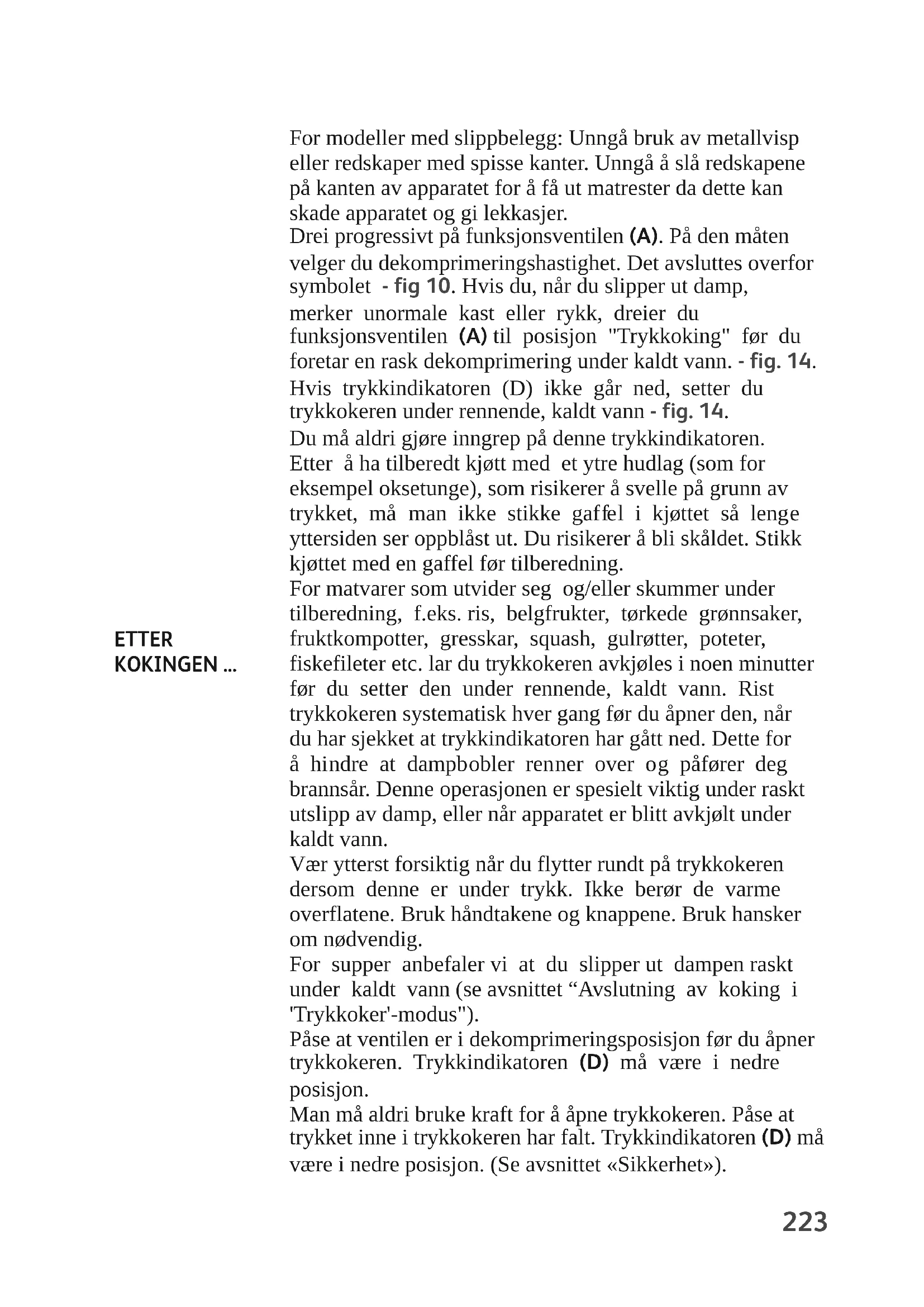 KOKINGEN Barn må holdes utenfor rekkevidde når trykkokeren er i bruk. Trykkokeren koker under trykk. Skålding kan oppstå ved feil bruk. Påse at trykkokeren er forsvarlig lukket før du tar den i bruk. (Se avsnittet «Lukking»). Påse at ventilen alltid avgir blåselyden under koking. Hvis ikke nok damp slipper ut, dekomprimer kjelen og sjekk at det er nok væske til stede. Sjekk også at dampkanalen ikke er tilstoppet. Hvis det fremdeles ikke kommer damp ut etter dette, øk varmen forsiktig. Ikke kok matvarer som kan tilstoppe sikkerhetsfunksjonene: - tyttebær - perlegryn - havregryn - gule erter - nudler, makaroni, spagetti - rabarbra - rips Aldri tilbered retter basert på melk i trykkokeren. Når du har en trykkoker med en kjele i rustfritt stål, ikke ha grovt salt i trykkokeren. Tilsett fint salt helt på slutten. Du unngår på den måten små «stikk» som kan endre bunnen på trykkokeren. Aldri bruk trykkokeren til å steke med olje under trykk. Trykkokeren skal ikke brukes til andre formål enn det den er beregnet på. Trykkokeren må aldri settes i en varm ovn. Aldri ha aluminiumsfolie som ikke er i en form, i trykkokeren. Aldri ha plastfilm i trykkokeren. Alkoholdamp kan ta fyr. Kok opp i ca. 2 minutter før du setter på lokket. Følg godt med på apparatet dersom du tilbereder oppskrifter med alkohol. Bruk kompatible varmekilder som er i samsvar med bruksanvisningen.ETTER KOKINGEN ... For modeller med slippbelegg: Unngå bruk av metallvisp eller redskaper med spisse kanter. Unngå å slå redskapene på kanten av apparatet for å få ut matrester da dette kan skade apparatet og gi lekkasjer. Drei progressivt på funksjonsventilen (A). På den måten velger du dekomprimeringshastighet. Det avsluttes overfor symbolet - fig 10. Hvis du, når du slipper ut damp, merker unormale kast eller rykk, dreier du funksjonsventilen (A) til posisjon "Trykkoking" før du foretar en rask dekomprimering under kaldt vann. - fig. 14. Hvis trykkindikatoren (D) ikke går ned, setter du trykkokeren under rennende, kaldt vann - fig. 14. Du må aldri gjøre inngrep på denne trykkindikatoren. Etter å ha tilberedt kjøtt med et ytre hudlag (som for eksempel oksetunge), som risikerer å svelle på grunn av trykket, må man ikke stikke gaffel i kjøttet så lenge yttersiden ser oppblåst ut. Du risikerer å bli skåldet. Stikk kjøttet med en gaffel før tilberedning. For matvarer som utvider seg og/eller skummer under tilberedning, f.eks. ris, belgfrukter, tørkede grønnsaker, fruktkompotter, gresskar, squash, gulrøtter, poteter, fiskefileter etc. lar du trykkokeren avkjøles i noen minutter før du setter den under rennende, kaldt vann. Rist trykkokeren systematisk hver gang før du åpner den, når du har sjekket at trykkindikatoren har gått ned. Dette for å hindre at dampbobler renner over og påfører deg brannsår. Denne operasjonen er spesielt viktig under raskt utslipp av damp, eller når apparatet er blitt avkjølt under kaldt vann. Vær ytterst forsiktig når du flytter rundt på trykkokeren dersom denne er under trykk. Ikke berør de varme overflatene. Bruk håndtakene og knappene. Bruk hansker om nødvendig. For supper anbefaler vi at du slipper ut dampen raskt under kaldt vann (se avsnittet “Avslutning av koking i 'Trykkoker'-modus"). Påse at ventilen er i dekomprimeringsposisjon før du åpner trykkokeren. Trykkindikatoren (D) må være i nedre posisjon. Man må aldri bruke kraft for å åpne trykkokeren. Påse at trykket inne i trykkokeren har falt. Trykkindikatoren (D) må være i nedre posisjon. (Se avsnittet «Sikkerhet»).
