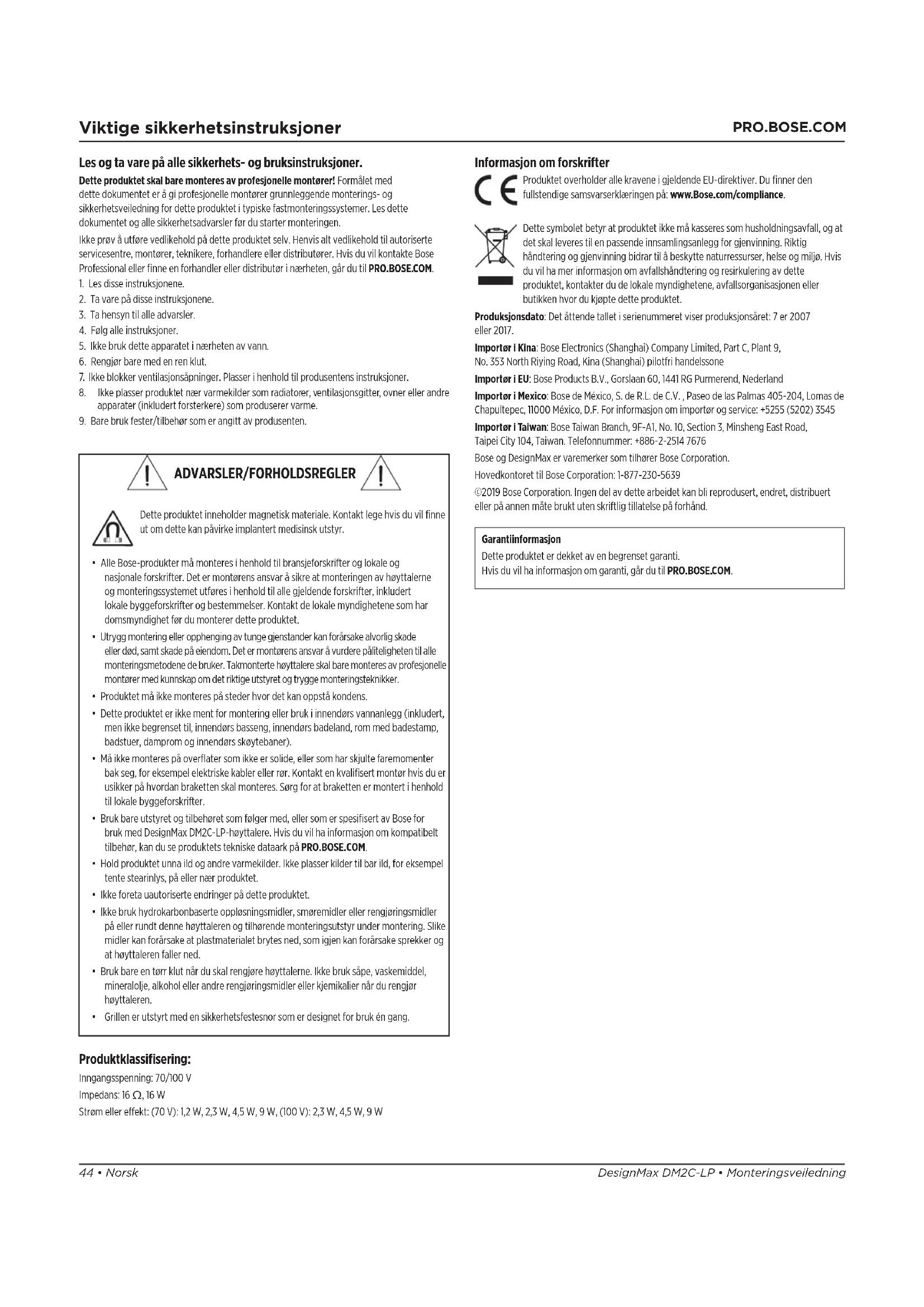 Informasjon om forskrifter Produktet overholder alle kravene i gjeldende EU-direktiver. Du finner den fullstendige samsvarserklæringen på: www.Bose.com/compliance. Dette symbolet betyr at produktet ikke må kasseres som husholdningsavfall, ogat det skal leveres til en passende innsamlingsanlegg for gjenvinning. Riktig håndtering og gjenvinning bidrar til å beskytte naturressurser, helse og miljø. Hvis du vil ha mer informasjon om avfallshåndtering og resirkulering av dette produktet, kontakter du de lokale myndighetene, avfallsorganisasjonen eller butikken hvor du kjøpte dette produktet. Produksjonsdato: Det åttende tallet i serienummeret viser produksjonsåret: 7 er 2007 eller2017. Importør i Kina: Bose Electronics (Shanghai) Company Limited, Part C, Plant 9, No. 353 North Riying Road, Kina (Shanghai) pilotfri handelssone Importør i EU: Bose Products B.V., Gorslaan 60, 1441 RG Purmerend, Nederland Importør i Mexico: Bose de México, S. de R.L. de C.V. , Paseo de las Palmas 405-204, Lomas de Chapultepec, 11000 México, D.F. For informasjon om importør og service: +5255 (5202) 3545 Importør i Taiwan: Bose Taiwan Branch, 9F-A1, No. 10, Section 3, Minsheng East Road, Taipei City 104, Taiwan. Telefonnummer: +886-2-2514 7676 Bose og DesignMax er varemerker som tilhører Bose Corporation. Hovedkontoret til Bose Corporation: 1-877-230-5639 ©2019 Bose Corporation. Ingen del av dette arbeidet kan bli reprodusert, endret, distribuert eller på annen måte brukt uten skriftlig tillatelse på forhånd. Garantiinformasjon Dette produktet er dekket av en begrenset garanti. Hvis du vil ha informasjon om garanti, går du til PRO.BOSE.COM. Produktklassifisering: Inngangsspenning: 70/100V Impedans: 16Ω, 16W Strøm eller eekt: (70V): 1,2W, 2,3W, 4,5W, 9W, (100V): 2,3W, 4,5W, 9W ADVARSLER/FORHOLDSREGLER Dette produktet inneholder magnetisk materiale. Kontakt lege hvis du vil finne ut om dette kan påvirke implantert medisinsk utstyr.