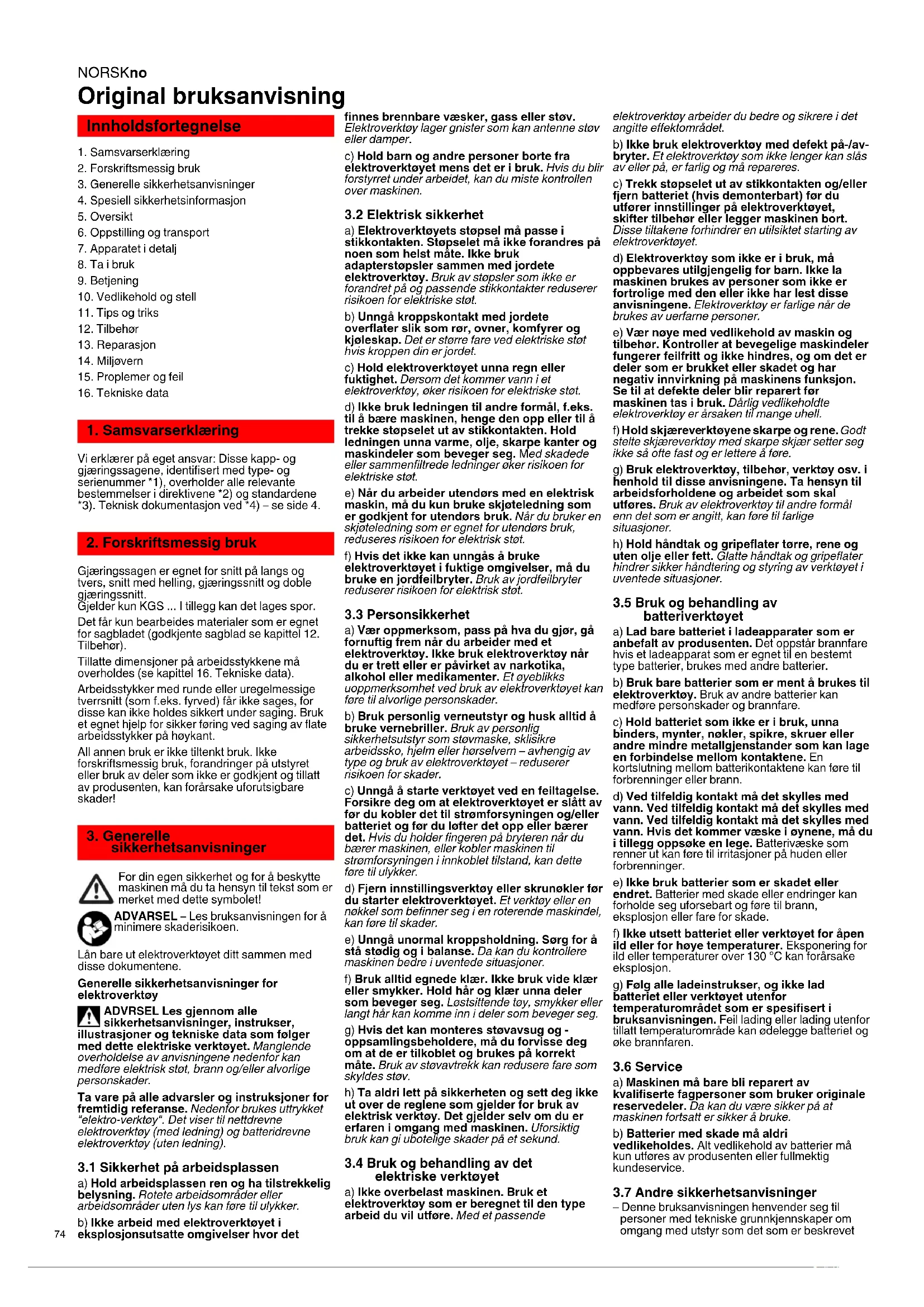 Vi erklærer på eget ansvar: Disse kapp- og gjæringssagene, identifisert med type- og serienummer *1), overholder alle relevante bestemmelser i direktivene *2) og standardene *3). Teknisk dokumentasjon ved *4) – se side 4. Gjæringssagen er egnet for snitt på langs og tvers, snitt med helling, gjæringssnitt og doble gjæringssnitt. Gjelder kun KGS ... I tillegg kan det lages spor. Det får kun bearbeides materialer som er egnet for sagbladet (godkjente sagblad se kapittel 12. Tilbehør). Tillatte dimensjoner på arbeidsstykkene må overholdes (se kapittel 16. Tekniske data). Arbeidsstykker med runde eller uregelmessige tverrsnitt (som f.eks. fyrved) får ikke sages, for disse kan ikke holdes sikkert under saging. Bruk et egnet hjelp for sikker føring ved saging av flate arbeidsstykker på høykant. All annen bruk er ikke tiltenkt bruk. Ikke forskriftsmessig bruk, forandringer på utstyret eller bruk av deler som ikke er godkjent og tillatt av produsenten, kan forårsake uforutsigbare skader! For din egen sikkerhet og for å beskytte maskinen må du ta hensyn til tekst som er merket med dette symbolet! ADVARSEL – Les bruksanvisningen for å minimere skaderisikoen. Lån bare ut elektroverktøyet ditt sammen med disse dokumentene. Generelle sikkerhetsanvisninger for elektroverktøy ADVRSEL Les gjennom alle sikkerhetsanvisninger, instrukser, illustrasjoner og tekniske data som følger med dette elektriske verktøyet. Manglende overholdelse av anvisningene nedenfor kan medføre elektrisk støt, brann og/eller alvorlige personskader. Ta vare på alle advarsler og instruksjoner for fremtidig referanse. Nedenfor brukes uttrykket "elektro-verktøy". Det viser til nettdrevne elektroverktøy (med ledning) og batteridrevne elektroverktøy (uten ledning).