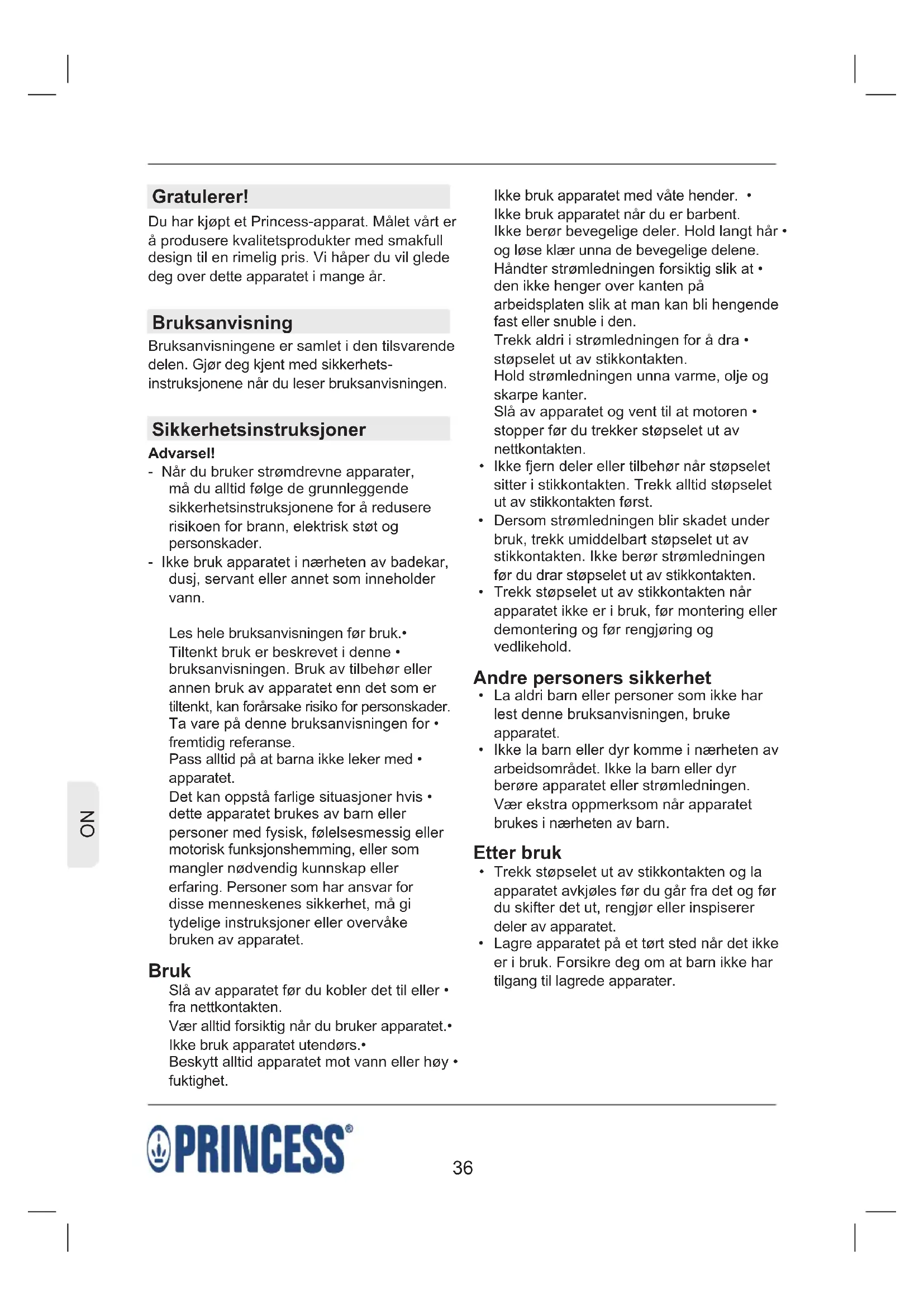 Gratulerer! Du har kjøpt et Princess-apparat. Målet vårt er å produsere kvalitetsprodukter med smakfull design til en rimelig pris. Vi håper du vil glede deg over dette apparatet i mange år. Bruksanvisning Bruksanvisningene er samlet i den tilsvarende delen. Gjør deg kjent med sikkerhets- instruksjonene når du leser bruksanvisningen. Sikkerhetsinstruksjoner Advarsel! - Når du bruker strømdrevne apparater, må du alltid følge de grunnleggende sikkerhetsinstruksjonene for å redusere risikoen for brann, elektrisk støt og personskader. - Ikke bruk apparatet i nærheten av badekar, dusj, servant eller annet som inneholder vann. Les hele bruksanvisningen før bruk.• Tiltenkt bruk er beskrevet i denne • bruksanvisningen. Bruk av tilbehør eller annen bruk av apparatet enn det som er tiltenkt, kan forårsake risiko for personskader. Ta vare på denne bruksanvisningen for • fremtidig referanse. Pass alltid på at barna ikke leker med • apparatet. Det kan oppstå farlige situasjoner hvis • dette apparatet brukes av barn eller personer med fysisk, følelsesmessig eller motorisk funksjonshemming, eller som mangler nødvendig kunnskap eller erfaring. Personer som har ansvar for disse menneskenes sikkerhet, må gi tydelige instruksjoner eller overvåke bruken av apparatet. Bruk Slå av apparatet før du kobler det til eller • fra nettkontakten. Vær alltid forsiktig når du bruker apparatet.• Ikke bruk apparatet utendørs.• Beskytt alltid apparatet mot vann eller høy • fuktighet. Ikke bruk apparatet med våte hender. • Ikke bruk apparatet når du er barbent. Ikke berør bevegelige deler. Hold langt hår • og løse klær unna de bevegelige delene. Håndter strømledningen forsiktig slik at • den ikke henger over kanten på arbeidsplaten slik at man kan bli hengende fast eller snuble i den. Trekk aldri i strømledningen for å dra • støpselet ut av stikkontakten. Hold strømledningen unna varme, olje og skarpe kanter. Slå av apparatet og vent til at motoren • stopper før du trekker støpselet ut av nettkontakten. Ikke fjern deler eller tilbehør når støpselet • sitter i stikkontakten. Trekk alltid støpselet ut av stikkontakten først. Dersom strømledningen blir skadet under • bruk, trekk umiddelbart støpselet ut av stikkontakten. Ikke berør strømledningen før du drar støpselet ut av stikkontakten. Trekk støpselet ut av stikkontakten når • apparatet ikke er i bruk, før montering eller demontering og før rengjøring og vedlikehold. Andre personers sikkerhet La aldri barn eller personer som ikke har • lest denne bruksanvisningen, bruke apparatet. Ikke la barn eller dyr komme i nærheten av • arbeidsområdet. Ikke la barn eller dyr berøre apparatet eller strømledningen. Vær ekstra oppmerksom når apparatet brukes i nærheten av barn. Etter bruk Trekk støpselet ut av stikkontakten og la • apparatet avkjøles før du går fra det og før du skifter det ut, rengjør eller inspiserer deler av apparatet. Lagre apparatet på et tørt sted når det ikke • er i bruk. Forsikre deg om at barn ikke har tilgang til lagrede apparater.37
