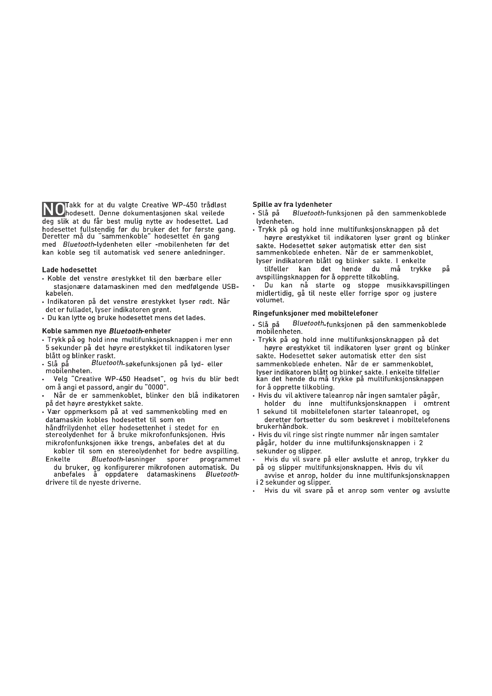 - Nettopaino: 114 g / 4 unssiaNO Takk for at du valgte Creative WP-450 trådløst hodesett. Denne dokumentasjonen skal veilede deg slik at du får best mulig nytte av hodesettet. Lad hodesettet fullstendig før du bruker det for første gang. Deretter må du “sammenkoble” hodesettet én gang med Bluetooth -lydenheten eller -mobilenheten før det kan koble seg til automatisk ved senere anledninger. Lade hodesettet