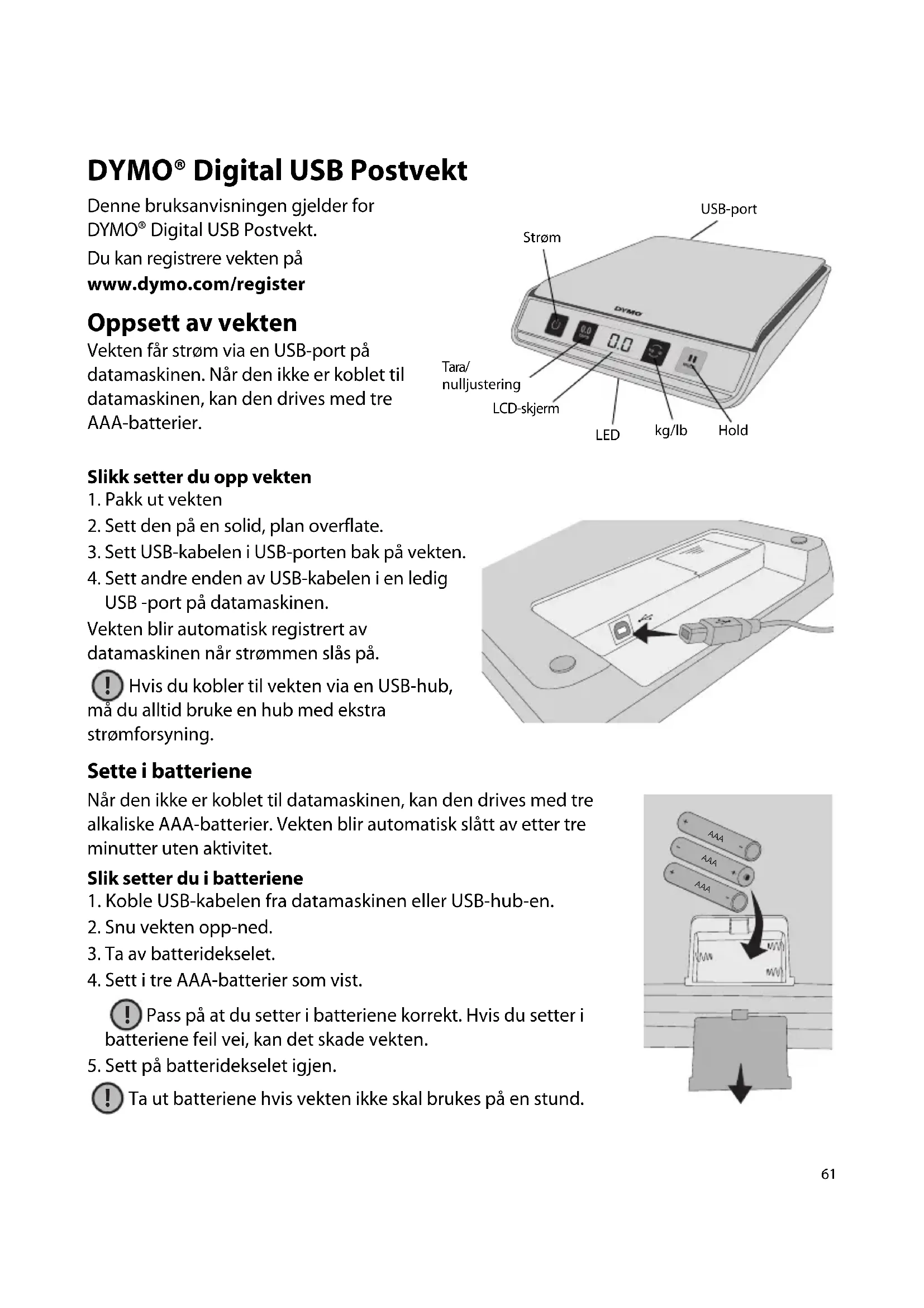USB -port på datamaskinen. Vekten blir automatisk registrert av datamaskinen når strømmen slås på. Hvis du kobler til vekten via en USB-hub, må du alltid bruke en hub med ekstra strømforsyning. Sette i batteriene Når den ikke er koblet til datamaskinen, kan den drives med tre alkaliske AAA-batterier. Vekten blir automatisk slått av etter tre minutter uten aktivitet. Slik setter du i batteriene