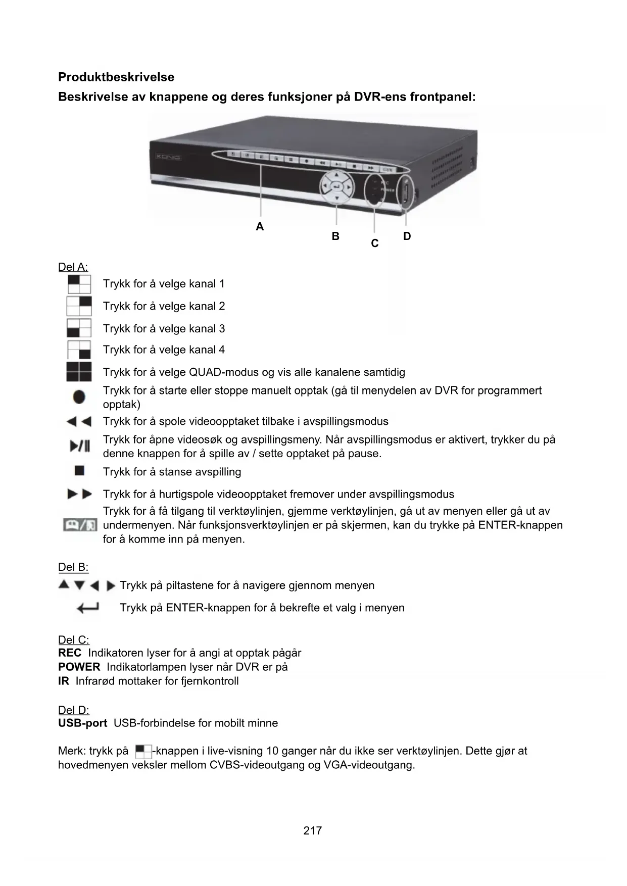 Trykk på piltastene for å navigere gjennom menyen Trykk på ENTER-knappen for å bekrefte et valg i menyen Del C: REC Indikatoren lyser for å angi at opptak pågår POWER Indikatorlampen lyser når DVR er på IR Infrarød mottaker for fjernkontroll Del D: USB-port USB-forbindelse for mobilt minne Merk: trykk på -knappen i live-visning 10 ganger når du ikke ser verktøylinjen. Dette gjør at hovedmenyen veksler mellom CVBS-videoutgang og VGA-videoutgang.