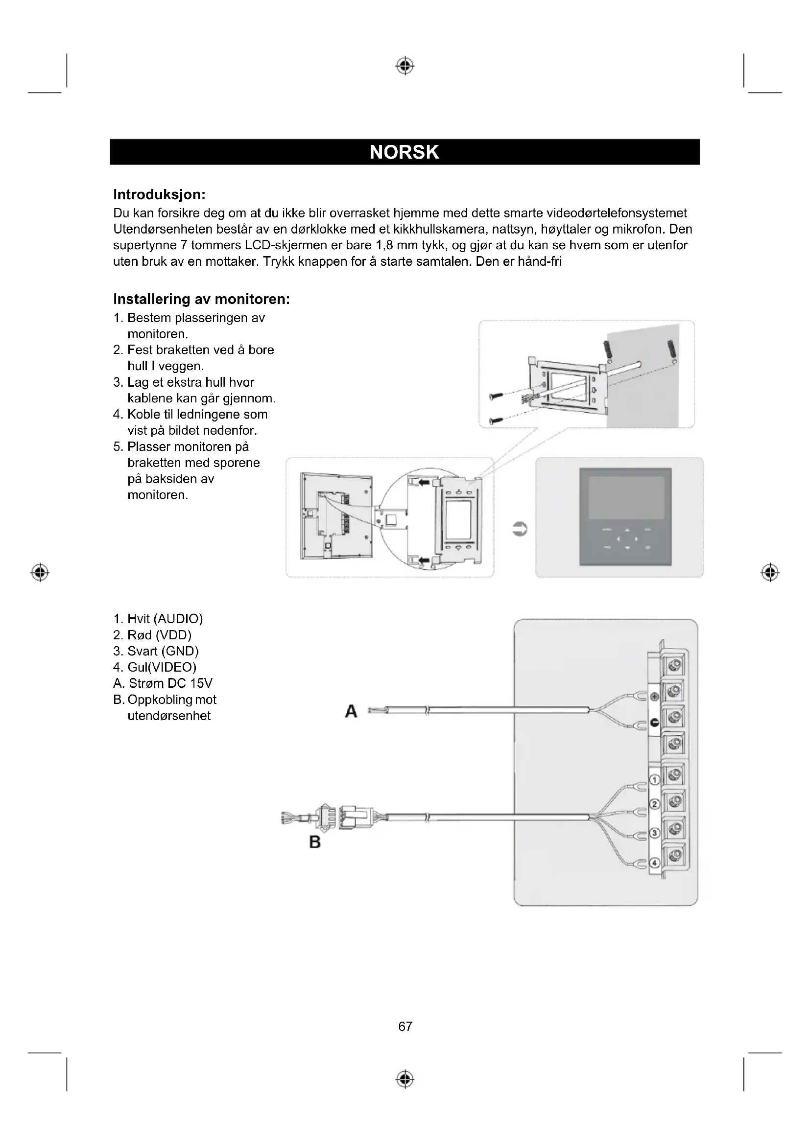 Bruk av innendørsmonitoren: Interkom Når en besøkende trykker på ringeknappen på utendørsenheten vil innendørsmonitoren gi fra seg en ding dong-lyd og aktivere monitorskjermen. Innendørsmonitorskjermen vil automatisk vise et bilde av den besøkende. Trykk på monitorknappen for å snakke med den besøkende. Når du er ferdig med å snakke med den besøkende, trykk på monitorknappen en gang til for å skru av skjermen. Eller trykk på lås-opp knappen for å åpne døra. Skjermen vil også skru seg av når knappen ikke trykkes. Monitor Trykk på monitorknappen Skjermen vil automatisk vise et bilde av utsiden av døra di. Trykk på knappen igjen for å skru av monitoren, eller så vil monitoren skru seg av på egen hånd. Meny: Trykk på monitorknappen for å komme til hovedmenyen. Bruk OPP eller NED piltastene for å velge innstilling, og bruk VENSTRE og HØYRE for å justere innstillingene. Trykk ESC-knappen for å gå ut av menyen.