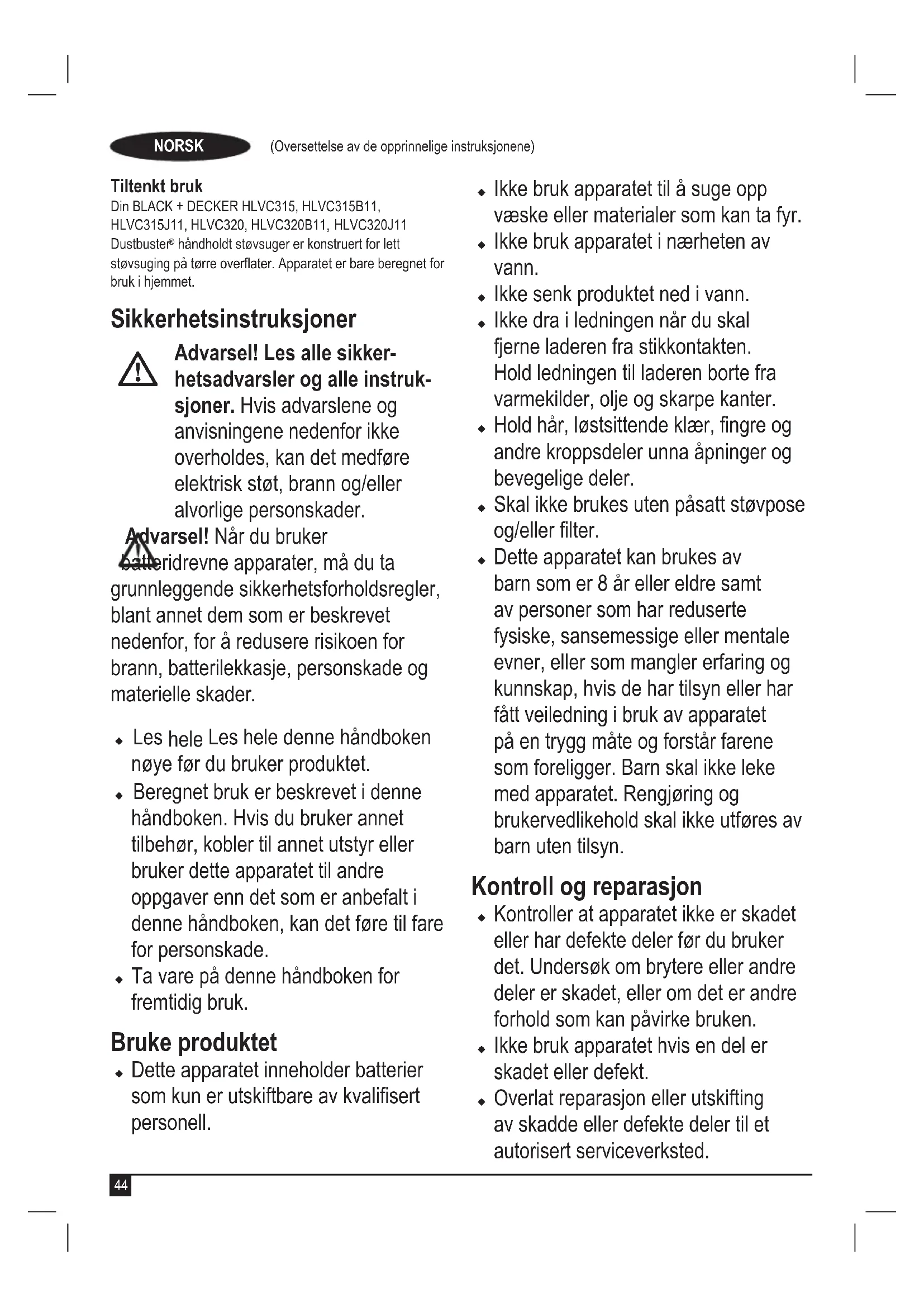 Advarsel! Les alle sikker- hetsadvarsler og alle instruk- sjoner. Hvis advarslene og anvisningene nedenfor ikke overholdes, kan det medføre elektrisk støt, brann og/eller alvorlige personskader. Advarsel! Når du bruker batteridrevne apparater, må du ta grunnleggende sikkerhetsforholdsregler, blant annet dem som er beskrevet nedenfor, for å redusere risikoen for brann, batterilekkasje, personskade og materielle skader. u Les hele Les hele denne håndboken nøye før du bruker produktet. u Beregnet bruk er beskrevet i denne håndboken. Hvis du bruker annet tilbehør, kobler til annet utstyr eller bruker dette apparatet til andre oppgaver enn det som er anbefalt i denne håndboken, kan det føre til fare for personskade. u Ta vare på denne håndboken for fremtidig bruk. Bruke produktet u Dette apparatet inneholder batterier som kun er utskiftbare av kvalisert personell. u Ikke bruk apparatet til å suge opp væske eller materialer som kan ta fyr. u Ikke bruk apparatet i nærheten av vann. u Ikke senk produktet ned i vann.u Ikke dra i ledningen når du skal fjerne laderen fra stikkontakten. Hold ledningen til laderen borte fra varmekilder, olje og skarpe kanter. u Hold hår, løstsittende klær, ngre og andre kroppsdeler unna åpninger og bevegelige deler. u Skal ikke brukes uten påsatt støvpose og/eller lter. u Dette apparatet kan brukes av barn som er 8 år eller eldre samt av personer som har reduserte fysiske, sansemessige eller mentale evner, eller som mangler erfaring og kunnskap, hvis de har tilsyn eller har fått veiledning i bruk av apparatet på en trygg måte og forstår farene som foreligger. Barn skal ikke leke med apparatet. Rengjøring og brukervedlikehold skal ikke utføres av barn uten tilsyn. Kontroll og reparasjon u Kontroller at apparatet ikke er skadet eller har defekte deler før du bruker det. Undersøk om brytere eller andre deler er skadet, eller om det er andre forhold som kan påvirke bruken. u Ikke bruk apparatet hvis en del er skadet eller defekt. u Overlat reparasjon eller utskifting av skadde eller defekte deler til et autorisert serviceverksted.45 (Oversettelse av de opprinnelige instruksjonene) NORSK u Kontroller jevnlig om ledningen til laderen er skadet. Skift ut laderen hvis ledningen er skadet eller defekt. u Forsøk aldri å fjerne eller bytte ut andre deler enn delene som er oppgitt i denne håndboken. Ytterligere sikkerhetsinstruksjoner u Når det ikke er i bruk, skal apparatet oppbevares på et tørt sted. u Barn skal ikke ha tilgang til maskiner som oppbevares. Restrisikoer Når verktøyet brukes, kan det oppstå ytterligere risikoer som kanskje ikke er beskrevet i de medfølgende sikkerhetsadvarslene. Disse risikoene kan bli forårsaket av feil bruk, langvarig bruk osv. Selv om de relevante sikkerhetsbestemmelsene blir fulgt, og sikkerhetstiltakene blir gjennomført, kan visse gjenværende risikoer ikke unngås. Disse inkluderer: u Personskader som forårsakes av berøring av bevegelige deler. u Personskader som forårsakes av berøring av varme deler. u Personskader som forårsakes av at deler eller tilbehør byttes. u Personskader som forårsakes av langvarig bruk av produktet. Når du bruker et produkt i lange perioder, må du sørge for å ta regelmessige pauser. u Helsefarer som skyldes innånding av støv som dannes når du bruker verktøyet (for eksempel under arbeid med tre, spesielt eik, bøk og MDF.) Batterier og ladere Batterier u Forsøk aldri å åpne av noen årsak. u Ikke utsett batteriet for vann. u Ikke utsett batteriet for varme. u Ikke oppbevar det på steder hvor temperaturen kan komme over 40 °C. u Skal bare lades ved omgivelsestemperaturer mellom 10 °C og 40 °C. u Bruk bare ladere av typen som følger med apparatet/verktøyet. Hvis du bruker feil lader, kan dette føre til et elektrisk støt eller at batteriet overopphetes. u Følg instruksjonene i avsnittet «Miljøvern» når du skal kaste batterier. u Ikke skad eller deformer batteripakken ved punktering eller støt, da dette kan føre til risiko for personskade og brann. u Ikke lad skadede batterier. u Under ekstreme forhold kan batterilekkasje forekomme. Hvis du oppdager væske på batteriene, må du tørke den forsiktig av med en klut. Unngå kontakt med huden. u Hvis væsken kommer i kontakt med huden eller øynene, følger du instruksjonene nedenfor. Advarsel! Batterivæsken kan føre til personskade eller skade på eiendom.46 (Oversettelse av de opprinnelige instruksjonene) NORSK Ved hudkontakt skyller du umiddelbart med vann. Hvis huden blir rød eller irritert eller smerter inntreffer, søk øyeblikkelig medisinsk hjelp. Hvis væsken kommer i kontakt med øynene, skyller du umiddelbart med rent vann og søker øyeblikkelig medisinsk hjelp. Ladere Laderen er konstruert for en bestemt spenning. Kontroller alltid at nettspenningen er i overensstemmelse med spenningen på typeskiltet og angivelsene under tekniske data. Advarsel! Ikke skift ut laderen med et vanlig nettstøpsel. u BLACK+DECKER-laderen skal bare brukes til å lade batteriet i maskinen/ verktøyet som laderen kom sammen med. Andre batterier kan sprekke og føre til personskade og materiell skade. u Prøv aldri å lade ikke-oppladbare batterier. u Hvis strømledningen blir skadet, må den byttes av produsenten eller et autorisert BLACK+DECKER- servicesenter for å unngå fare. u Ikke utsett laderen for vann.u Ikke åpne laderen.u Ikke stikk gjenstander eller ngre inn i laderen. u Apparatet/verktøyet/batteriet må plasseres på et sted med god lufting når det lades. Elektrisk sikkerhet Laderen er konstruert for en bestemt spenning. Kontroller alltid at nettspenningen er i overensstemmelse med spenningen på typeskiltet. kke skift ut laderen med et vanlig nettstøpsel. Symboler på laderen Les hele denne håndboken nøye før du bruker produktet.