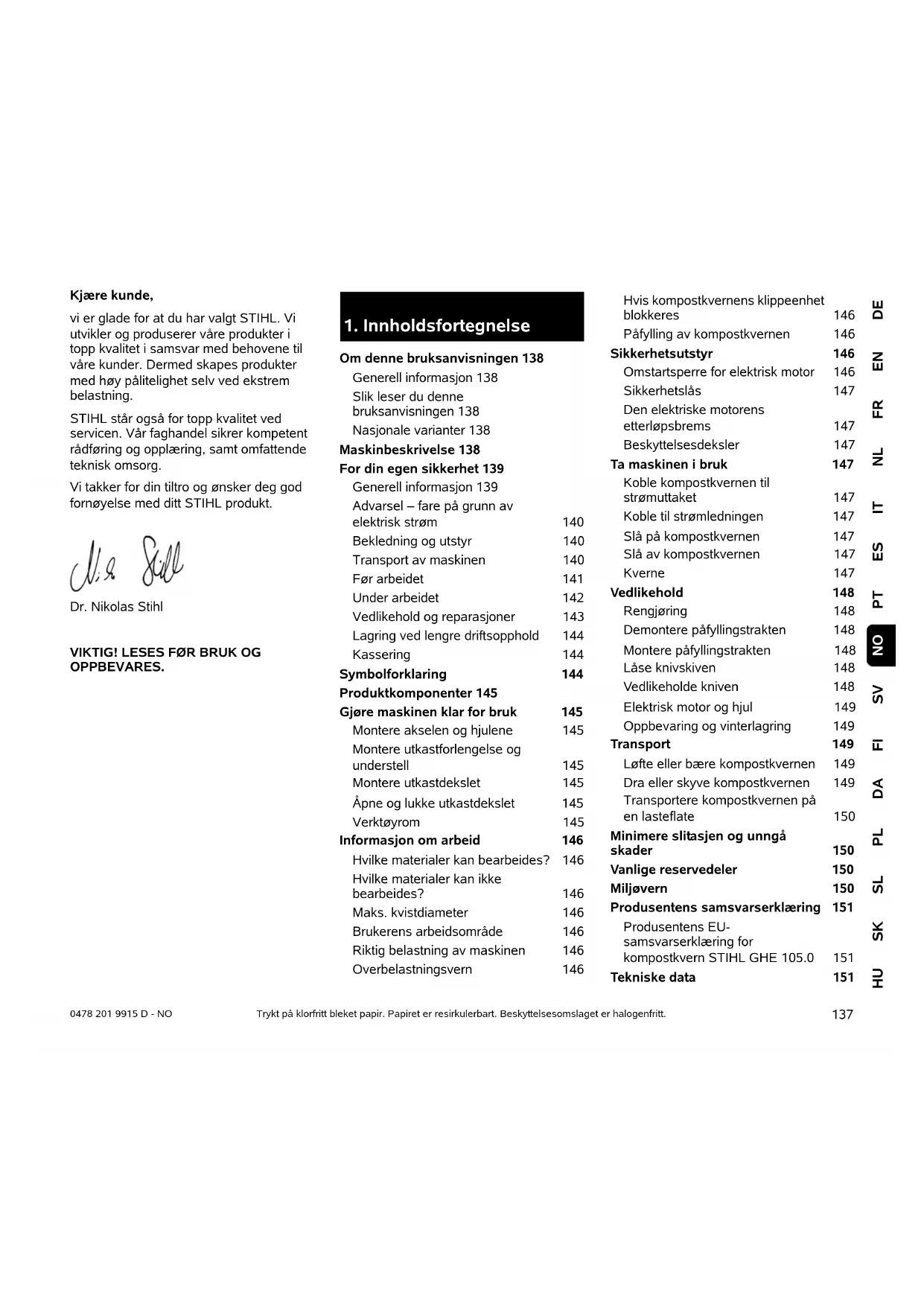 Om denne bruksanvisningen 138 Generell informasjon 138 Slik leser du denne bruksanvisningen 138 Nasjonale varianter 138 Maskinbeskrivelse 138 For din egen sikkerhet 139 Generell informasjon 139 Advarsel – fare på grunn av elektrisk strøm 140 Bekledning og utstyr 140 Transport av maskinen 140 Før arbeidet 141 Under arbeidet 142 Vedlikehold og reparasjoner 143 Lagring ved lengre driftsopphold 144 Kassering 144 Symbolforklaring 144 Produktkomponenter 145 Gjøre maskinen klar for bruk 145 Montere akselen og hjulene 145 Montere utkastforlengelse og understell 145 Montere utkastdekslet 145 Åpne og lukke utkastdekslet 145 Verktøyrom 145 Informasjon om arbeid 146 Hvilke materialer kan bearbeides? 146 Hvilke materialer kan ikke bearbeides? 146 Maks. kvistdiameter 146 Brukerens arbeidsområde 146 Riktig belastning av maskinen 146 Overbelastningsvern 146 Hvis kompostkvernens klippeenhet blokkeres 146 Påfylling av kompostkvernen 146 Sikkerhetsutstyr 146 Omstartsperre for elektrisk motor 146 Sikkerhetslås 147 Den elektriske motorens etterløpsbrems 147 Beskyttelsesdeksler 147 Ta maskinen i bruk 147 Koble kompostkvernen til strømuttaket 147 Koble til strømledningen 147 Slå på kompostkvernen 147 Slå av kompostkvernen 147 Kverne 147 Vedlikehold 148 Rengjøring 148 Demontere påfyllingstrakten 148 Montere påfyllingstrakten 148 Låse knivskiven 148 Vedlikeholde kniven 148 Elektrisk motor og hjul 149 Oppbevaring og vinterlagring 149 Transport 149 Løfte eller bære kompostkvernen 149 Dra eller skyve kompostkvernen 149 Transportere kompostkvernen på en lasteflate 150 Minimere slitasjen og unngå skader 150 Vanlige reservedeler 150 Miljøvern 150 Produsentens samsvarserklæring 151 Produsentens EU- samsvarserklæring for kompostkvern STIHL GHE 105.0 151 Tekniske data 1510478 201 9915 D - NO