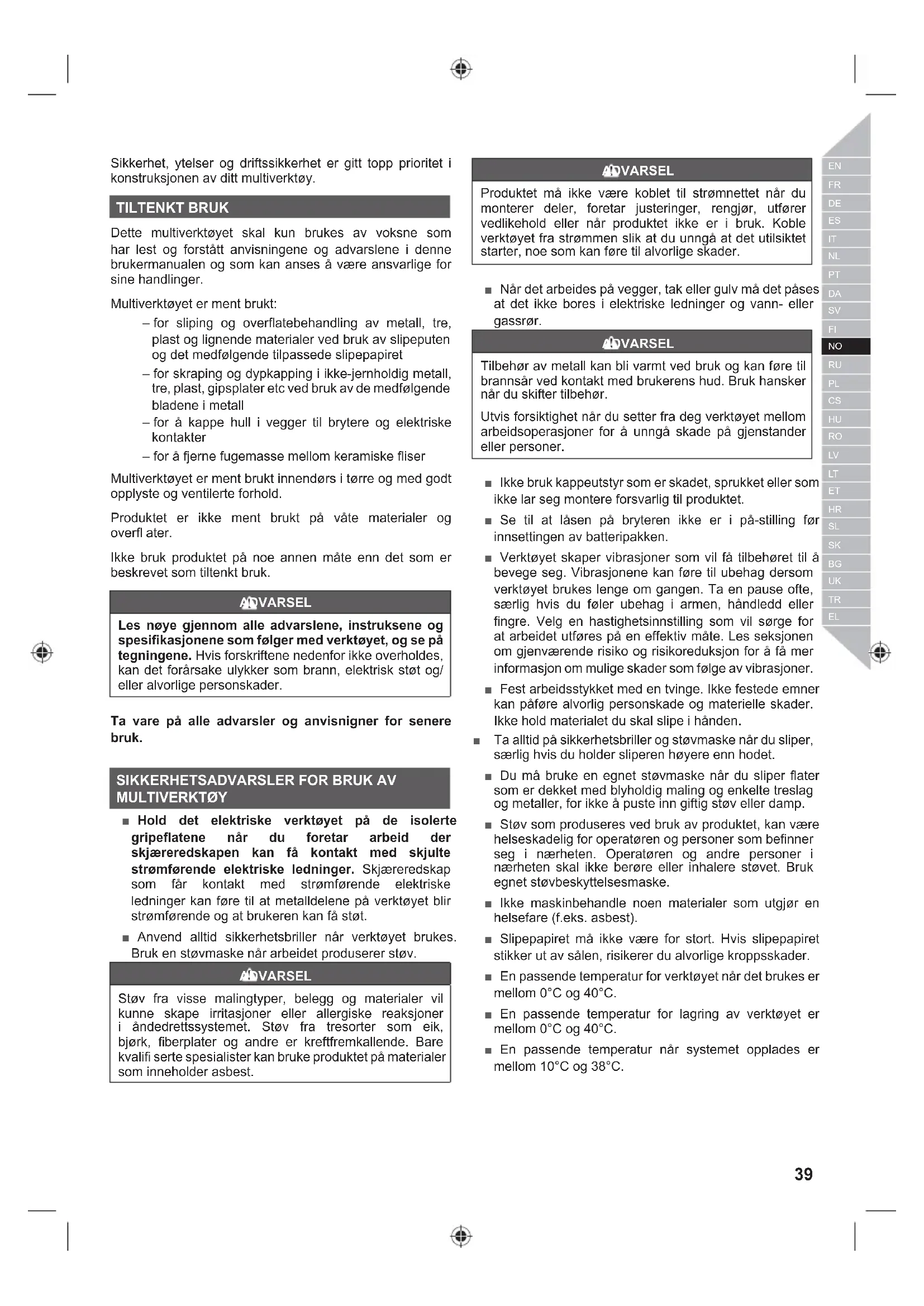 MULTIVERKTØY ■ Hold det elektriske verktøyet på de isolerte gripeflatene når du foretar arbeid der skjæreredskapen kan få kontakt med skjulte strømførende elektriske ledninger. Skjæreredskap som får kontakt med strømførende elektriske ledninger kan føre til at metalldelene på verktøyet blir strømførende og at brukeren kan få støt. ■ Anvend alltid sikkerhetsbriller når verktøyet brukes. Bruk en støvmaske når arbeidet produserer støv. ADVARSEL Støv fra visse malingtyper, belegg og materialer vil kunne skape irritasjoner eller allergiske reaksjoner i åndedrettssystemet. Støv fra tresorter som eik, bjørk, fi berplater og andre er kreftfremkallende. Bare kvalifi serte spesialister kan bruke produktet på materialer som inneholder asbest. ADVARSEL Produktet må ikke være koblet til strømnettet når du monterer deler, foretar justeringer, rengjør, utfører vedlikehold eller når produktet ikke er i bruk. Koble verktøyet fra strømmen slik at du unngå at det utilsiktet starter, noe som kan føre til alvorlige skader. ■ Når det arbeides på vegger, tak eller gulv må det påses at det ikke bores i elektriske ledninger og vann- eller gassrør. ADVARSEL Tilbehør av metall kan bli varmt ved bruk og kan føre til brannsår ved kontakt med brukerens hud. Bruk hansker når du skifter tilbehør. Utvis forsiktighet når du setter fra deg verktøyet mellom arbeidsoperasjoner for å unngå skade på gjenstander eller personer. ■ Ikke bruk kappeutstyr som er skadet, sprukket eller som ikke lar seg montere forsvarlig til produktet. ■ Se til at låsen på bryteren ikke er i på-stilling før innsettingen av batteripakken. ■ Verktøyet skaper vibrasjoner som vil få tilbehøret til å bevege seg. Vibrasjonene kan føre til ubehag dersom verktøyet brukes lenge om gangen. Ta en pause ofte, særlig hvis du føler ubehag i armen, håndledd eller fingre. Velg en hastighetsinnstilling som vil sørge for at arbeidet utføres på en effektiv måte. Les seksjonen om gjenværende risiko og risikoreduksjon for å få mer informasjon om mulige skader som følge av vibrasjoner. ■ Fest arbeidsstykket med en tvinge. Ikke festede emner kan påføre alvorlig personskade og materielle skader. Ikke hold materialet du skal slipe i hånden. ■ Ta alltid på sikkerhetsbriller og støvmaske når du sliper, særlig hvis du holder sliperen høyere enn hodet. ■ Du må bruke en egnet støvmaske når du sliper flater som er dekket med blyholdig maling og enkelte treslag og metaller, for ikke å puste inn giftig støv eller damp. ■ Støv som produseres ved bruk av produktet, kan være helseskadelig for operatøren og personer som befinner seg i nærheten. Operatøren og andre personer i nærheten skal ikke berøre eller inhalere støvet. Bruk egnet støvbeskyttelsesmaske. ■ Ikke maskinbehandle noen materialer som utgjør en helsefare (f.eks. asbest). ■ Slipepapiret må ikke være for stort. Hvis slipepapiret stikker ut av sålen, risikerer du alvorlige kroppsskader. ■ En passende temperatur for verktøyet når det brukes er mellom 0°C og 40°C. ■ En passende temperatur for lagring av verktøyet er mellom 0°C og 40°C. ■ En passende temperatur når systemet opplades er mellom 10°C og 38°C. 39 Norsk |