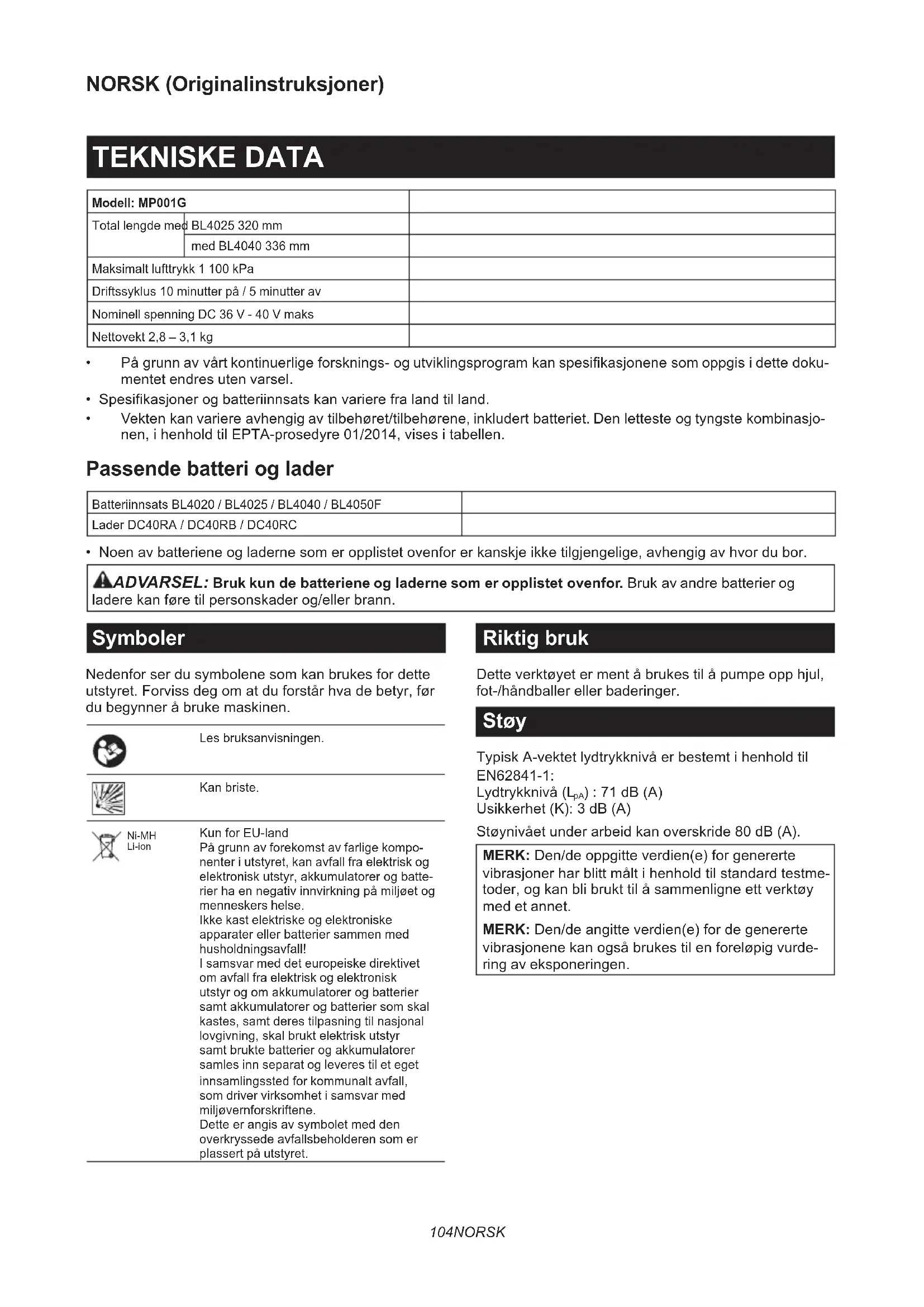 - Noen av batteriene og laderne som er opplistet ovenfor er kanskje ikke tilgjengelige, avhengig av hvor du bor. ADVARSEL: Bruk kun de batteriene og laderne som er opplistet ovenfor. Bruk av andre batterier og ladere kan føre til personskader og/eller brann. Symboler Nedenfor ser du symbolene som kan brukes for dette utstyret. Forviss deg om at du forstår hva de betyr, før du begynner å bruke maskinen. Les bruksanvisningen. Kan briste. Ni-MH Li-ion Kun for EU-land På grunn av forekomst av farlige kompo- nenter i utstyret, kan avfall fra elektrisk og elektronisk utstyr, akkumulatorer og batte- rier ha en negativ innvirkning på miljøet og menneskers helse. Ikke kast elektriske og elektroniske apparater eller batterier sammen med husholdningsavfall! I samsvar med det europeiske direktivet om avfall fra elektrisk og elektronisk utstyr og om akkumulatorer og batterier samt akkumulatorer og batterier som skal kastes, samt deres tilpasning til nasjonal lovgivning, skal brukt elektrisk utstyr samt brukte batterier og akkumulatorer samles inn separat og leveres til et eget innsamlingssted for kommunalt avfall, som driver virksomhet i samsvar med miljøvernforskriftene. Dette er angis av symbolet med den overkryssede avfallsbeholderen som er plassert på utstyret. Riktig bruk Dette verktøyet er ment å brukes til å pumpe opp hjul, fot-/håndballer eller baderinger. Støy Typisk A-vektet lydtrykknivå er bestemt i henhold til EN62841-1: Lydtrykknivå (L
