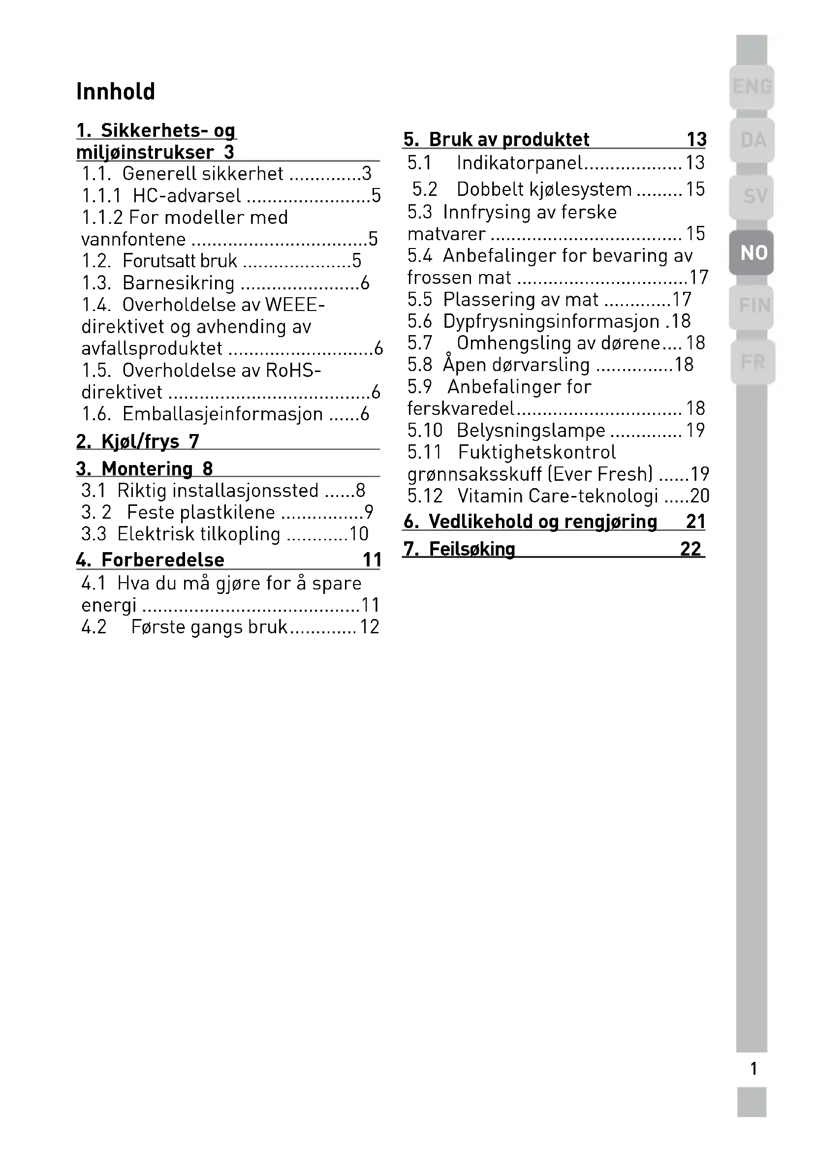 ADVARSEL: Ikke oppbevar eksplosive stoffer, slik som aerosolbokser med antennelig drivmiddel i dette apparatet. Dette apparatet er beregnet til bruk i husholdninger og lignende bruksområder som f.eks. – kjøkkenområder med ansatte i butikker, kontorer og andre arbeidsmiljøer; – gårdshus og av kunder i hoteller, moteller og andre typer boligmiljøer; – overnattingssteder med frokost; – catering og lignende bruksområder utenom detaljhandel. 1.1. Generell sikkerhet