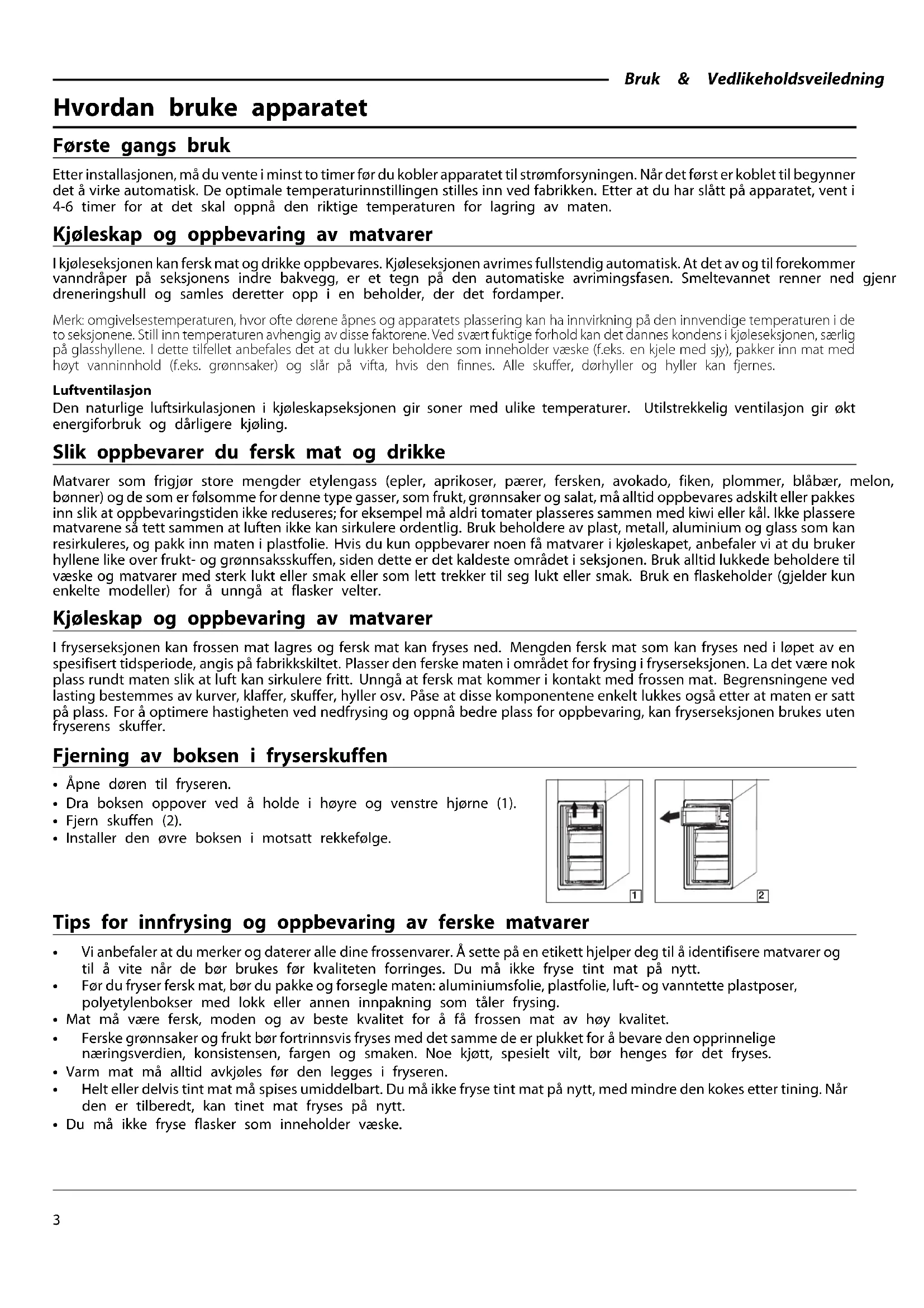 Hvordan bruke apparatet Første gangs bruk Etter installasjonen, må du vente i minst to timer før du kobler apparatet til strømforsyningen. Når det først er koblet til begynner det å virke automatisk. De optimale temperaturinnstillingen stilles inn ved fabrikken. Etter at du har slått på apparatet, vent i 4-6 timer for at det skal oppnå den riktige temperaturen for lagring av maten. Kjøleskap og oppbevaring av matvarer I kjøleseksjonen kan fersk mat og drikke oppbevares. Kjøleseksjonen avrimes fullstendig automatisk. At det av og til forekommer vanndråper på seksjonens indre bakvegg, er et tegn på den automatiske avrimingsfasen. Smeltevannet renner ned gjennom et dreneringshull og samles deretter opp i en beholder, der det fordamper. Merk: omgivelsestemperaturen, hvor ofte dørene åpnes og apparatets plassering kan ha innvirkning på den innvendige temperaturen i de to seksjonene. Still inn temperaturen avhengig av disse faktorene. Ved svært fuktige forhold kan det dannes kondens i kjøleseksjonen, særlig på glasshyllene. I dette tilfellet anbefales det at du lukker beholdere som inneholder væske (f.eks. en kjele med sjy), pakker inn mat med høyt vanninnhold (f.eks. grønnsaker) og slår på vifta, hvis den finnes. Alle skuffer, dørhyller og hyller kan fjernes. Luftventilasjon Den naturlige luftsirkulasjonen i kjøleskapseksjonen gir soner med ulike temperaturer. Utilstrekkelig ventilasjon gir økt energiforbruk og dårligere kjøling. Slik oppbevarer du fersk mat og drikke Matvarer som frigjør store mengder etylengass (epler, aprikoser, pærer, fersken, avokado, fiken, plommer, blåbær, melon, bønner) og de som er følsomme for denne type gasser, som frukt, grønnsaker og salat, må alltid oppbevares adskilt eller pakkes inn slik at oppbevaringstiden ikke reduseres; for eksempel må aldri tomater plasseres sammen med kiwi eller kål. Ikke plassere matvarene så tett sammen at luften ikke kan sirkulere ordentlig. Bruk beholdere av plast, metall, aluminium og glass som kan resirkuleres, og pakk inn maten i plastfolie. Hvis du kun oppbevarer noen få matvarer i kjøleskapet, anbefaler vi at du bruker hyllene like over frukt- og grønnsaksskuffen, siden dette er det kaldeste området i seksjonen. Bruk alltid lukkede beholdere til væske og matvarer med sterk lukt eller smak eller som lett trekker til seg lukt eller smak. Bruk en flaskeholder (gjelder kun enkelte modeller) for å unngå at flasker velter. Kjøleskap og oppbevaring av matvarer I fryserseksjonen kan frossen mat lagres og fersk mat kan fryses ned. Mengden fersk mat som kan fryses ned i løpet av en spesifisert tidsperiode, angis på fabrikkskiltet. Plasser den ferske maten i området for frysing i fryserseksjonen. La det være nok plass rundt maten slik at luft kan sirkulere fritt. Unngå at fersk mat kommer i kontakt med frossen mat. Begrensningene ved lasting bestemmes av kurver, klaffer, skuffer, hyller osv. Påse at disse komponentene enkelt lukkes også etter at maten er satt på plass. For å optimere hastigheten ved nedfrysing og oppnå bedre plass for oppbevaring, kan fryserseksjonen brukes uten fryserens skuffer. Fjerning av boksen i fryserskuffen