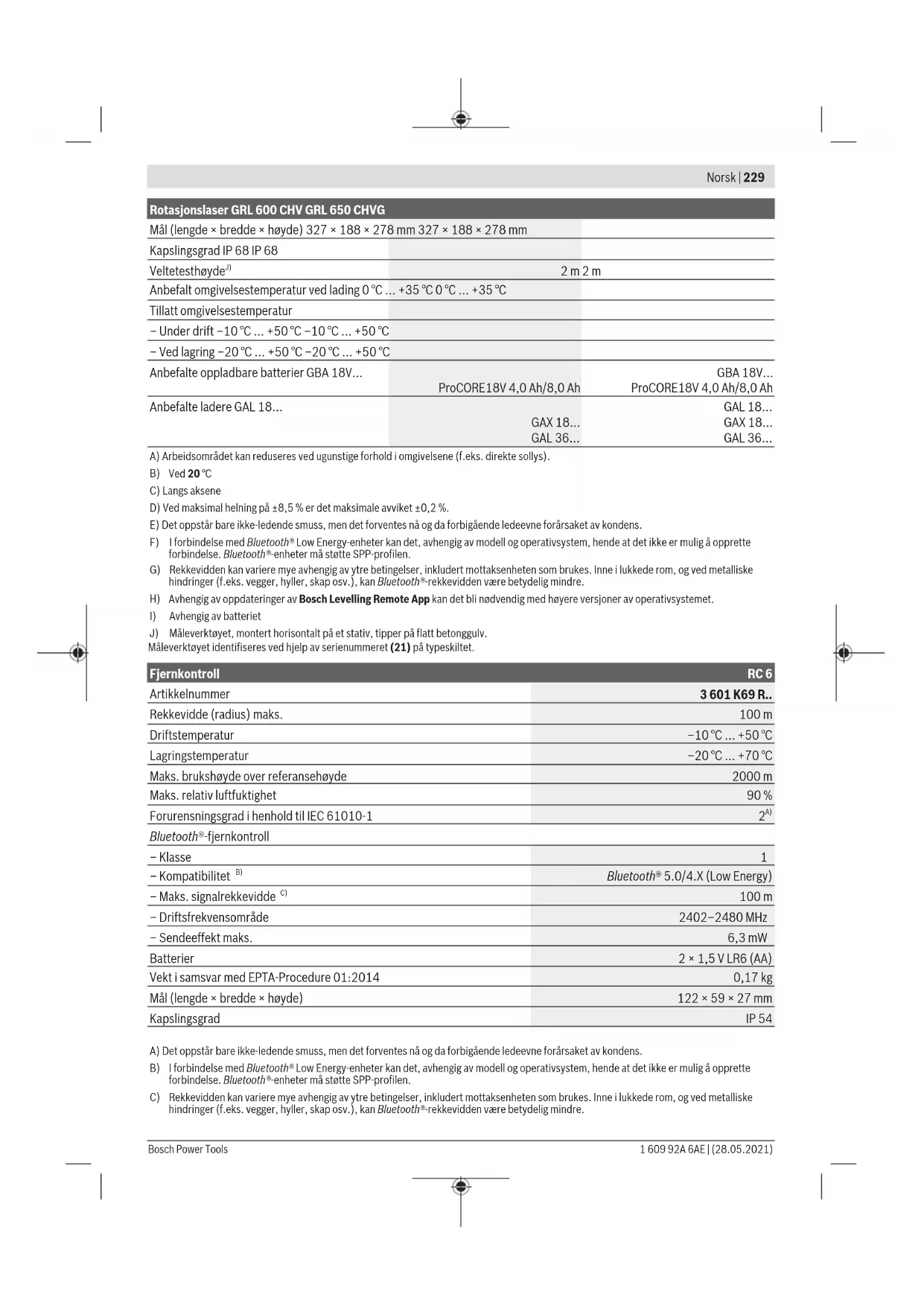 ● ● ● ● ● ● Hvilemodus ● ● ● – – ● Slå på tastelås – – – – – ● Slå av tastelås ● ● – – – ● Rotasjons-, linje- og punktmodus ● ● ● – – ● Dreie linje/punkt i rotasjonsplanet ● ● ● – – ● Dreining av rotasjonsplanet i vertikal posisjon ● ● ● – – ● Automatisk loddpunktfunksjon ned i vertikal stilling – – ● – – ● Slå på/av støtvarslingsfunksjon ● ● – – – ● Bosch Power Tools 1 609 92A 6AE | (28.05.2021)244 | Norsk Funksjon GRL 600 CHV GRL 650 CHVG RC 6 LR 60 LR 65G Bosch Levelling Remote App Endre følsomhet for støtvarslingsfunksjon – ● – – – ● Helningsmodus ● ● ● – – ● EndreSlopeProtect (GRL650CHVG) – – – – – ● Manuell modus ● ● – – – ● ModusCenterFind – – – ● ● – ModusCenterLock – – – – ● – Partiell projeksjon – – – – – ● Kalibrering X‑ og Y‑akse (horisontal stilling)