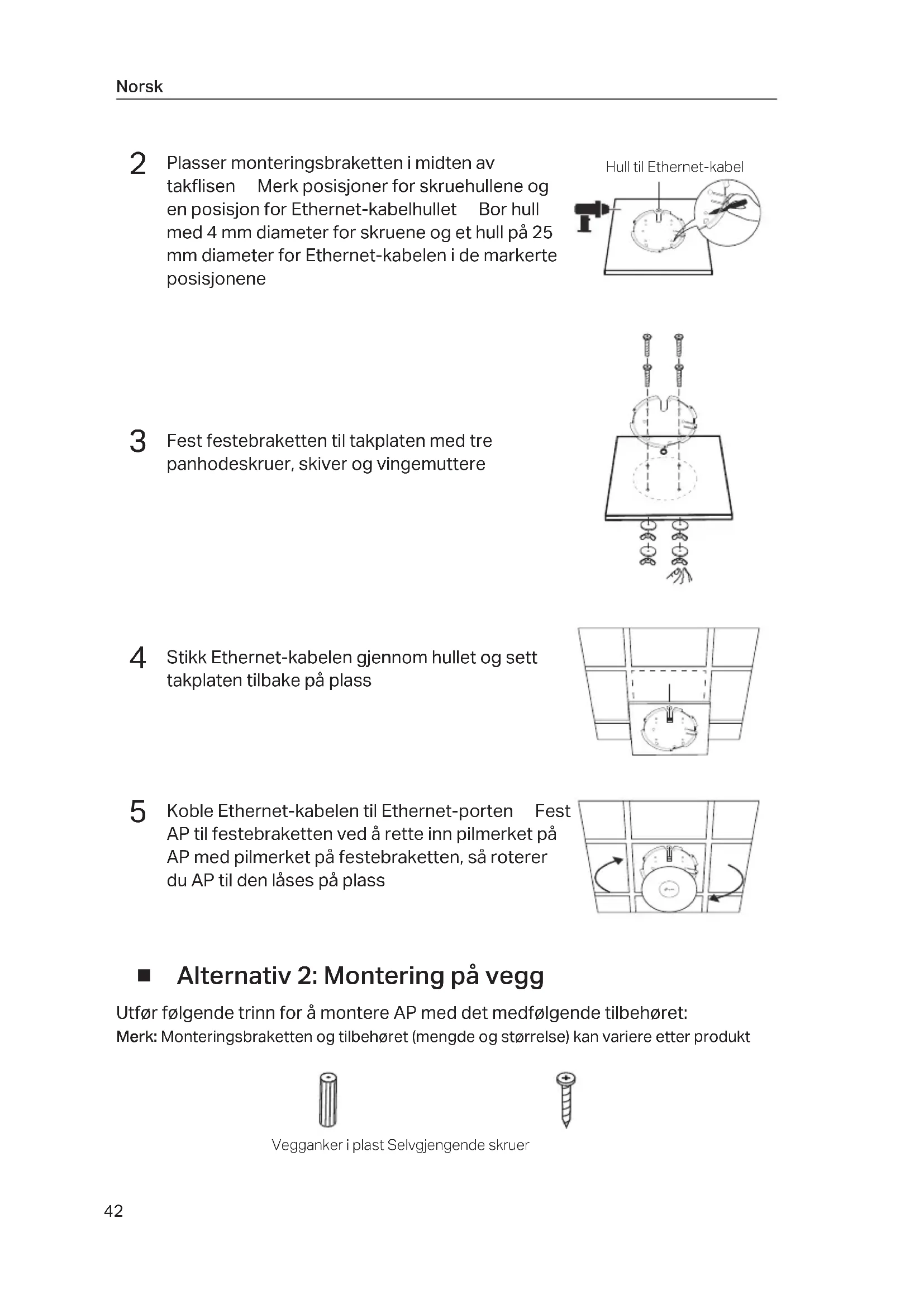 Koble Ethernet-kabelen til Ethernet-porten Fest AP til festebraketten ved å rette inn pilmerket på AP med pilmerket på festebraketten, så roterer du AP til den låses på plass ■ Alternativ 2: Montering på vegg Utfør følgende trinn for å montere AP med det medfølgende tilbehøret: Merk: Monteringsbraketten og tilbehøret (mengde og størrelse) kan variere etter produkt Vegganker i plast Selvgjengende skruerHull til Ethernet-kabel43 Norsk