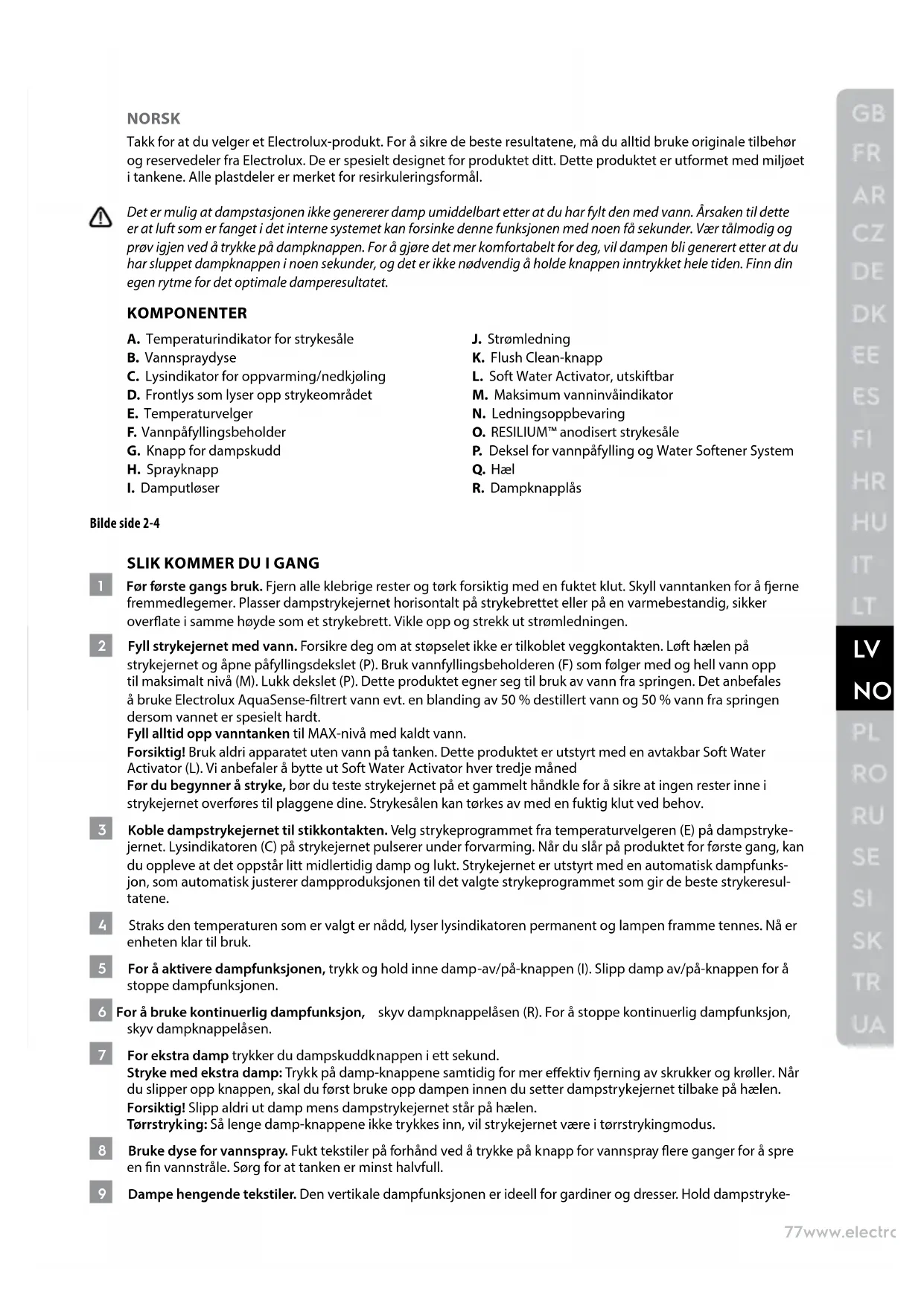 NORSK Takk for at du velger et Electrolux-produkt. For å sikre de beste resultatene, må du alltid bruke originale tilbehør og reservedeler fra Electrolux. De er spesielt designet for produktet ditt. Dette produktet er utformet med miljøet i tankene. Alle plastdeler er merket for resirkuleringsformål. Det er mulig at dampstasjonen ikke genererer damp umiddelbart etter at du har fylt den med vann. Årsaken til dette er at luft som er fanget i det interne systemet kan forsinke denne funksjonen med noen få sekunder. Vær tålmodig og prøv igjen ved å trykke på dampknappen. For å gjøre det mer komfortabelt for deg, vil dampen bli generert etter at du har sluppet dampknappen i noen sekunder, og det er ikke nødvendig å holde knappen inntrykket hele tiden. Finn din egen rytme for det optimale damperesultatet. KOMPONENTER A. Temperaturindikator for strykesåle B. Vannspraydyse C. Lysindikator for oppvarming/nedkjøling D. Frontlys som lyser opp strykeområdet E. Temperaturvelger F. Vannpåfyllingsbeholder G. Knapp for dampskudd H. Sprayknapp